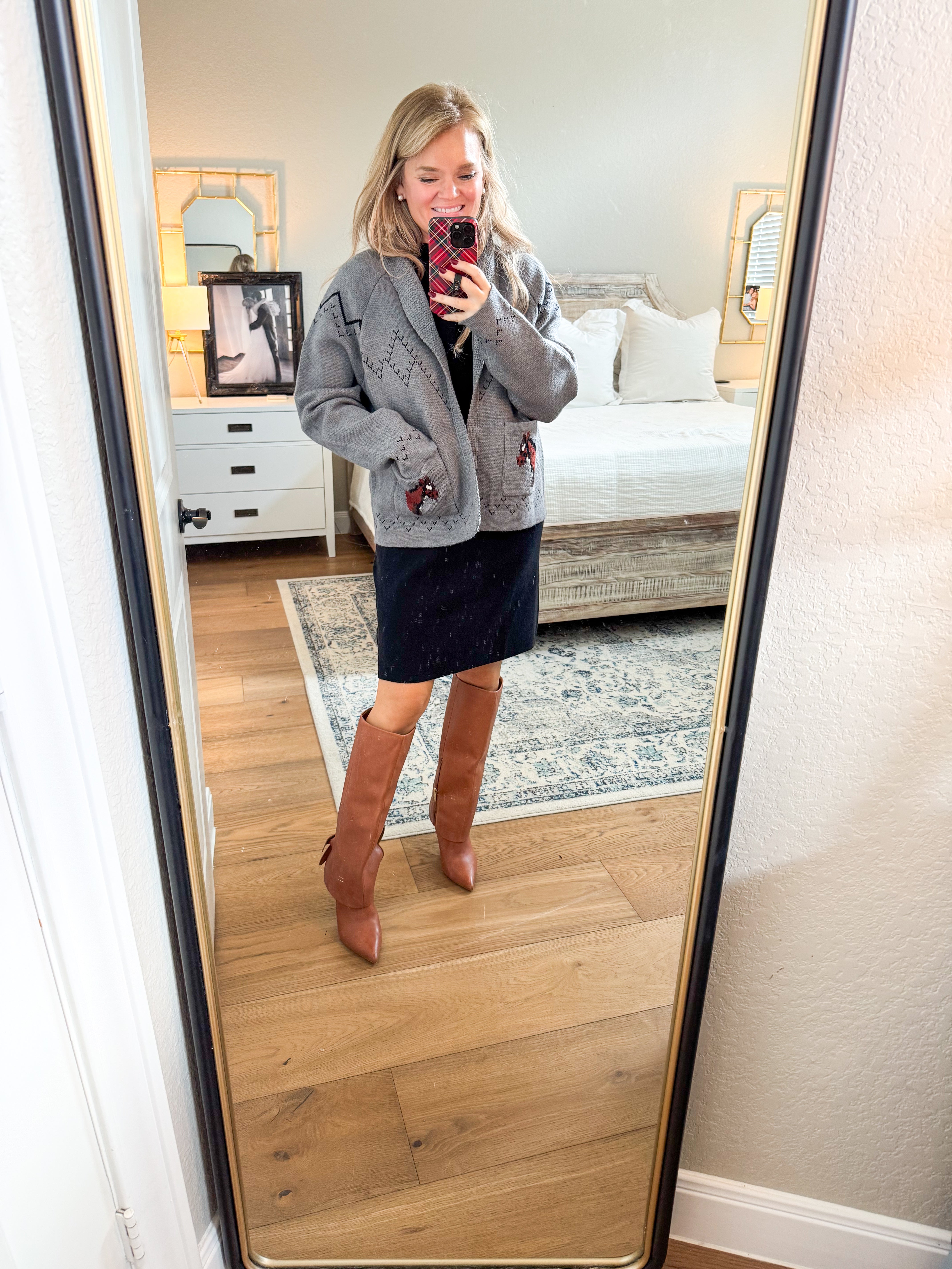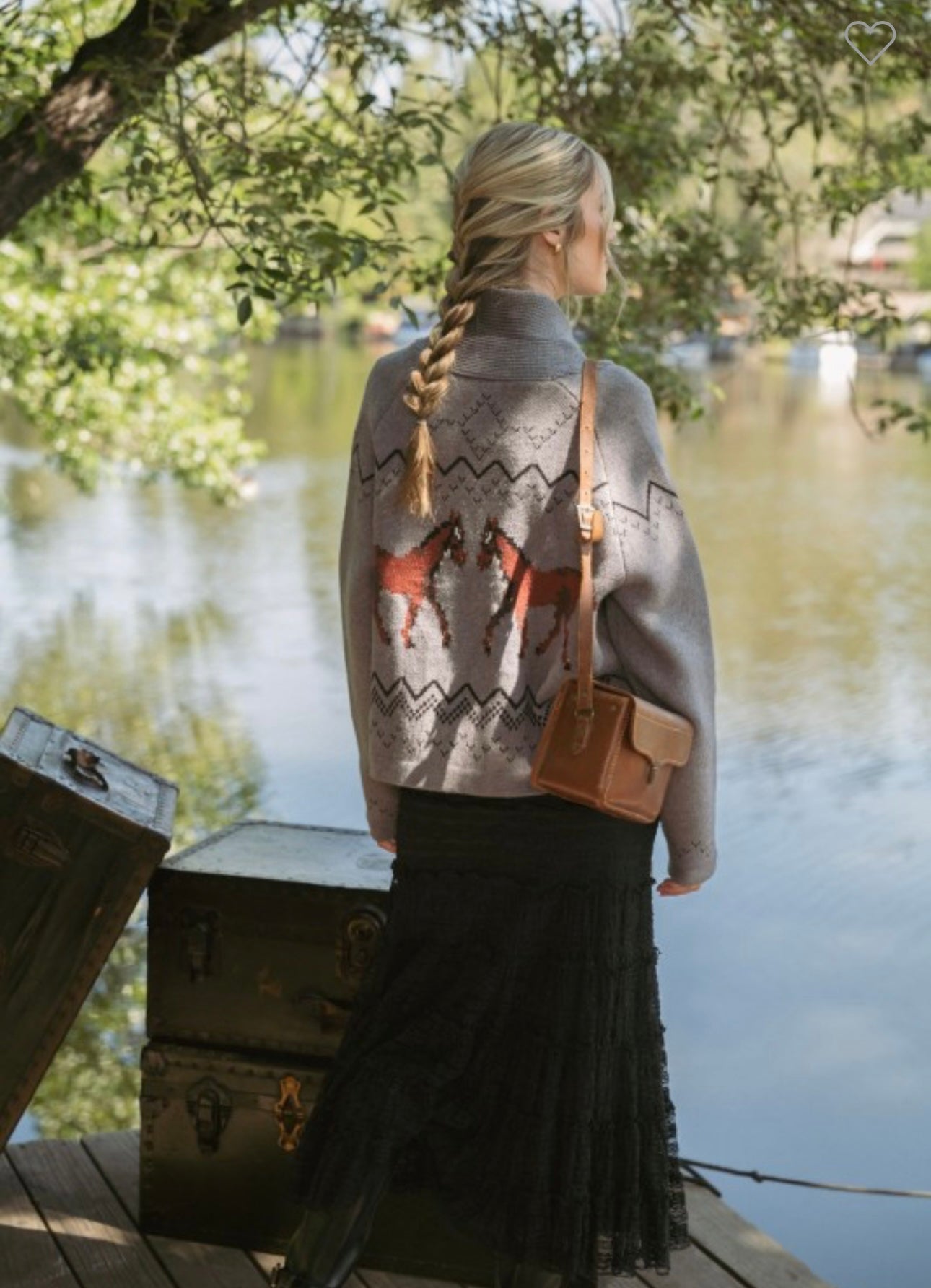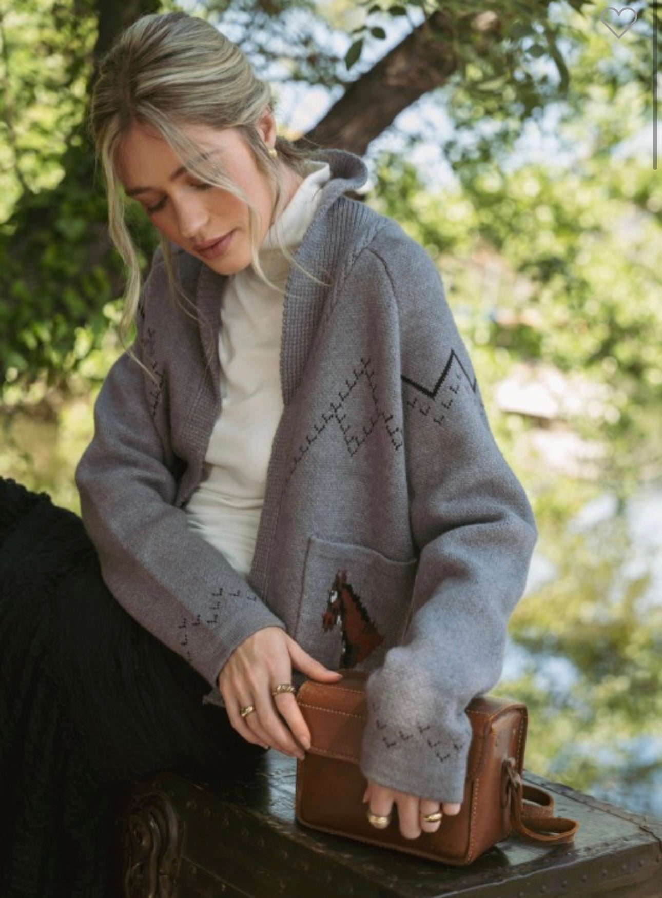 Horse knit sweater cardigan with shawl collar and open front. Raglan seam with long sleeves. 43% viscose, 35% nylon, 22% polyester. True to size, I am a 6 wearing a medium.