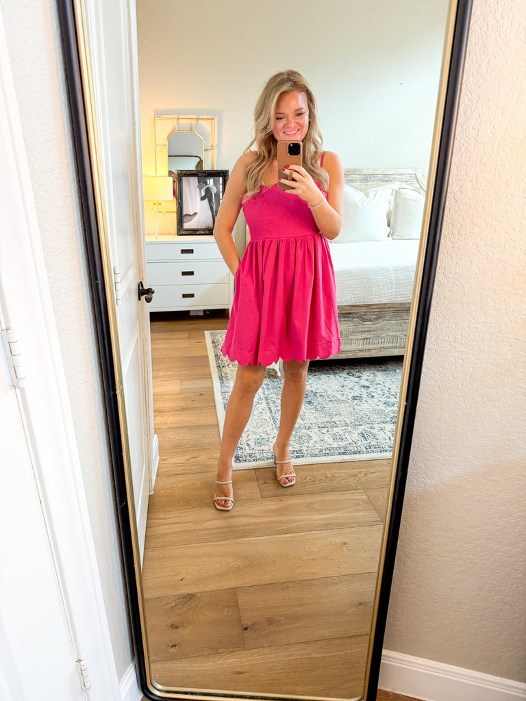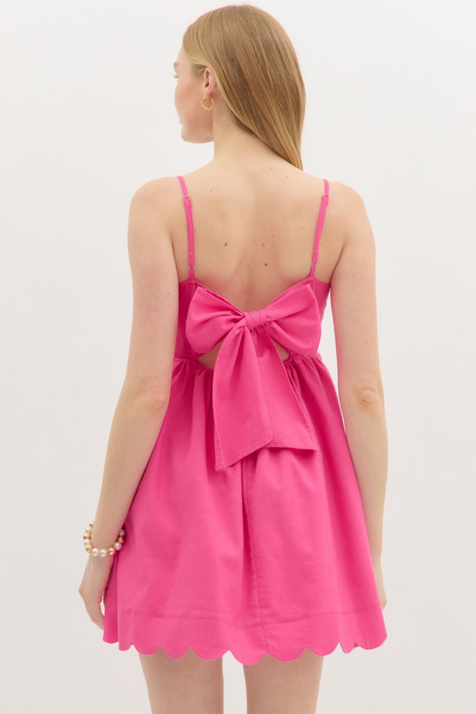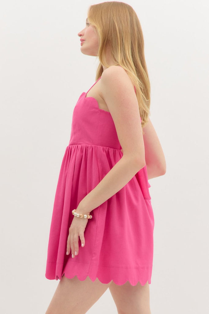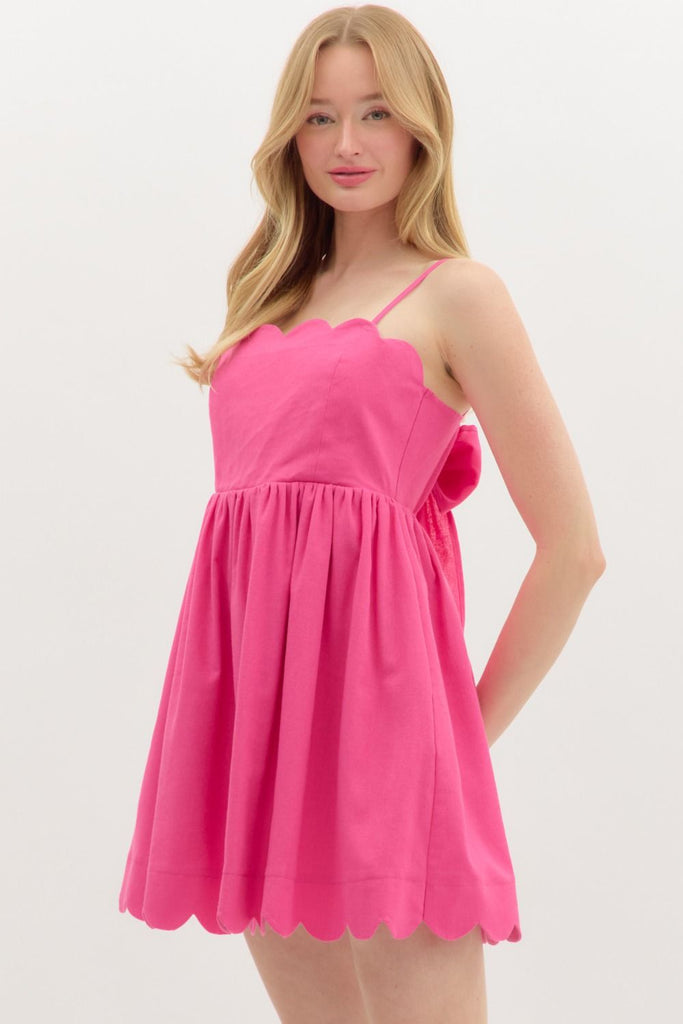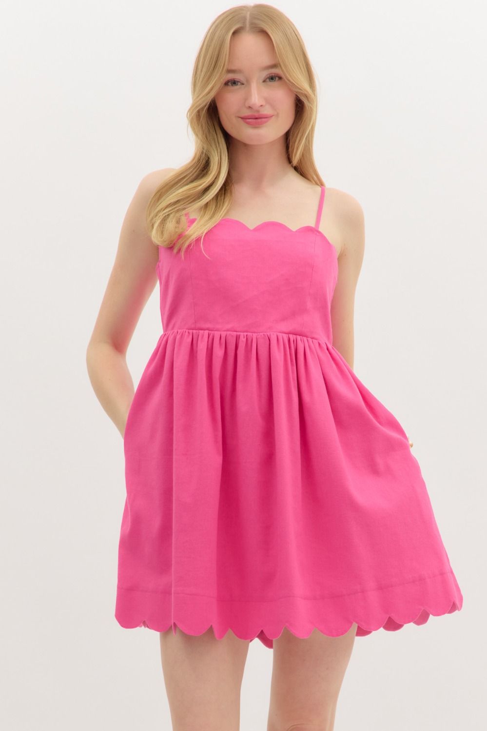 Solid adjustable shoulder strap pullover dress featuring scallop accent neck and hem finish. Elasticated skirt waist and bow tie closure at back. Pockets at sides, lined, woven, non-sheer, lightweight. 40% linen, 40% viscose, 10% poly, 10% cotton. True to size, I am a 6 wearing a medium.