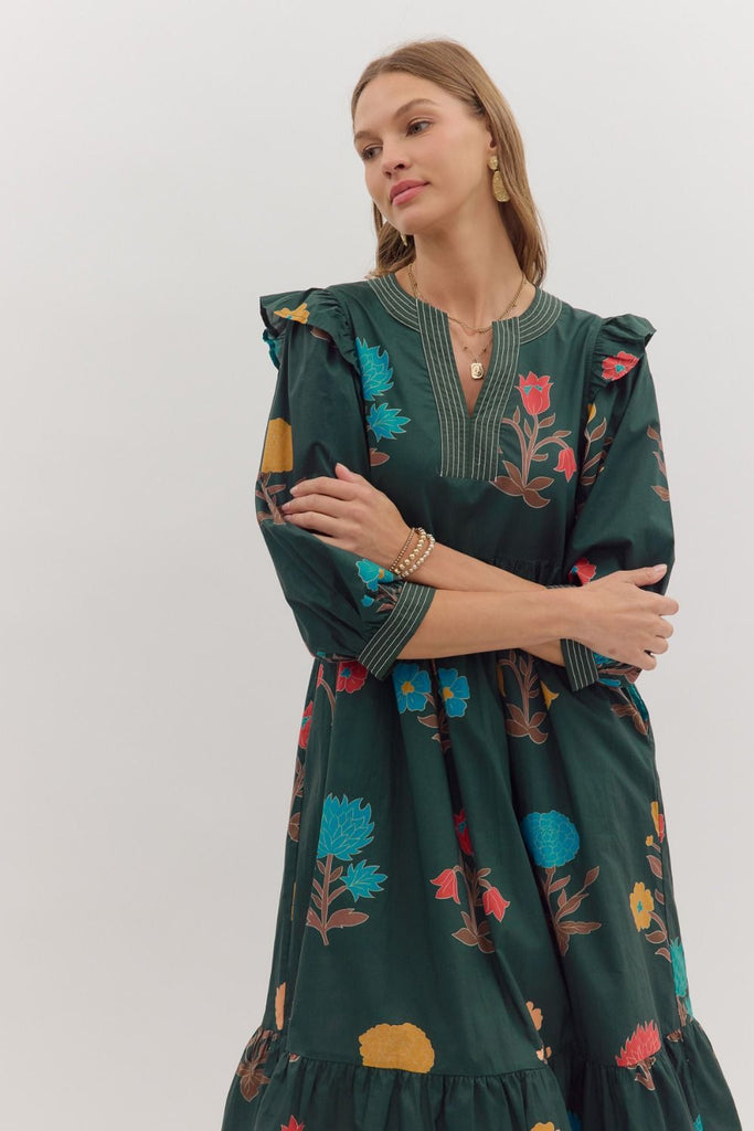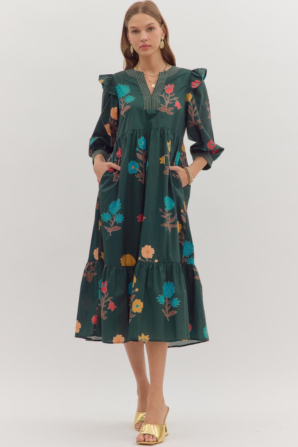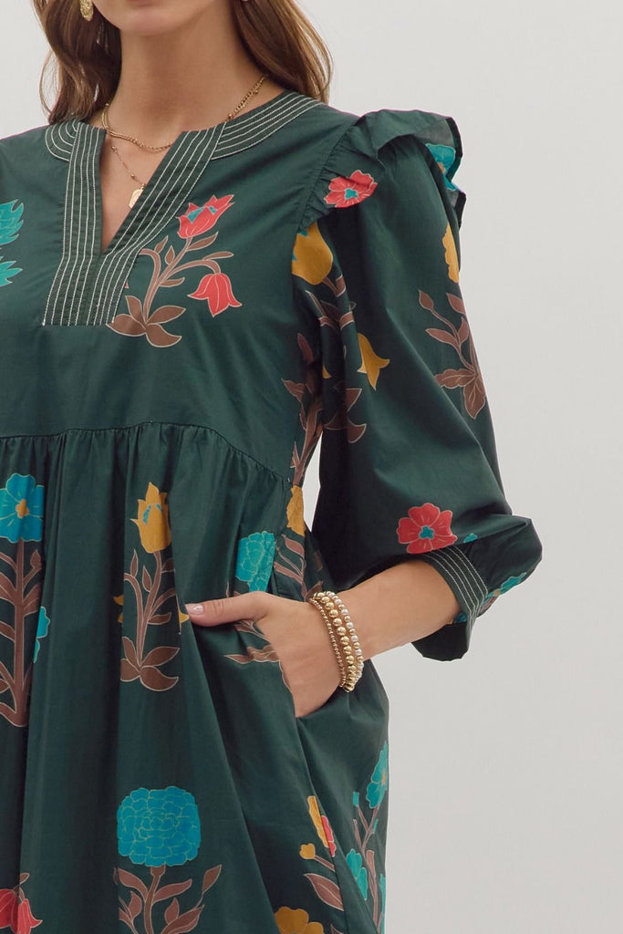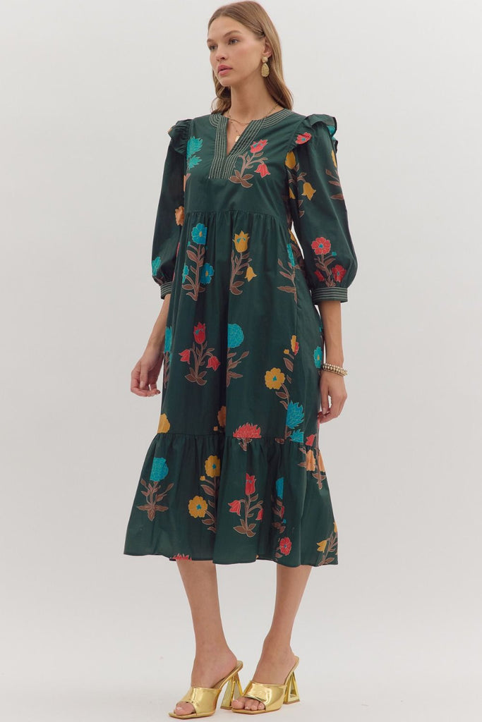 True to size, I am a 6/8 wearing a medium. 100% cotton floral print ¾ sleeve midi dress featuring v-neck with contrast stitch detail and ruffle shoulder accents. Side pockets, ruffle hem, lined, woven, non-sheer, lightweight.