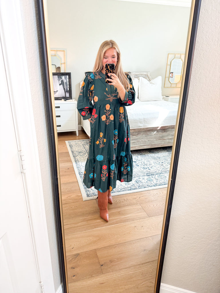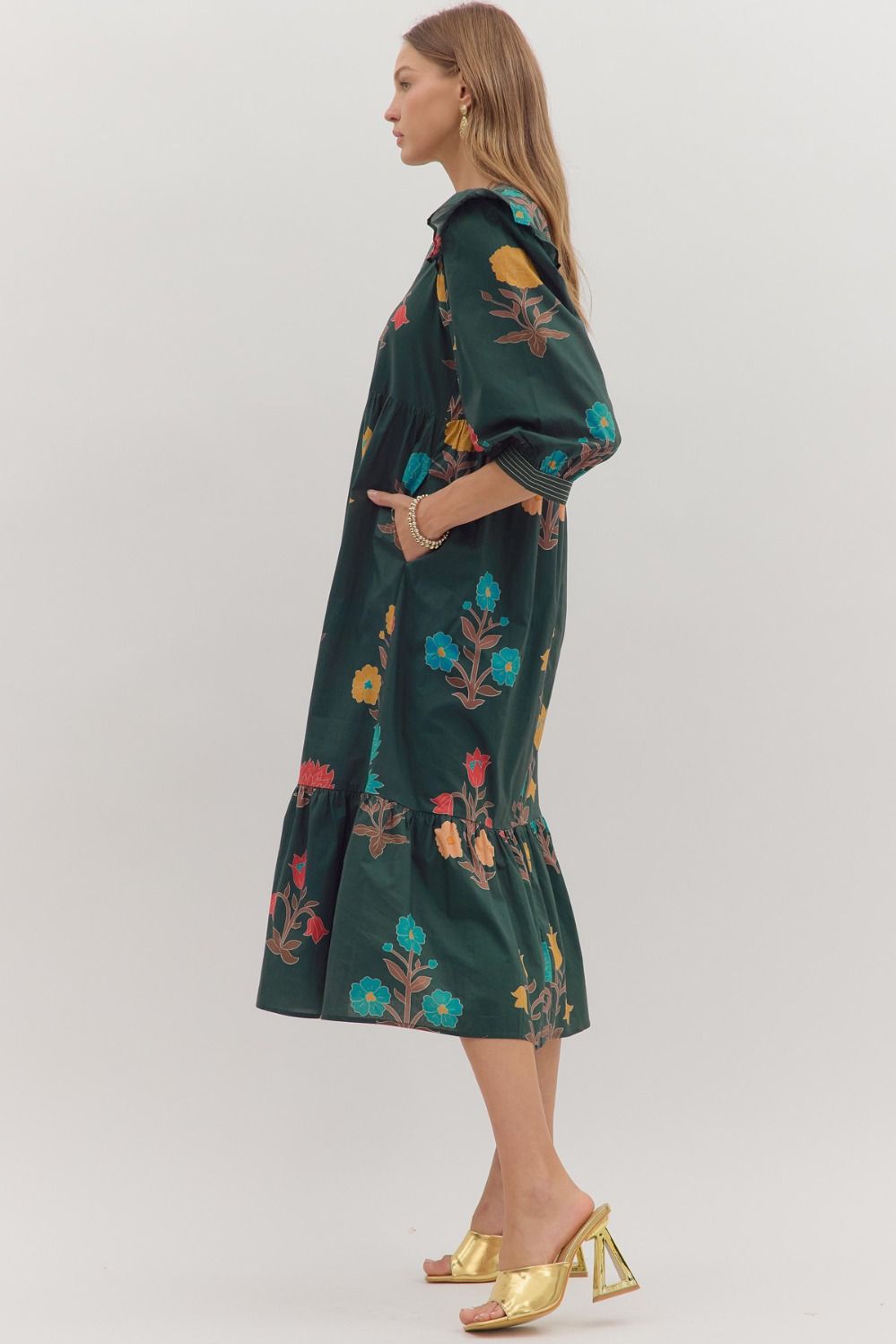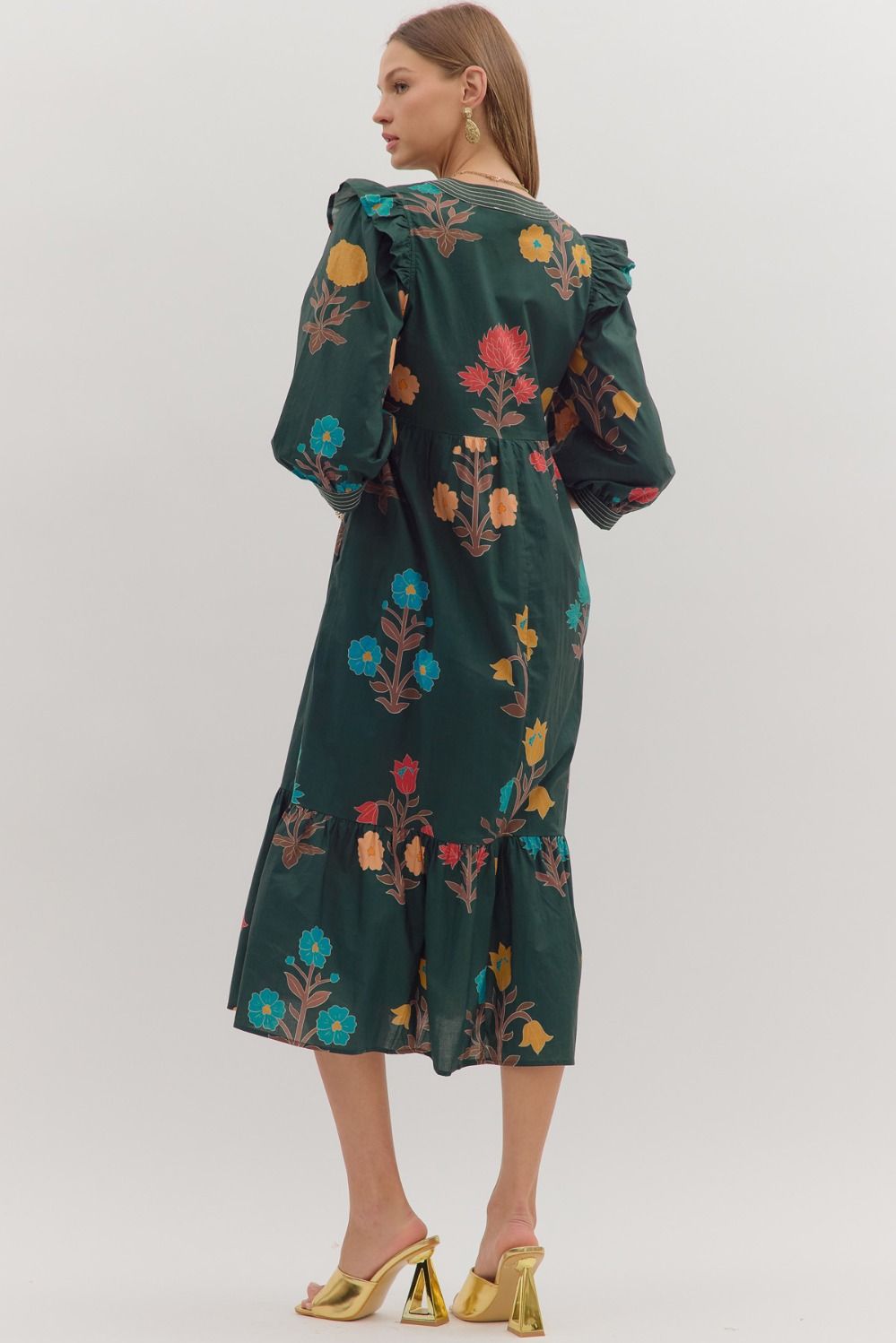 True to size, I am a 6/8 wearing a medium. 100% cotton floral print ¾ sleeve midi dress featuring v-neck with contrast stitch detail and ruffle shoulder accents. Side pockets, ruffle hem, lined, woven, non-sheer, lightweight.