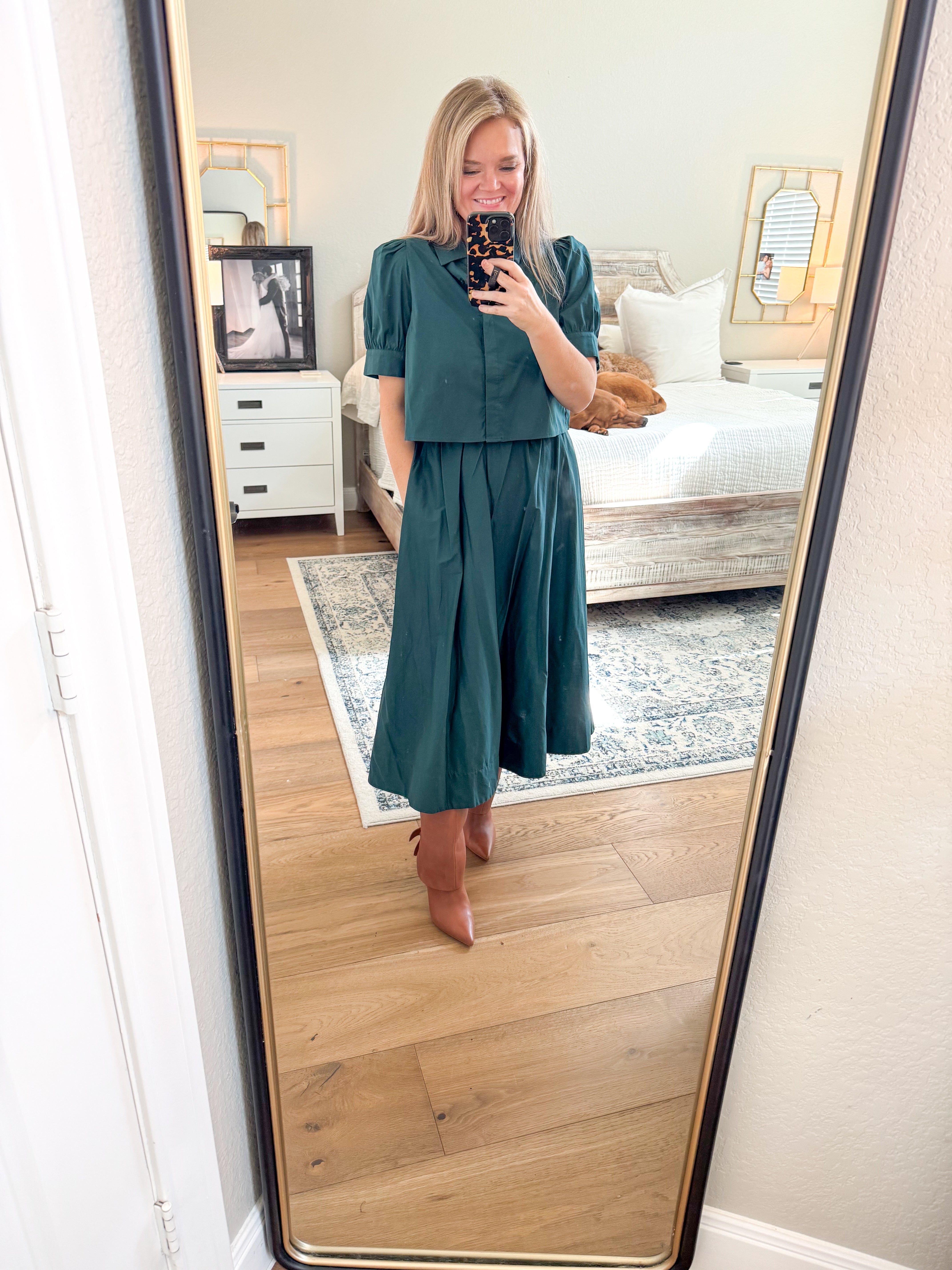 True to size, I am a 6/8 wearing small. Solid cuff band short sleeve collar button closure top. Unlined, woven, non-sheer, lightweight. Matching skirt sold separately. 70% cotton, 27% nylon, 3% spandex.
