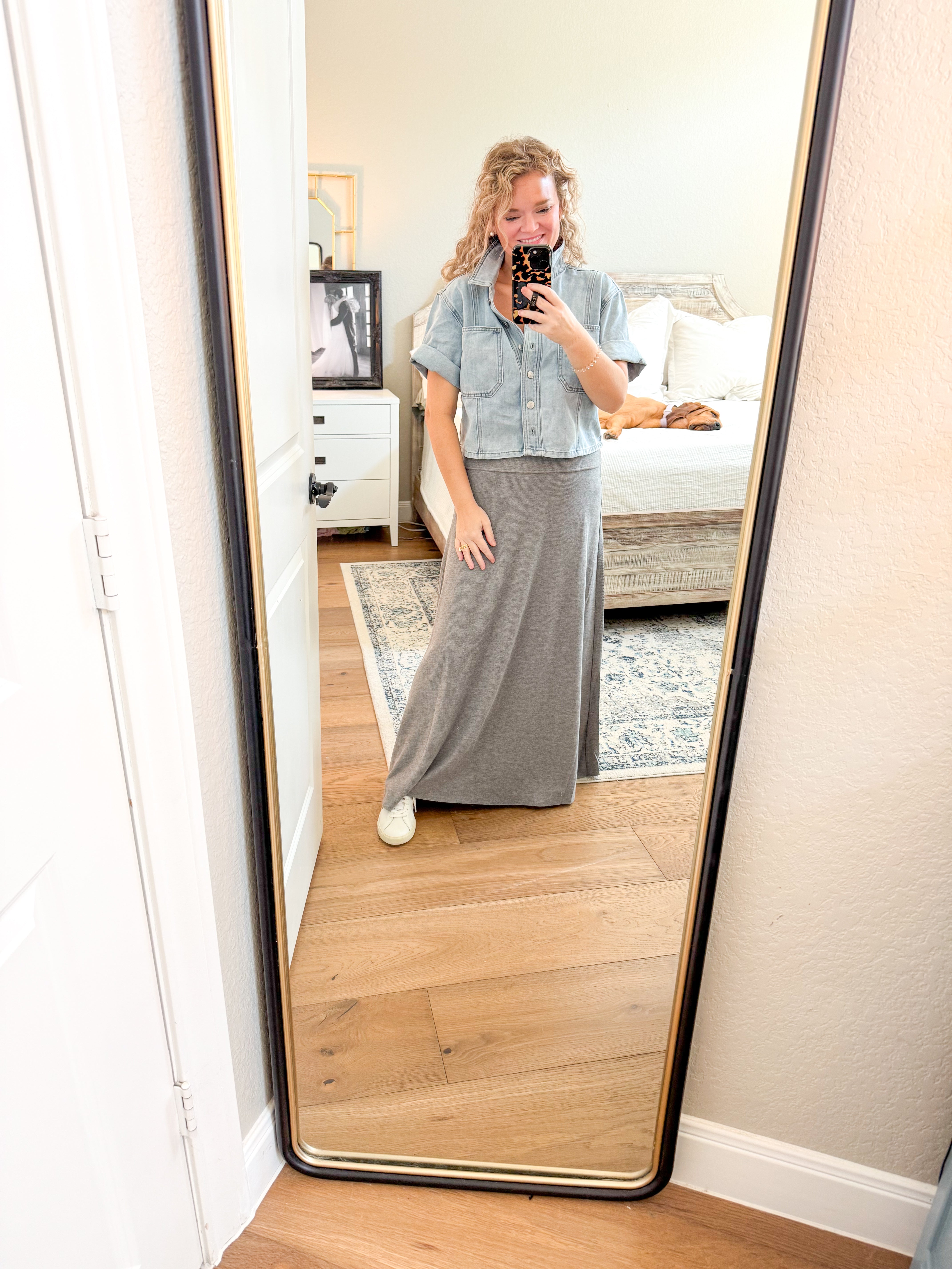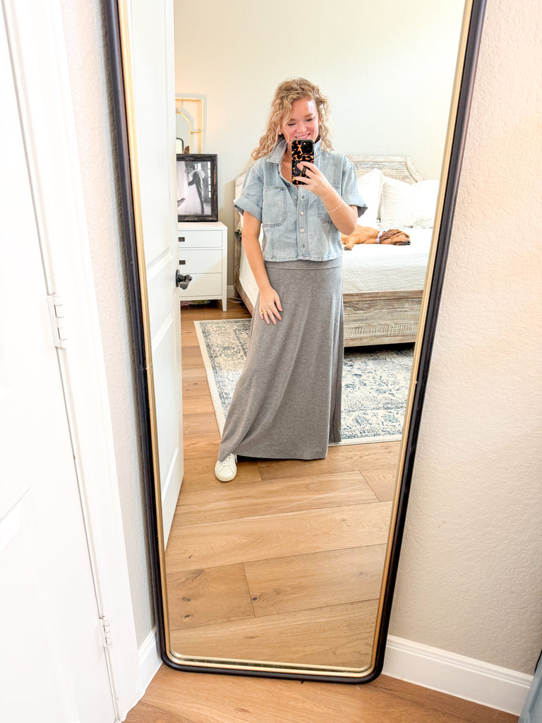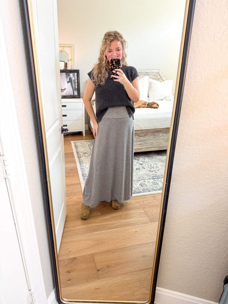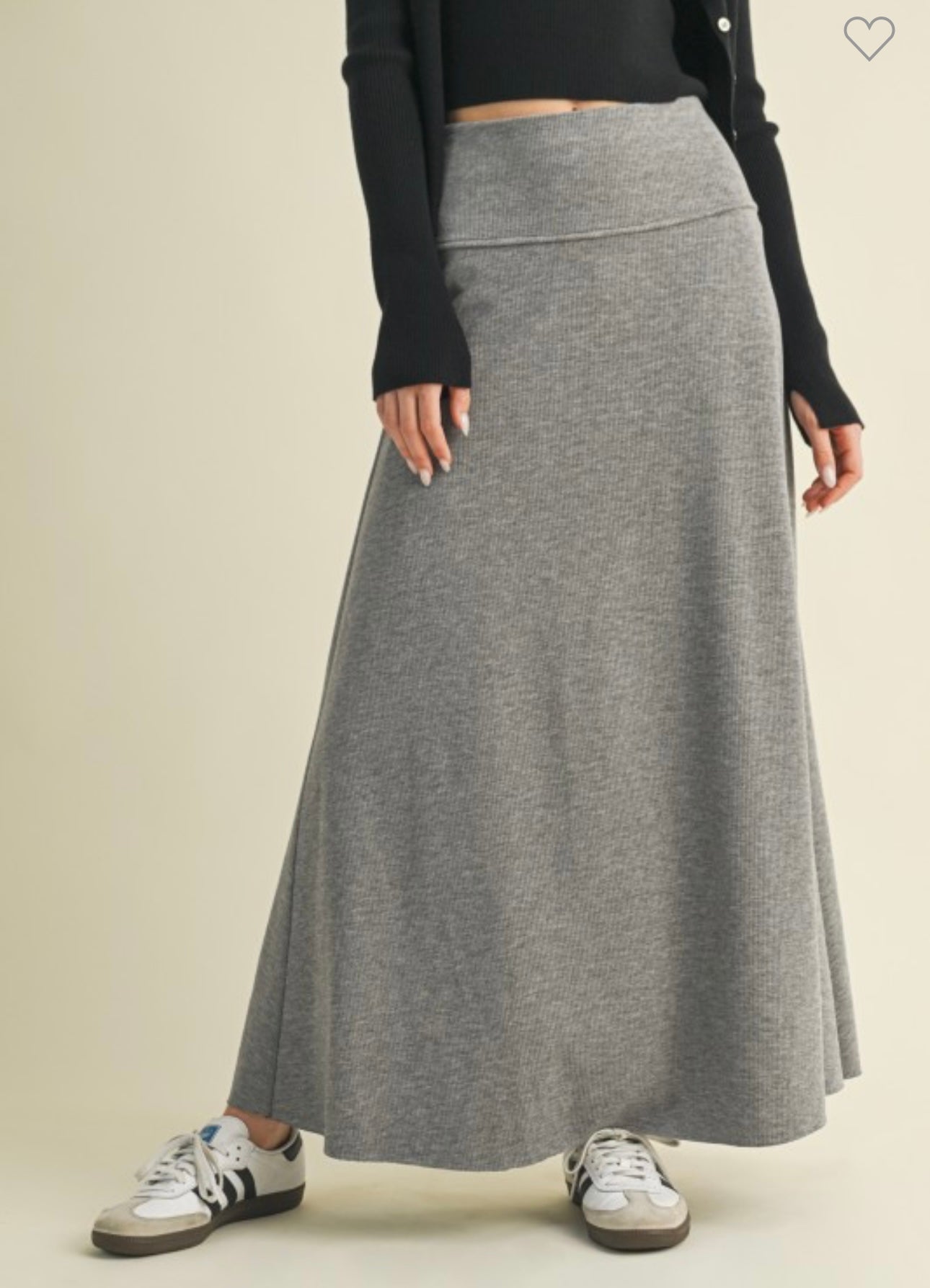 True to size, I am a 6 wearing a medium. Brushed rib maxi skirt. 55% rayon, 24% polyester, 17% nylon, 4% spandex.