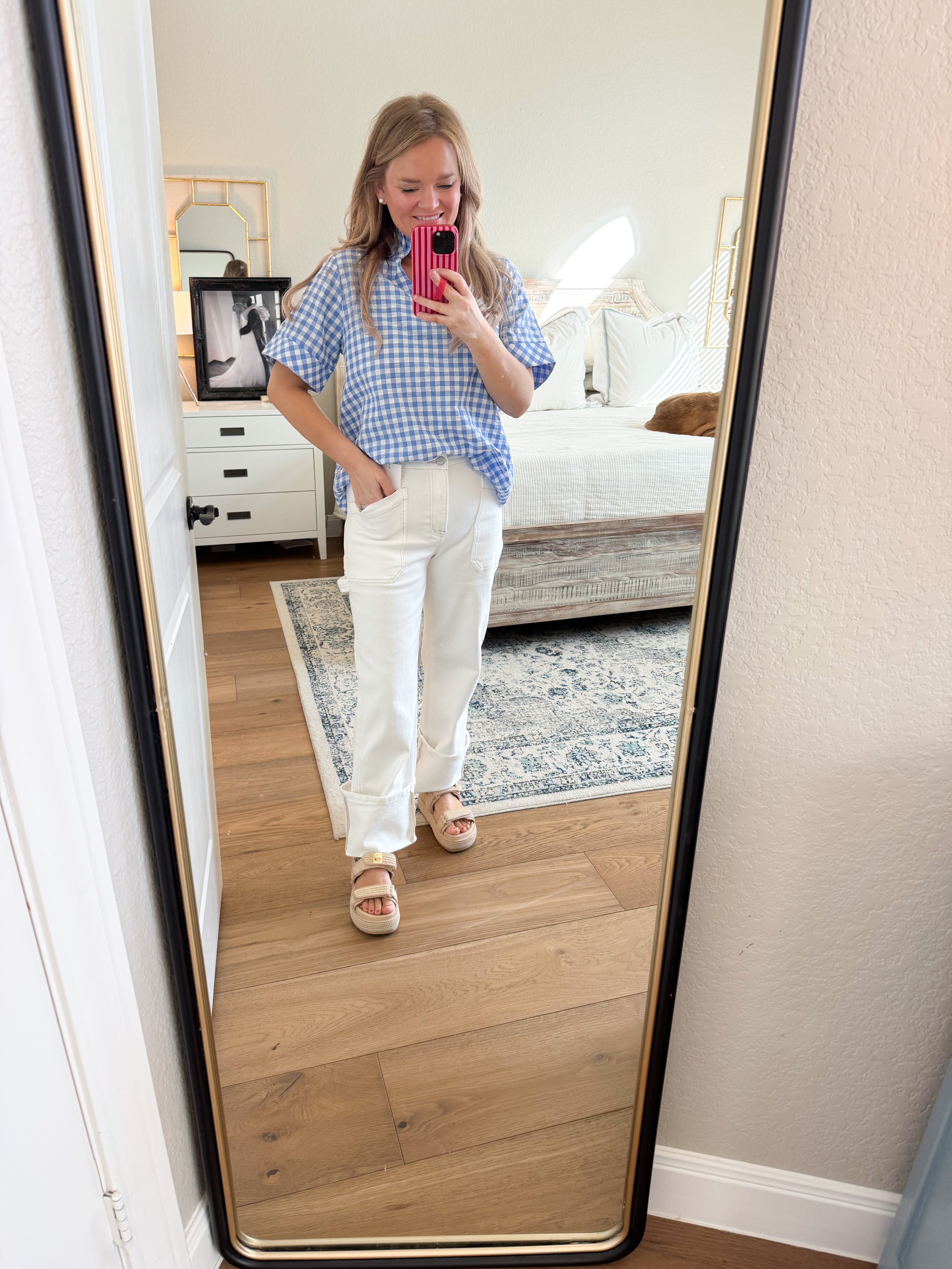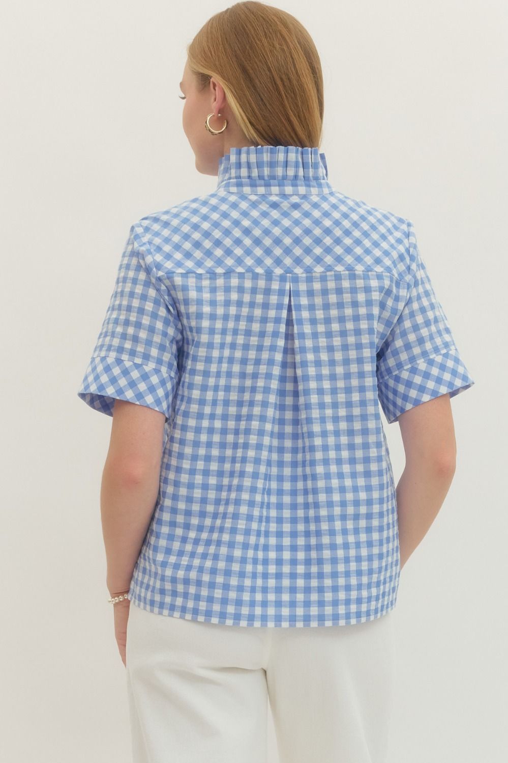 100% cotton Gingham short sleeve top featuring stand collar V-neck. Unlined. Woven. Non-sheer. Lightweight. True to size, I am a 6/8 wearing a small.