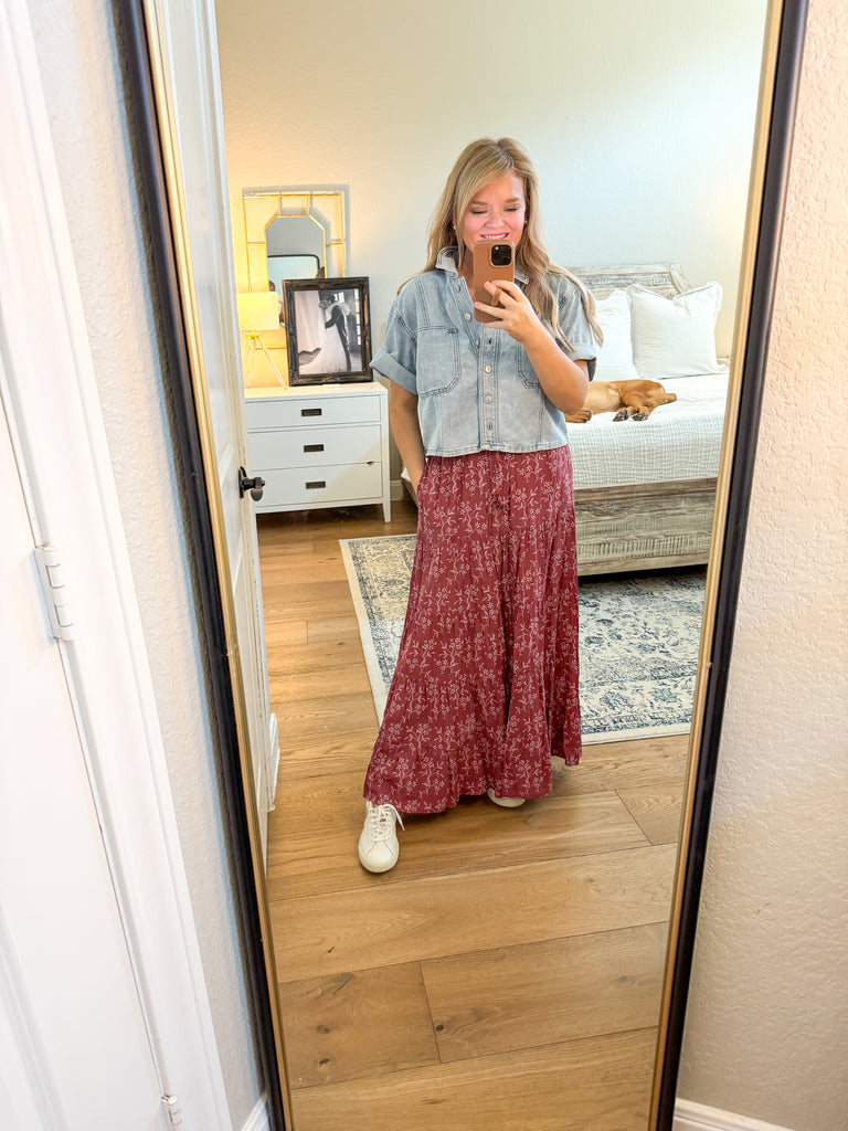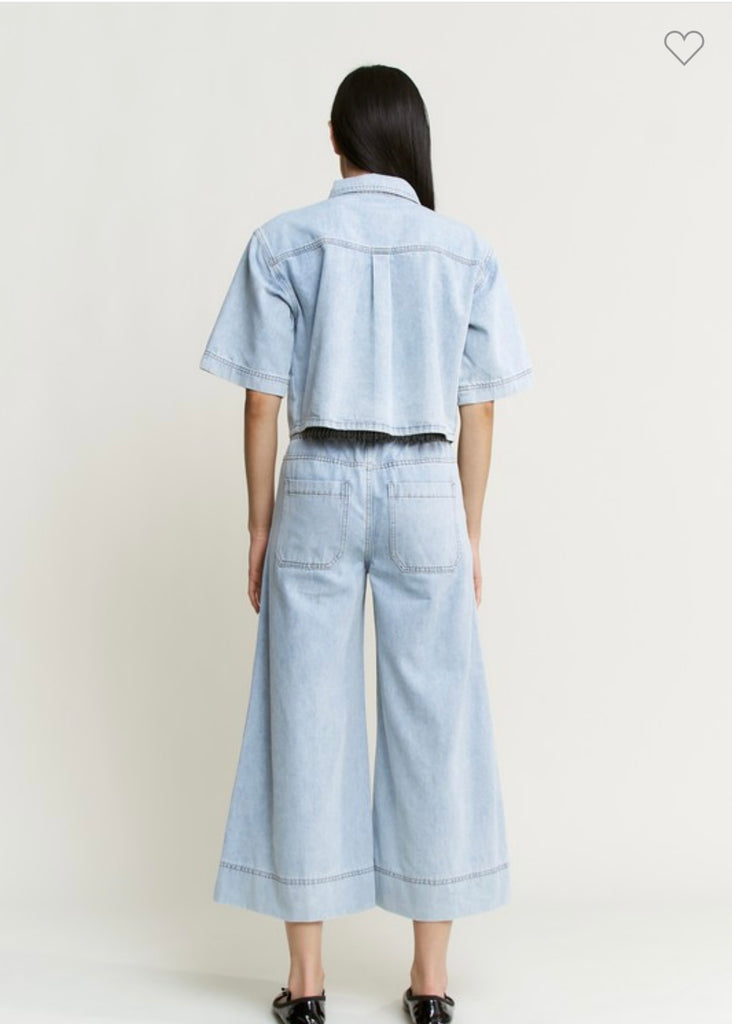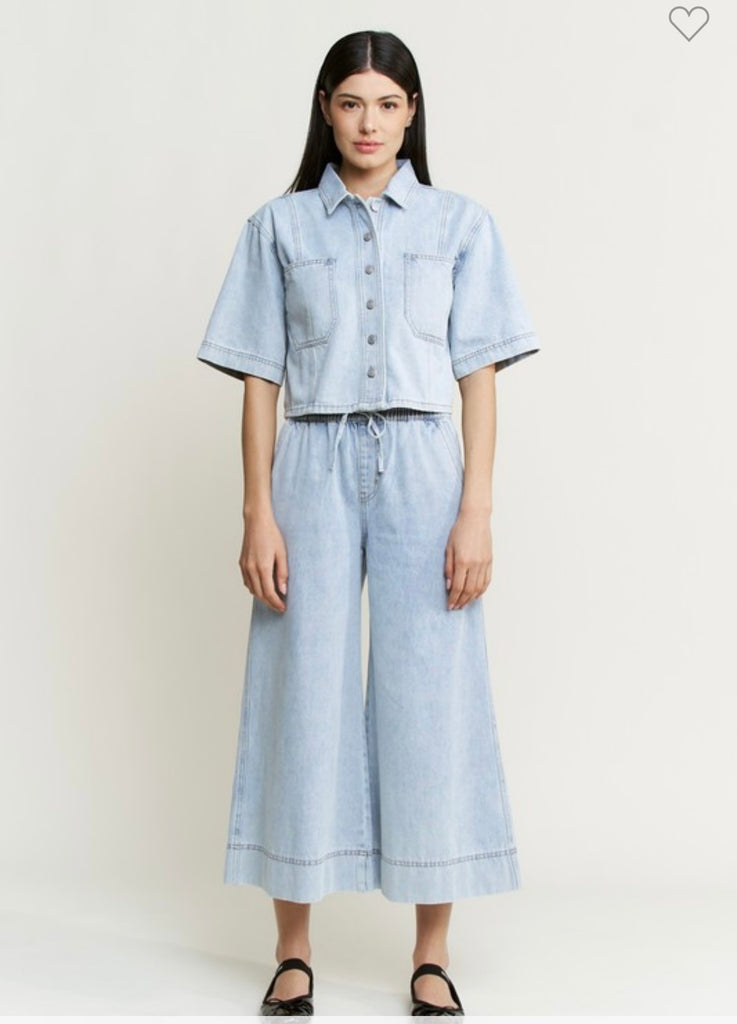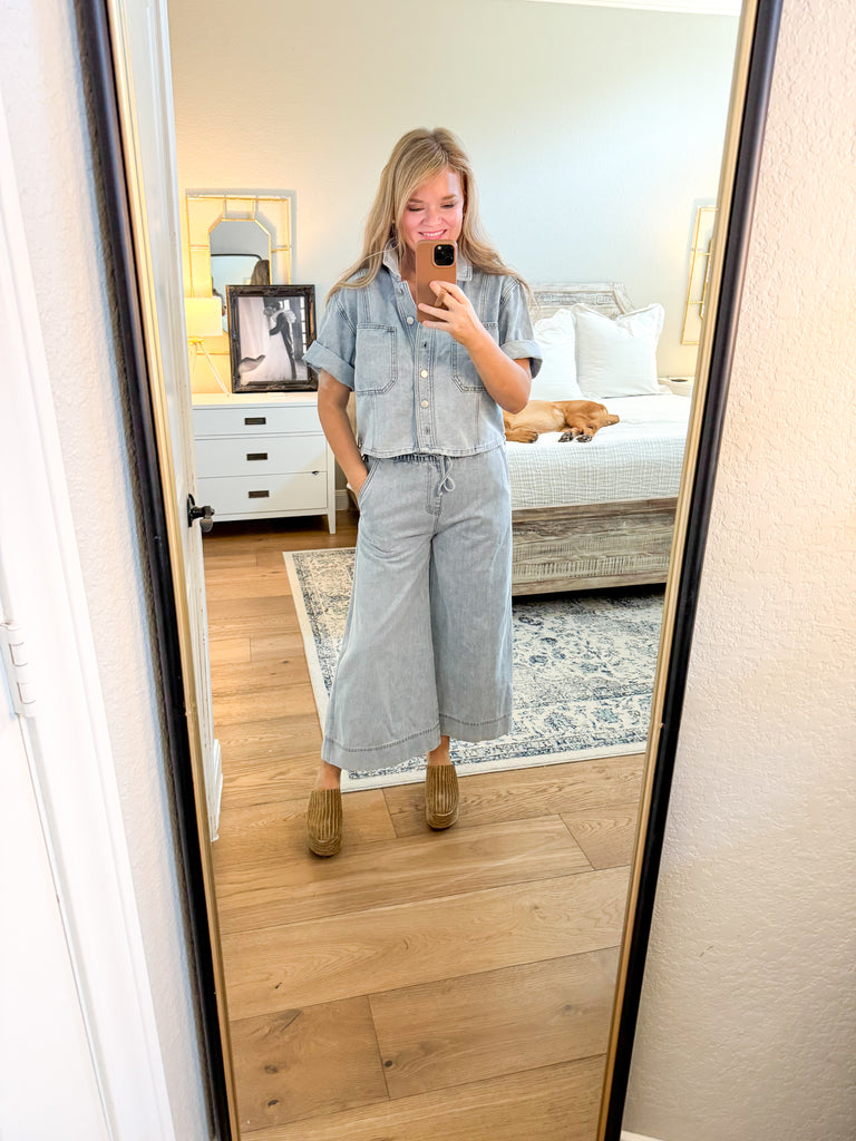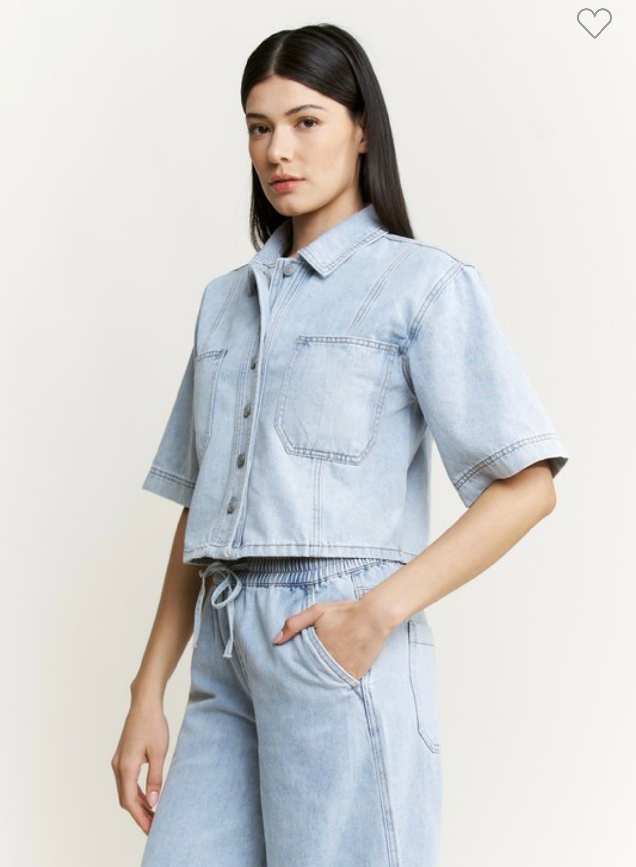 74% cotton, 26% polyester denim shirt. Matching bottoms sold separately. True to size, I am a 6 wearing a medium.
