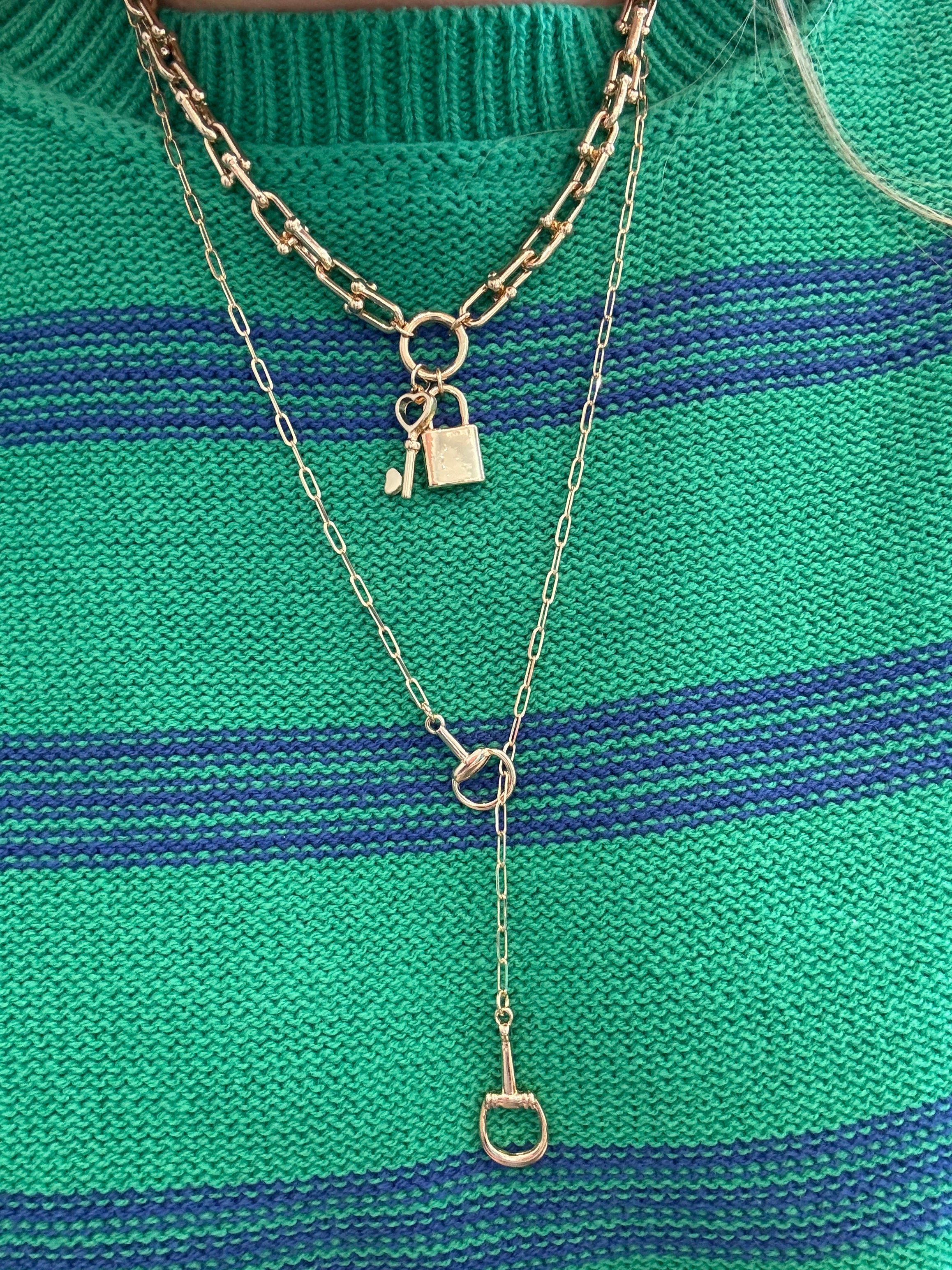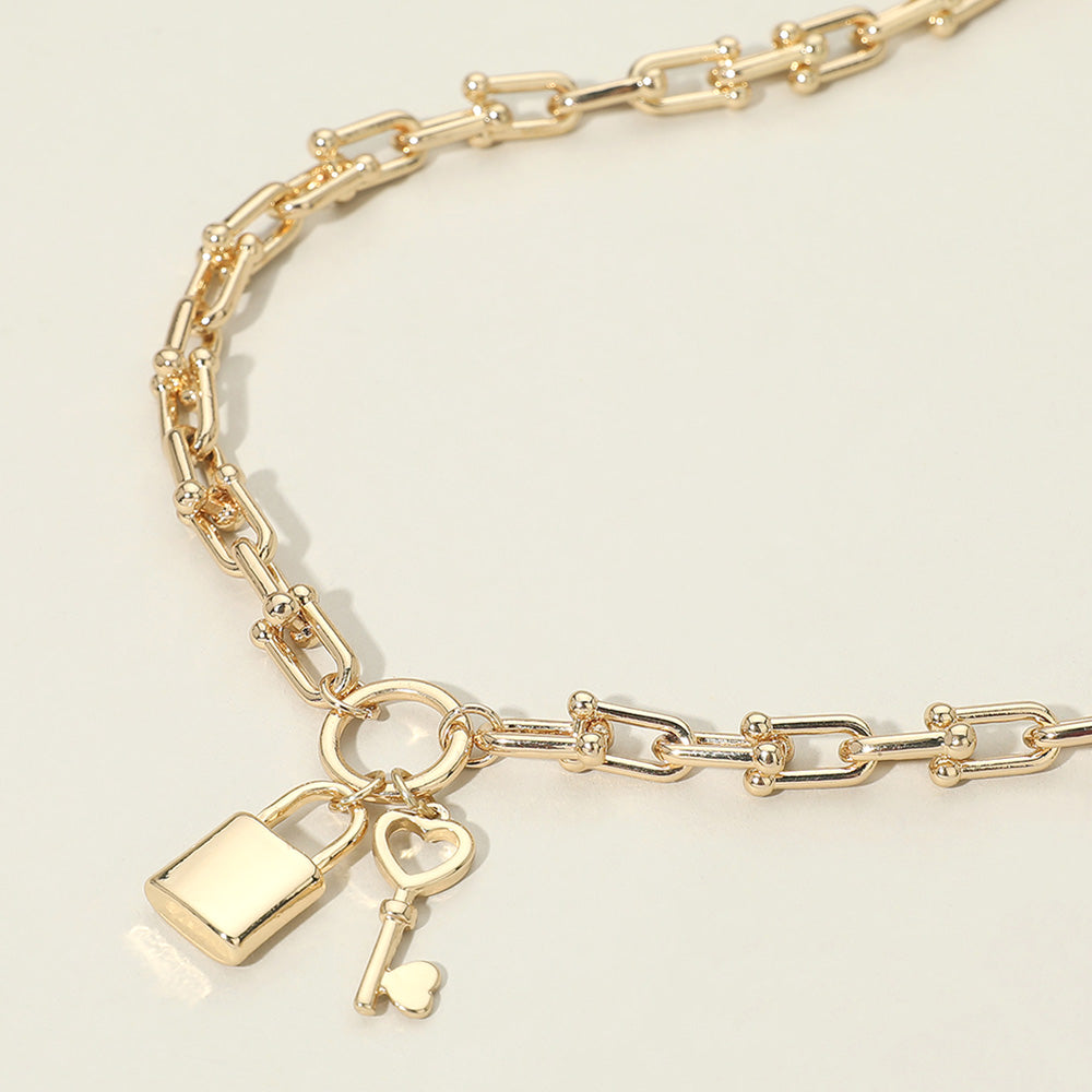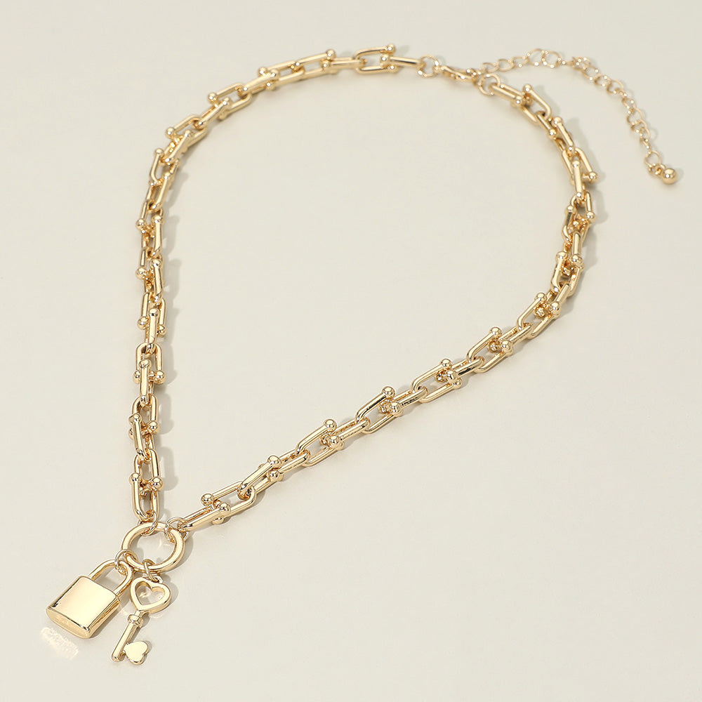 • This lock and key charm chain necklace features a bold linked design accented with symbolic lock and heart key charms for a modern, meaningful look. Designed for effortless layering or standalone wear, it adds statement appeal to everyday outfits, gift assortments, and boutique jewelry collections.