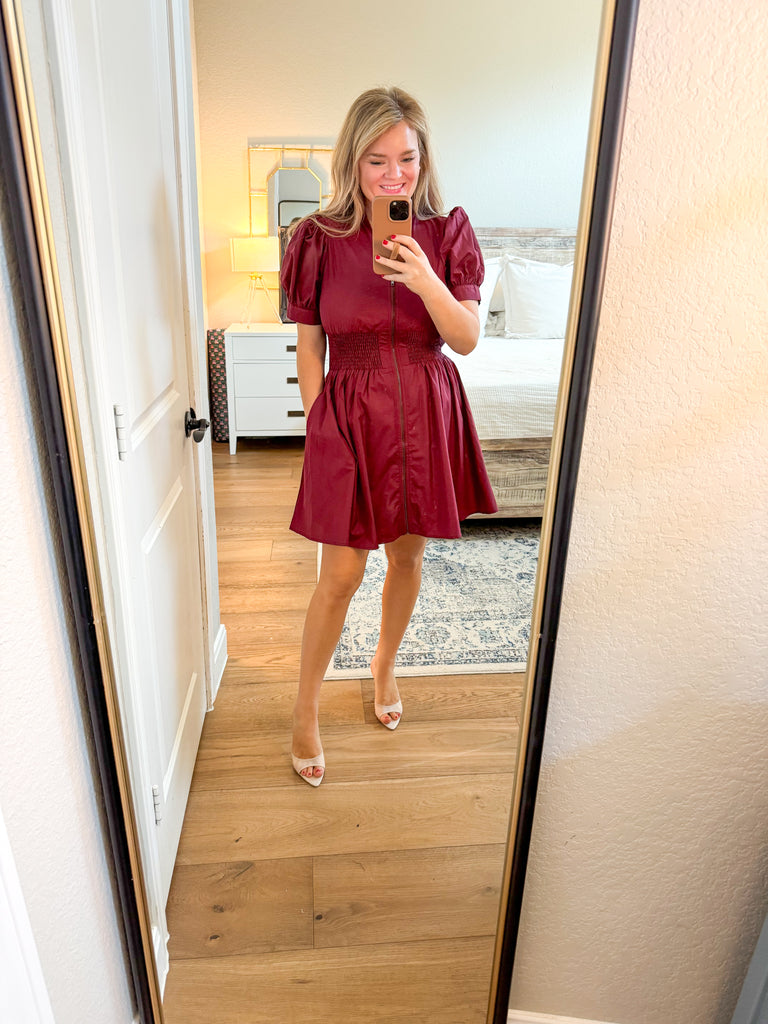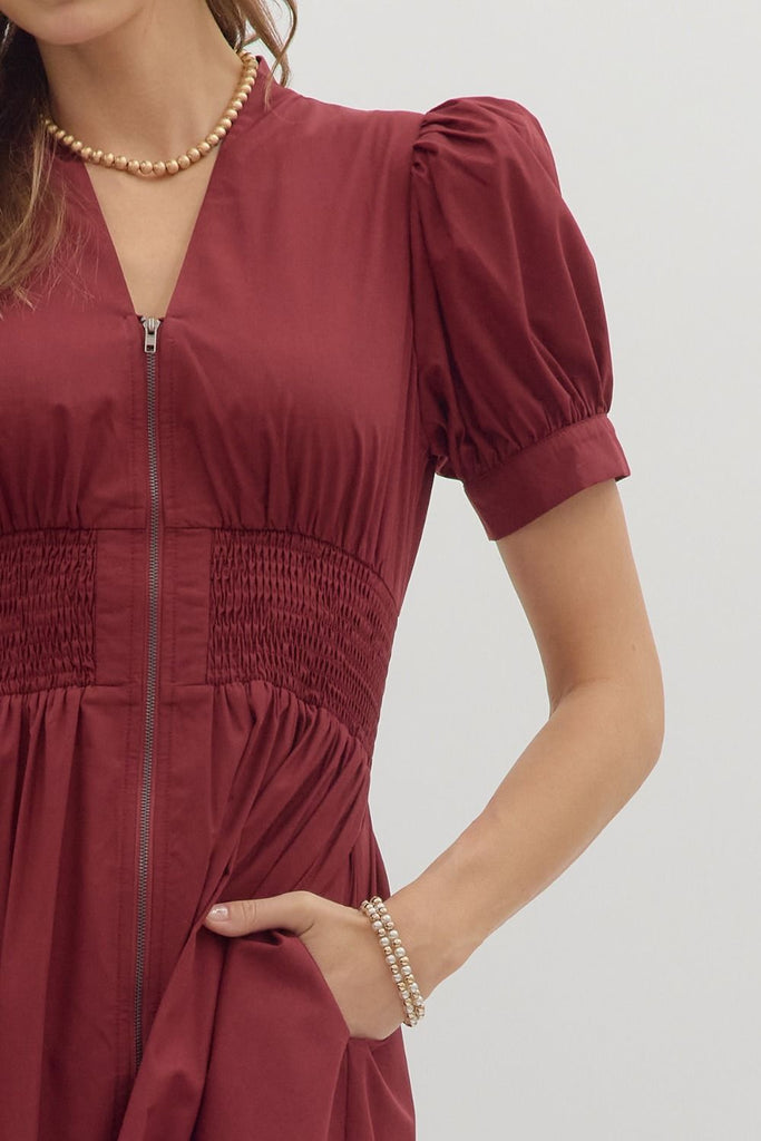 Solid short puff sleeve v-neck dress featuring smocked waist front zip vclosure. Pockets at sides. Lined, woven, non-sheer, lightweight. 65% polyester, 35% cotton. True to size, I am a size 6/8 wearing a medium.
