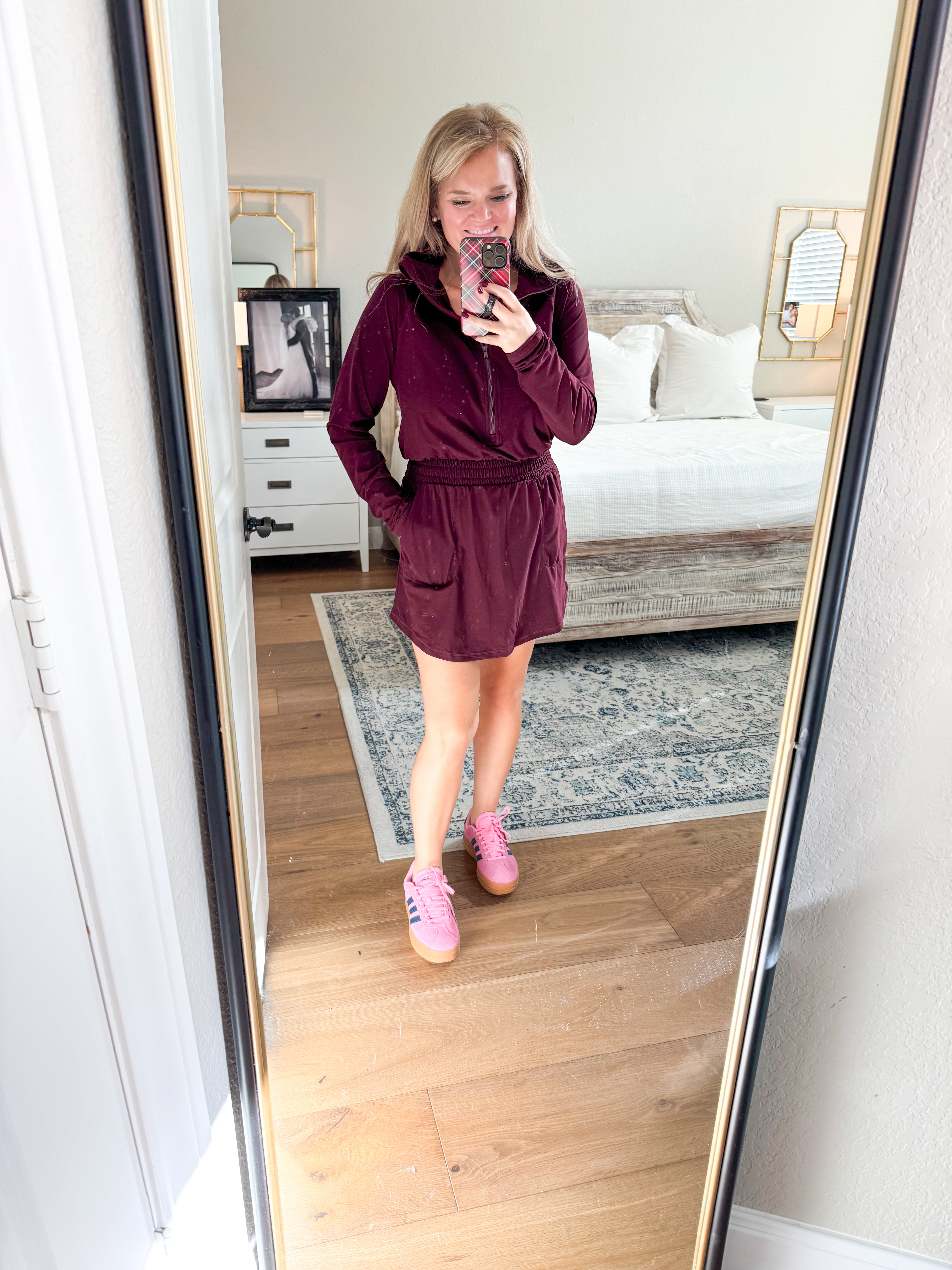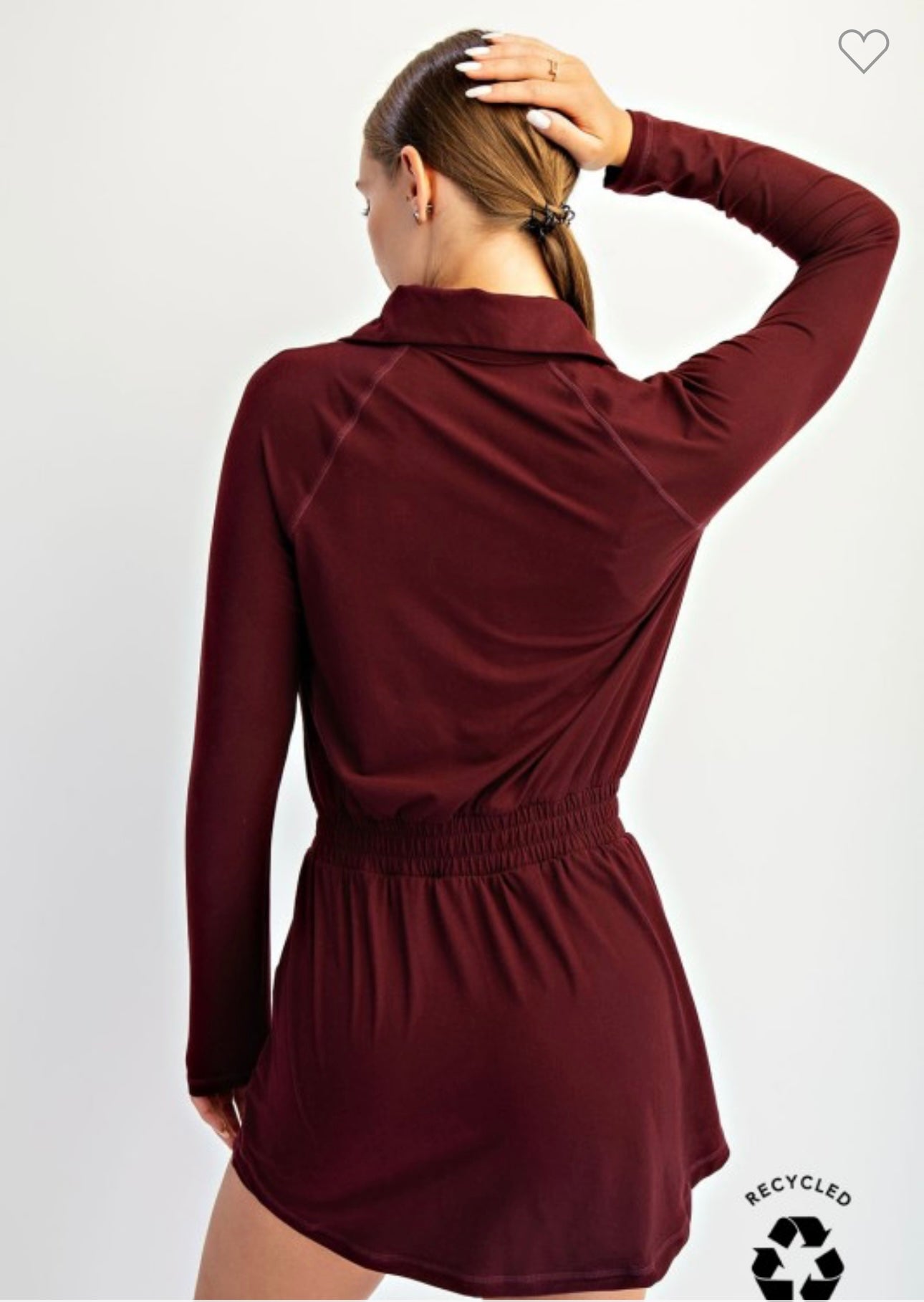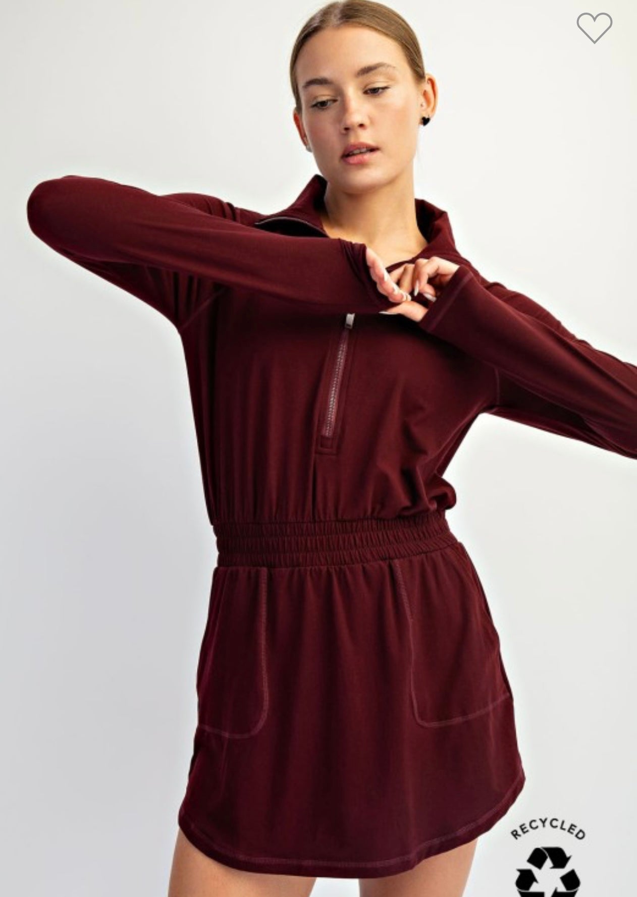 Butter soft quarter zip romper skirt. Long sleeve, dropped shoulder, mock neck, quarter zipper closure, dress with built-in shorts. Elastic waistband with side pockets. 84% recycled polyester microfiber, 16% spandex. True to size, I am a 6/8 wearing a medium.