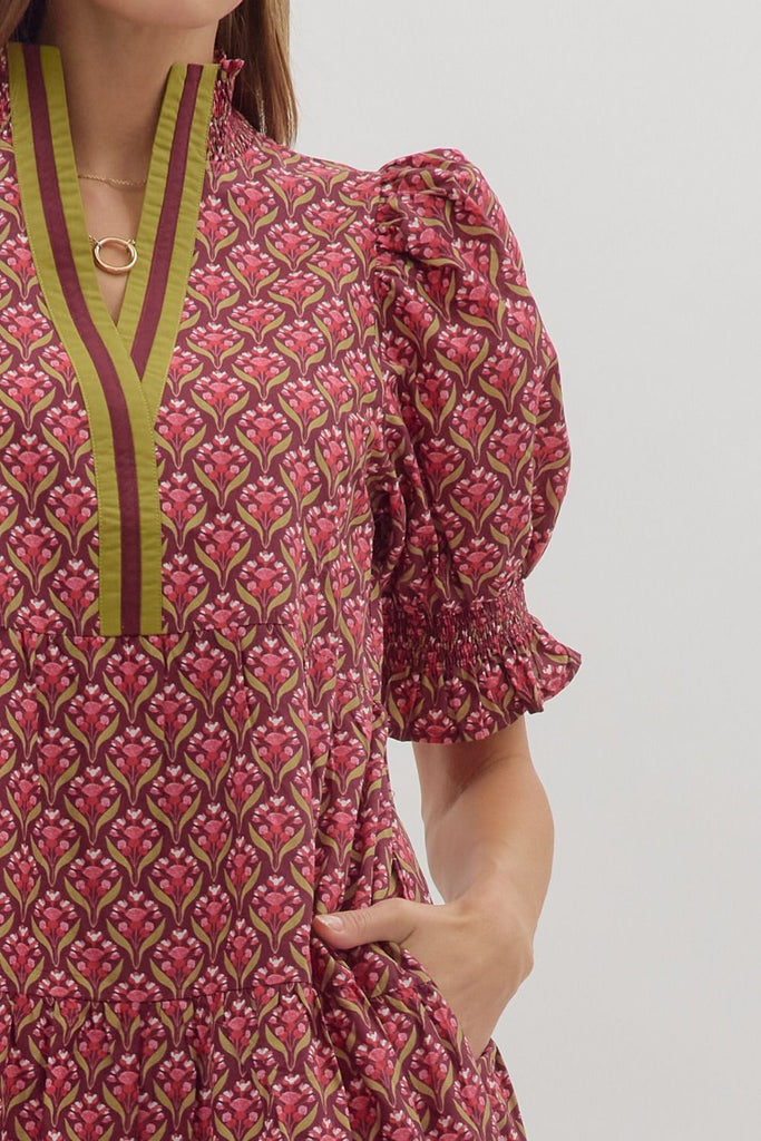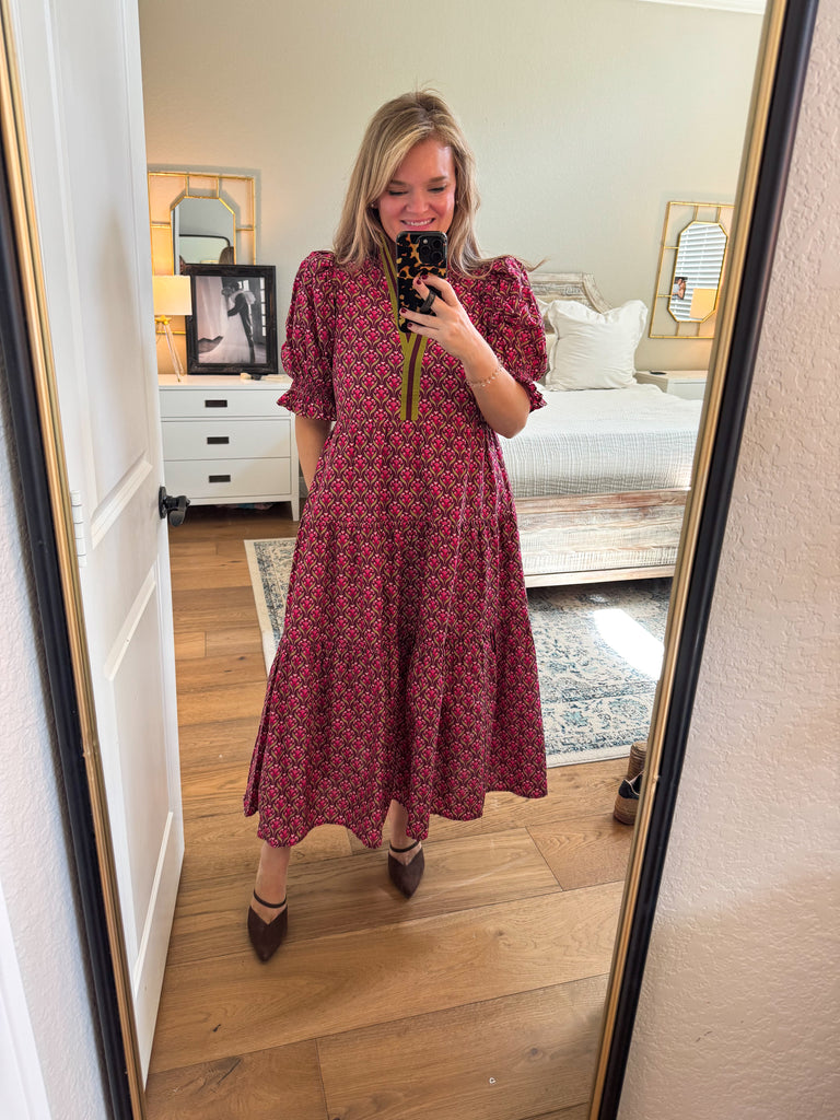 True to size, I am a 6/8 wearing a medium. 100% cotton botanical puff sleeve midi dress featuring contrast trim split neckline. Smocked cuffs, smocked collar, side pockets. Lined, woven, non-sheer, lightweight.