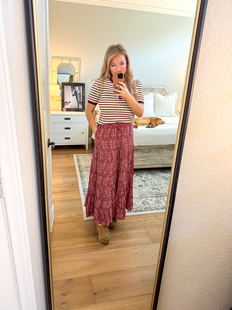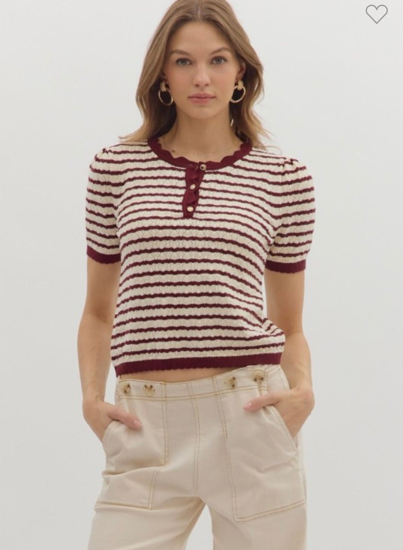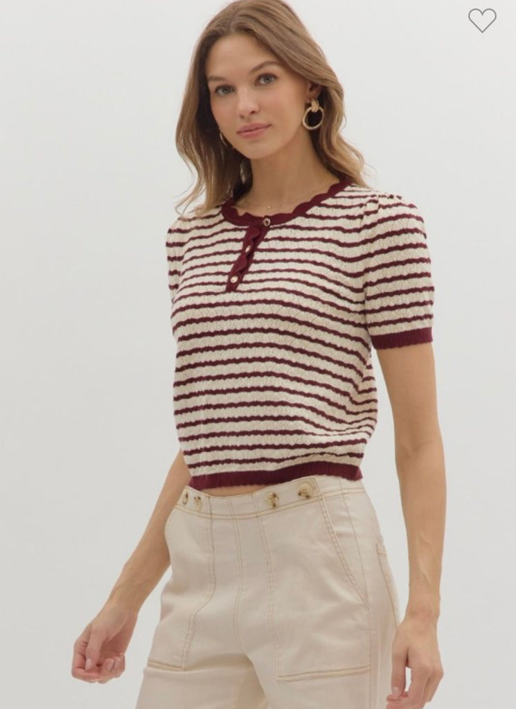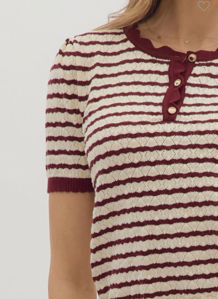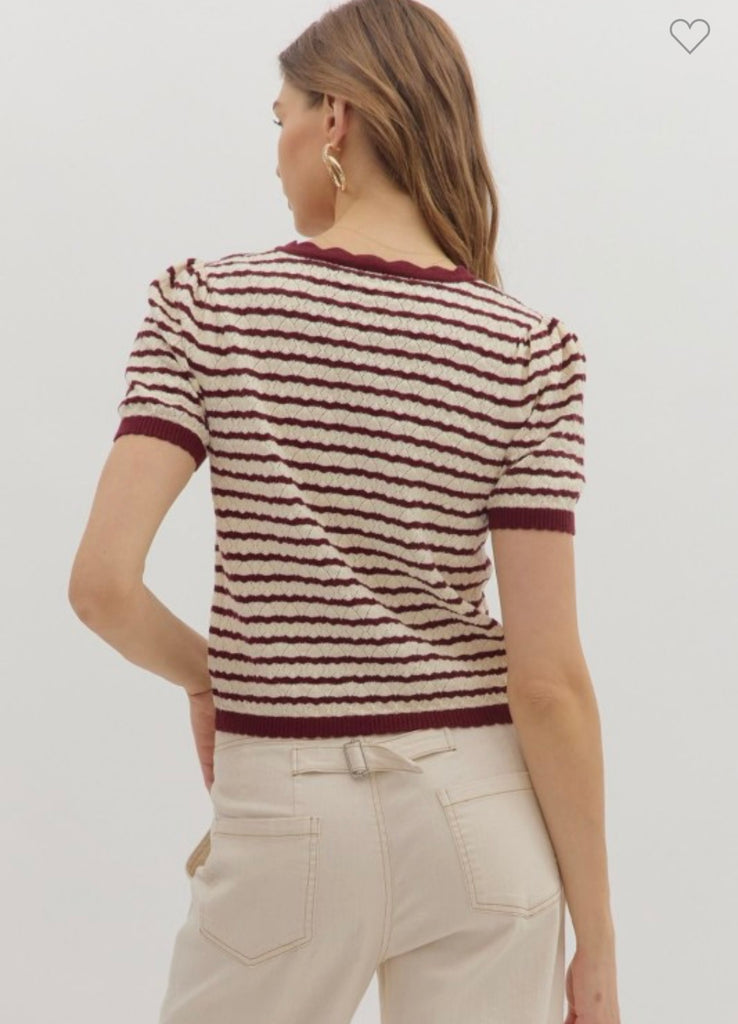 Striped lightweight knit sweater. True to size, I am a 6/8 wearing a medium. Short sleeve pointelle sweater knit top featuring scallop edge finish. Button front closure. Unlined, knit, semi-sheer, lightweight. 95% cotton, 5% spandex.