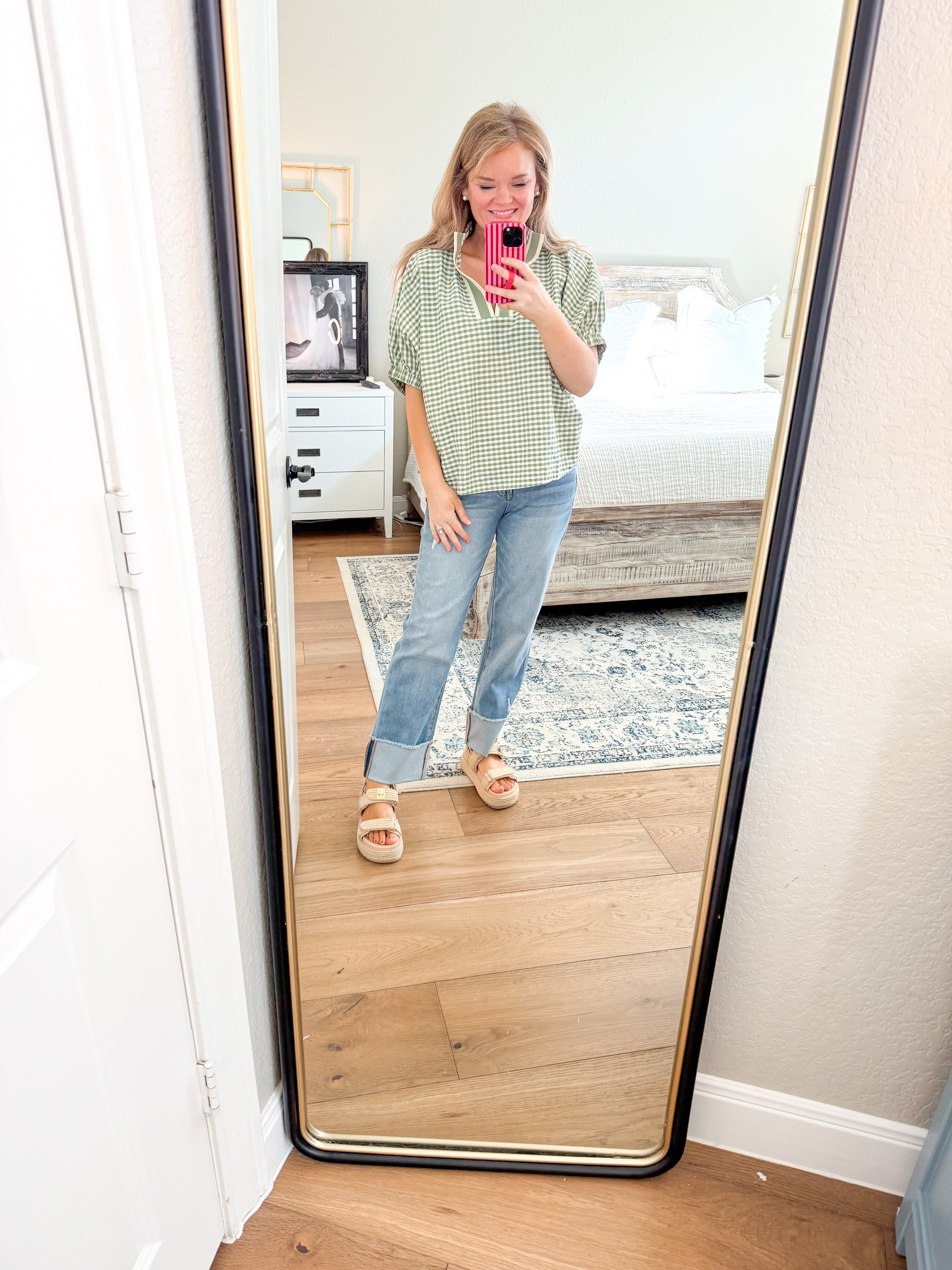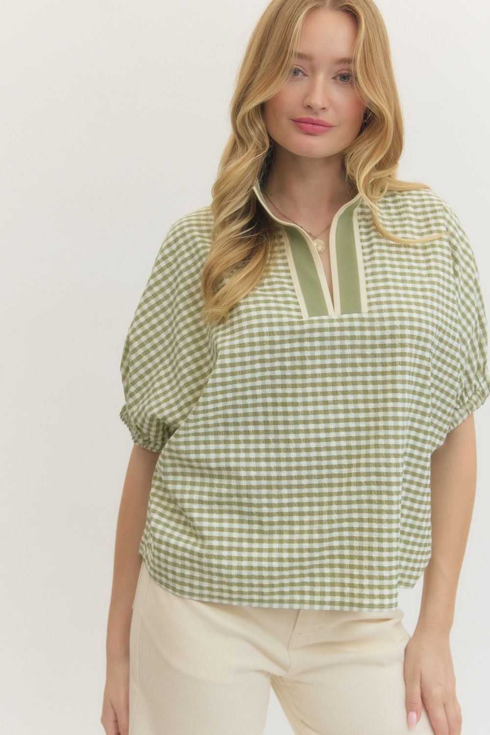 Gingham short dolman sleeve top featuring contrast trim V-neck. Unlined. Woven. Non-sheer. Lightweight.100%POLYESTER