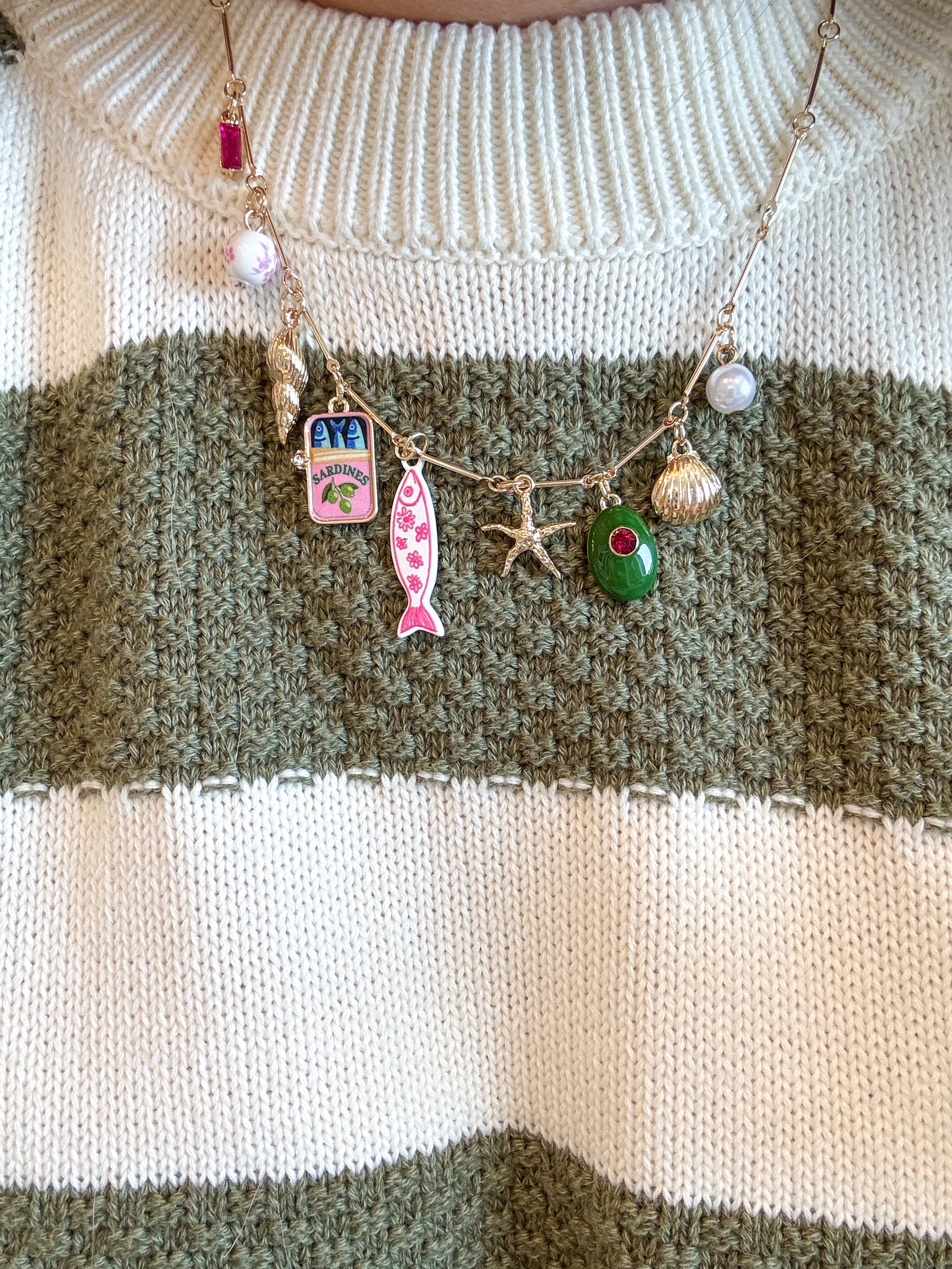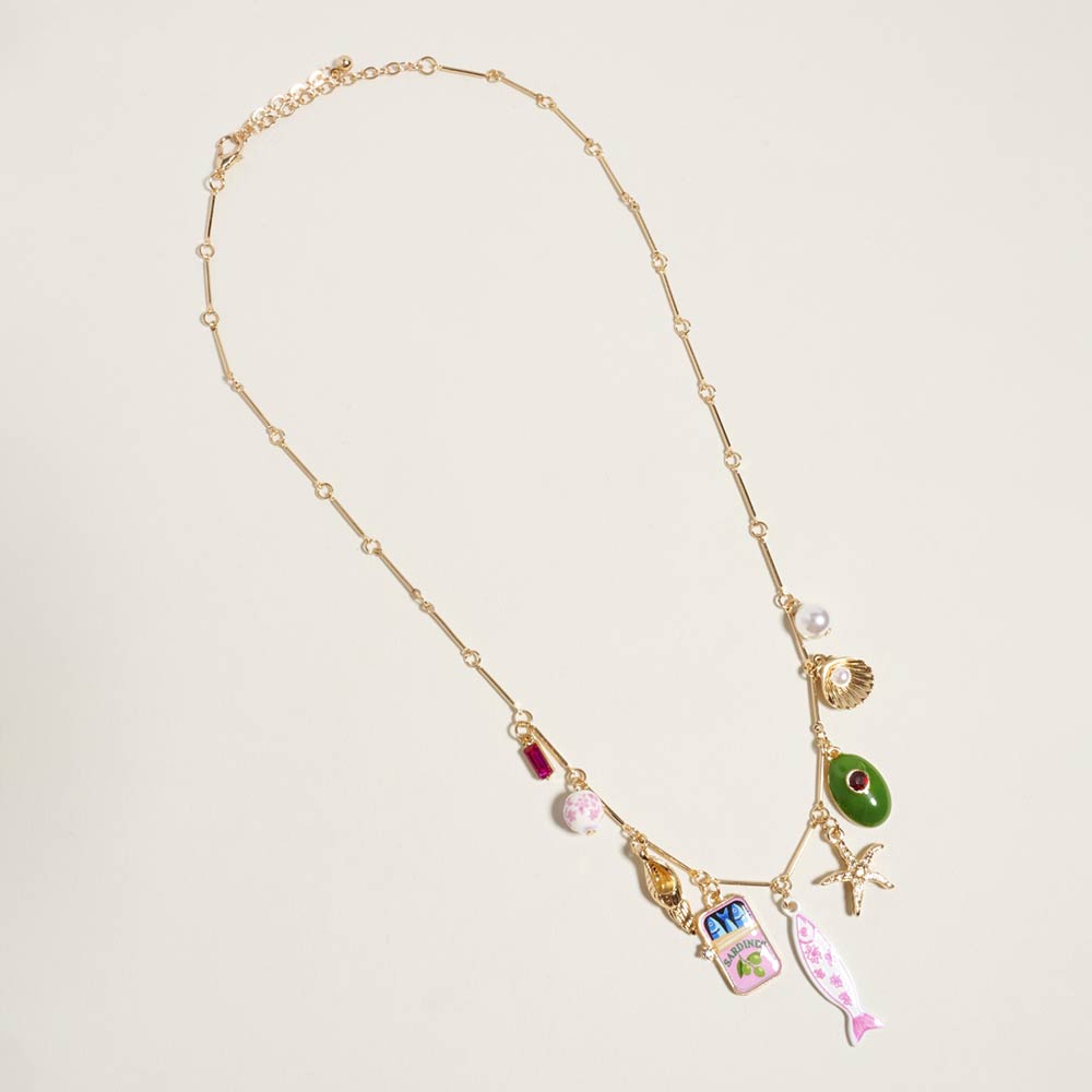 • Whimsical coastal charm necklace featuring mixed seaside-inspired pendants on a delicate station chain. Playful ocean theme elements create a standout statement piece perfect for summer styling, resort boutiques, vacation looks, and gift-ready novelty jewelry collections.