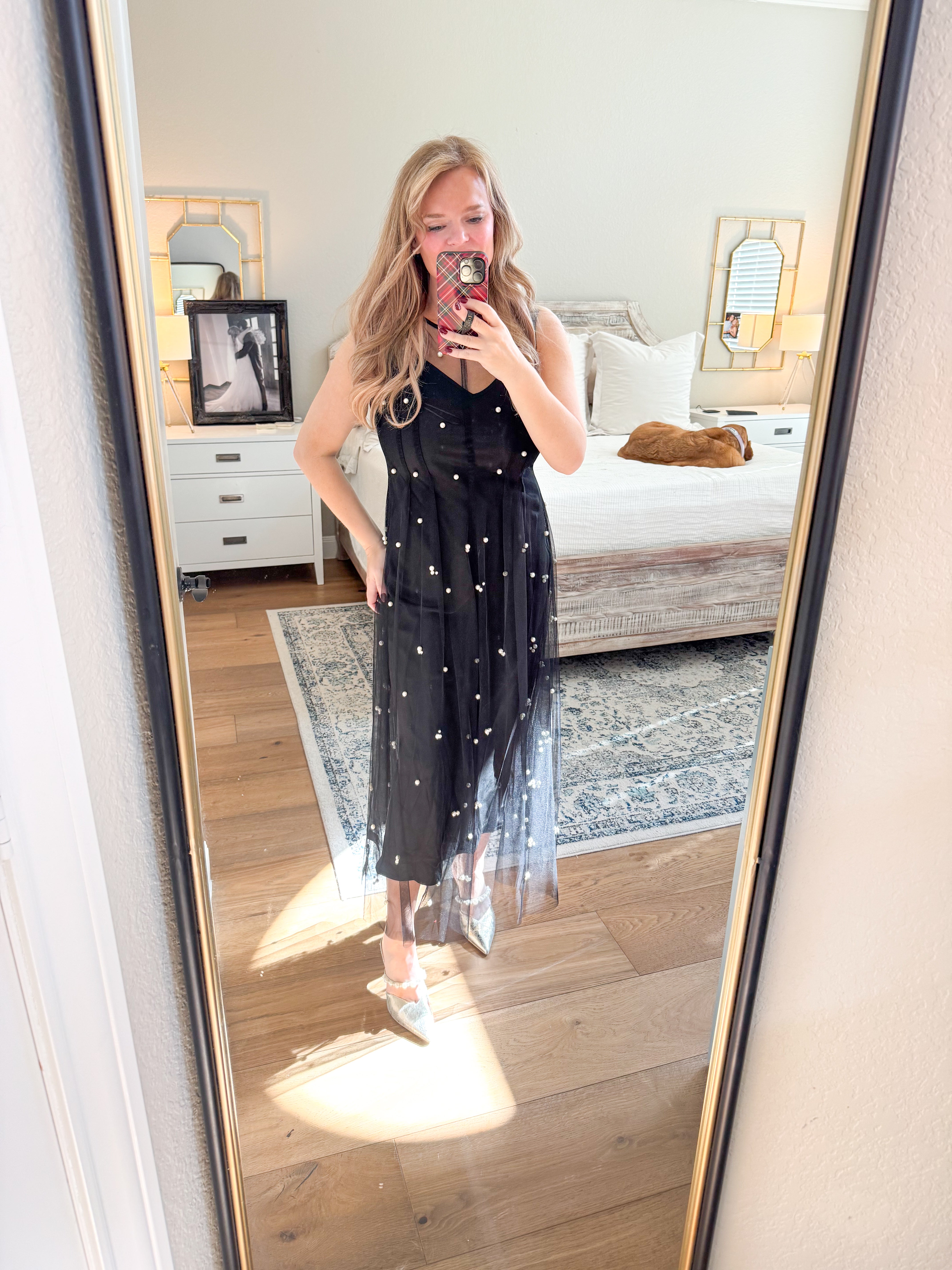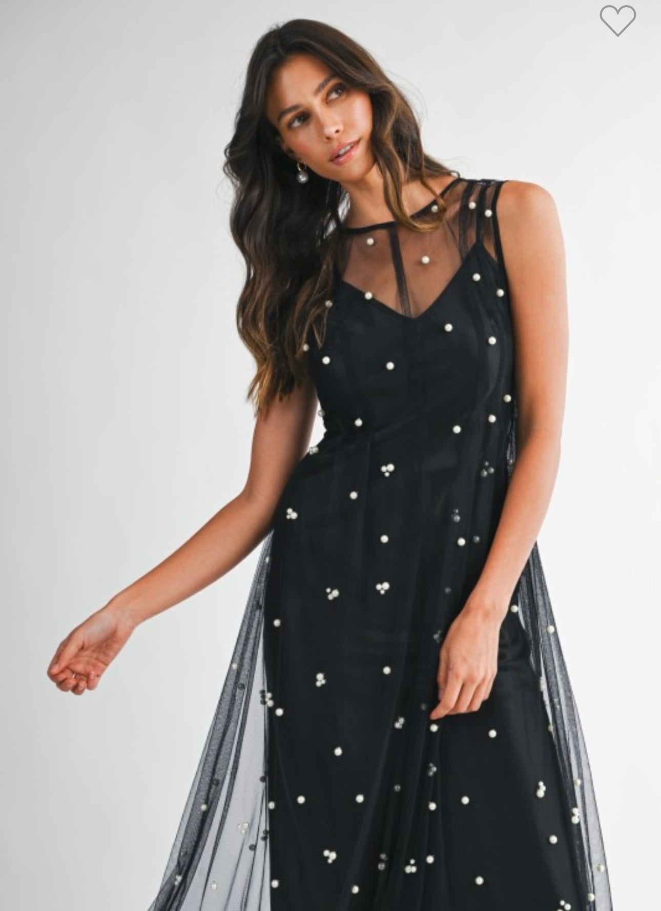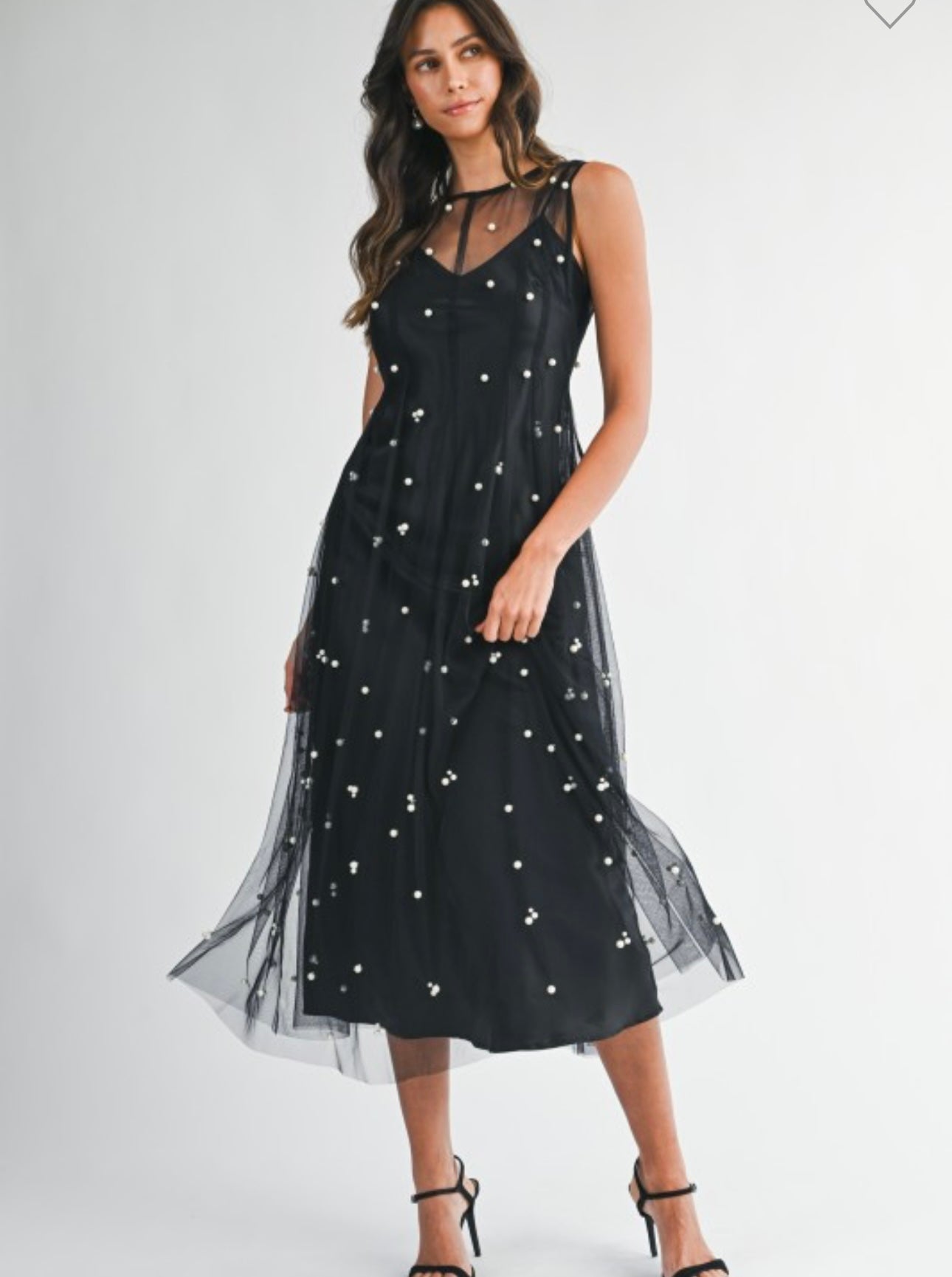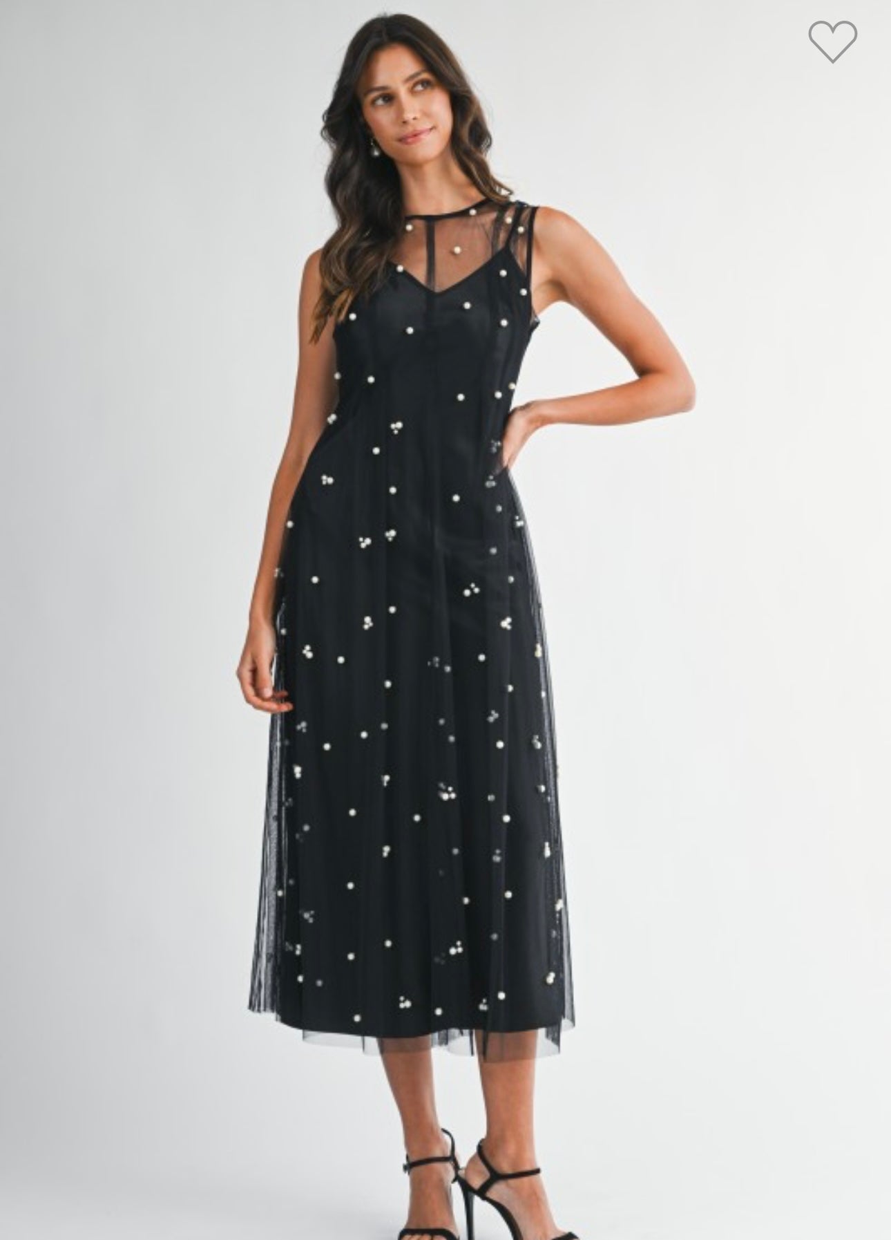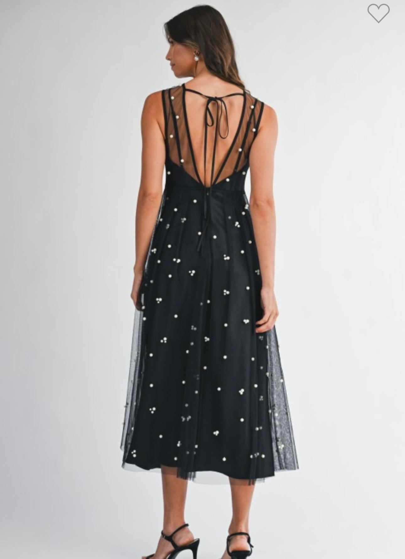 True to size, I am a 6/8 wearing medium. 100% polyester. Sleeveless sheer tulle mesh midi dress with pearl embellishment throughout on mesh overlay. Open back with tie detail. A-line silhouette with back invisible zipper. Fully lined.