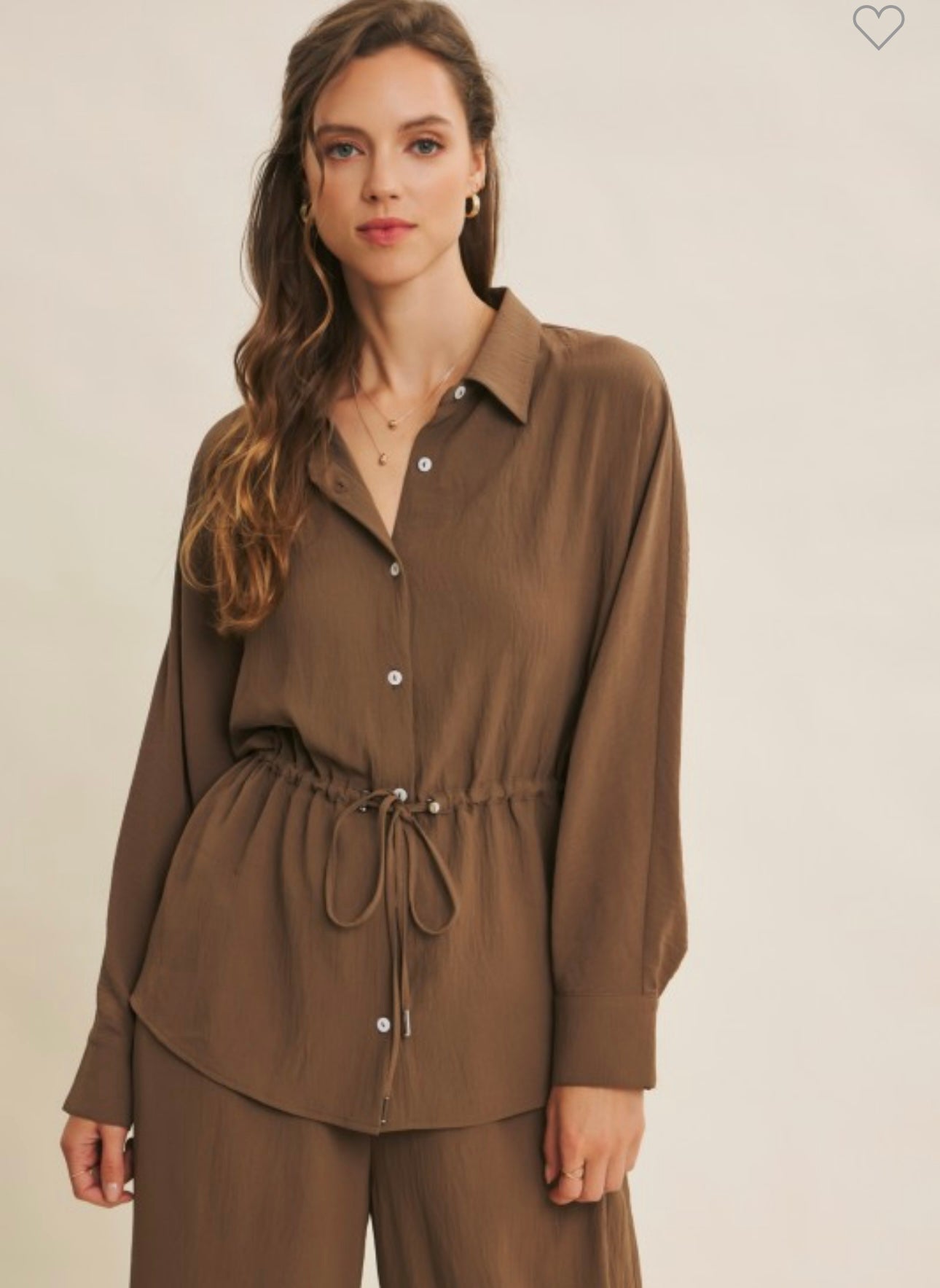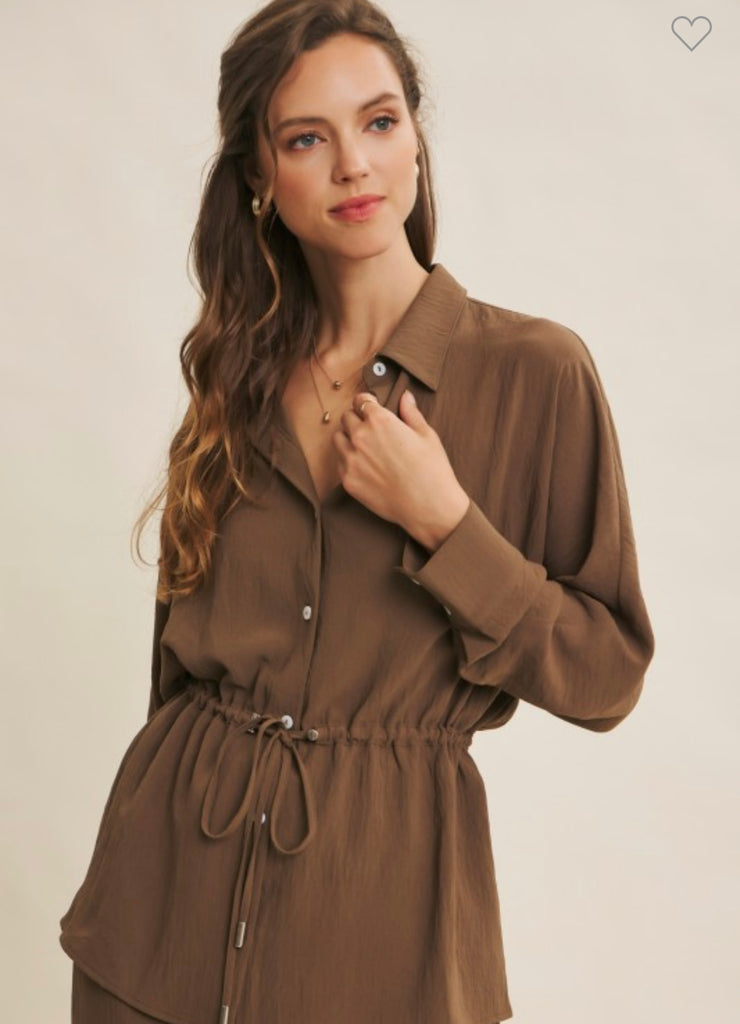 True to size, I am a 6 wearing a small. Oversized long sleeve button down shirt with adjustable waist drawstrings. 100% polyester. Matching pants sold separately.