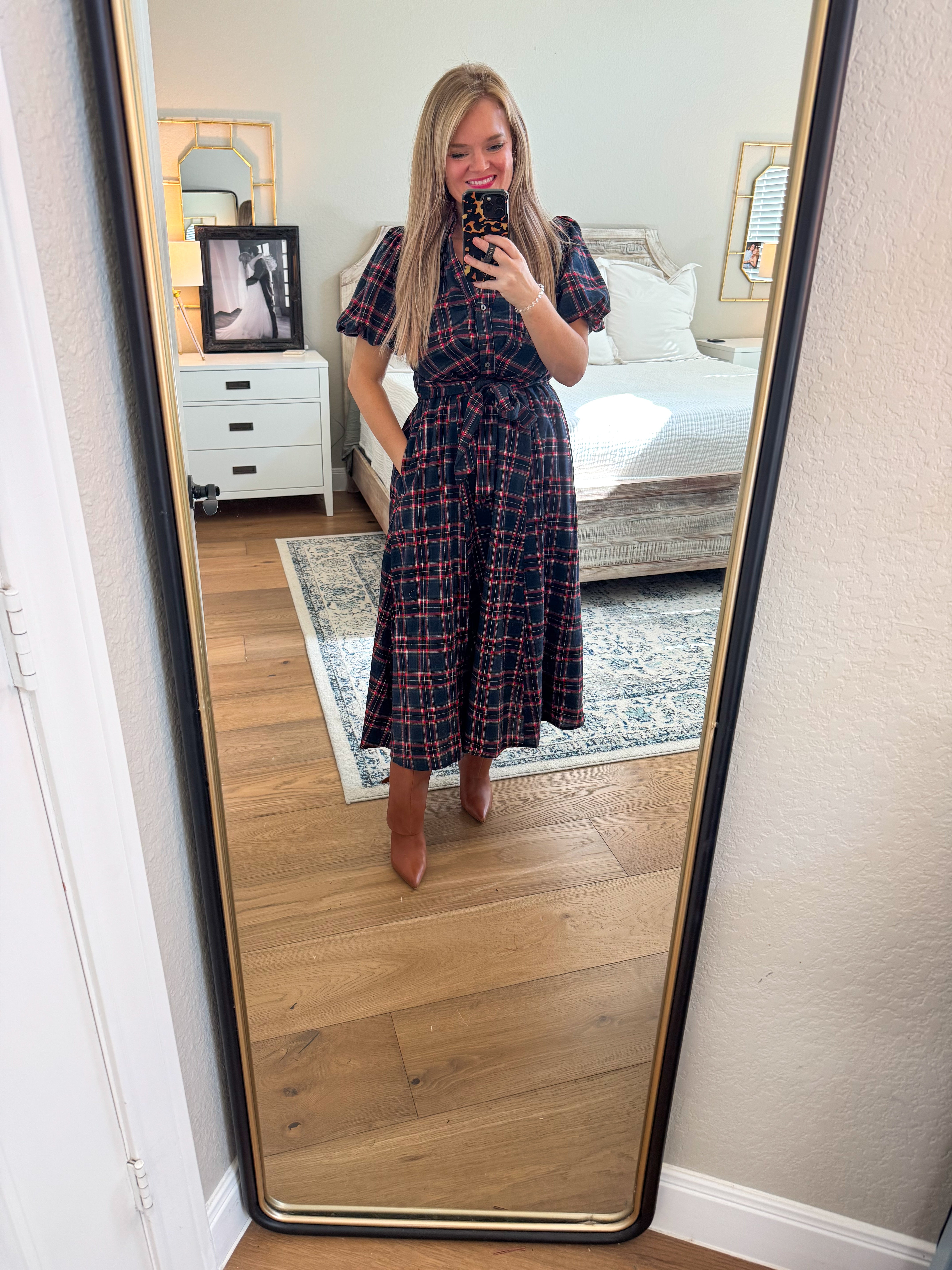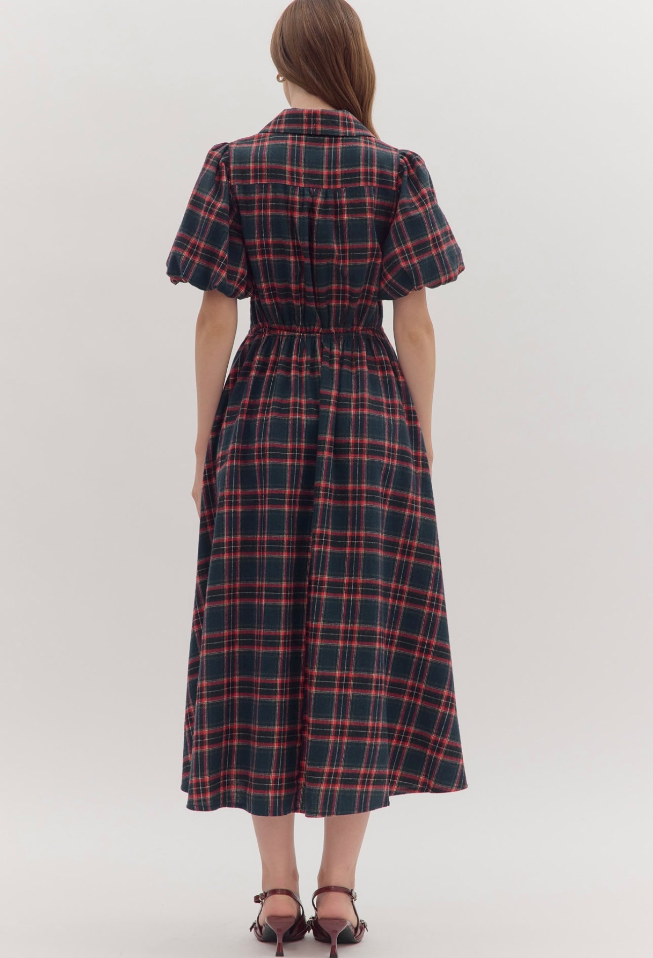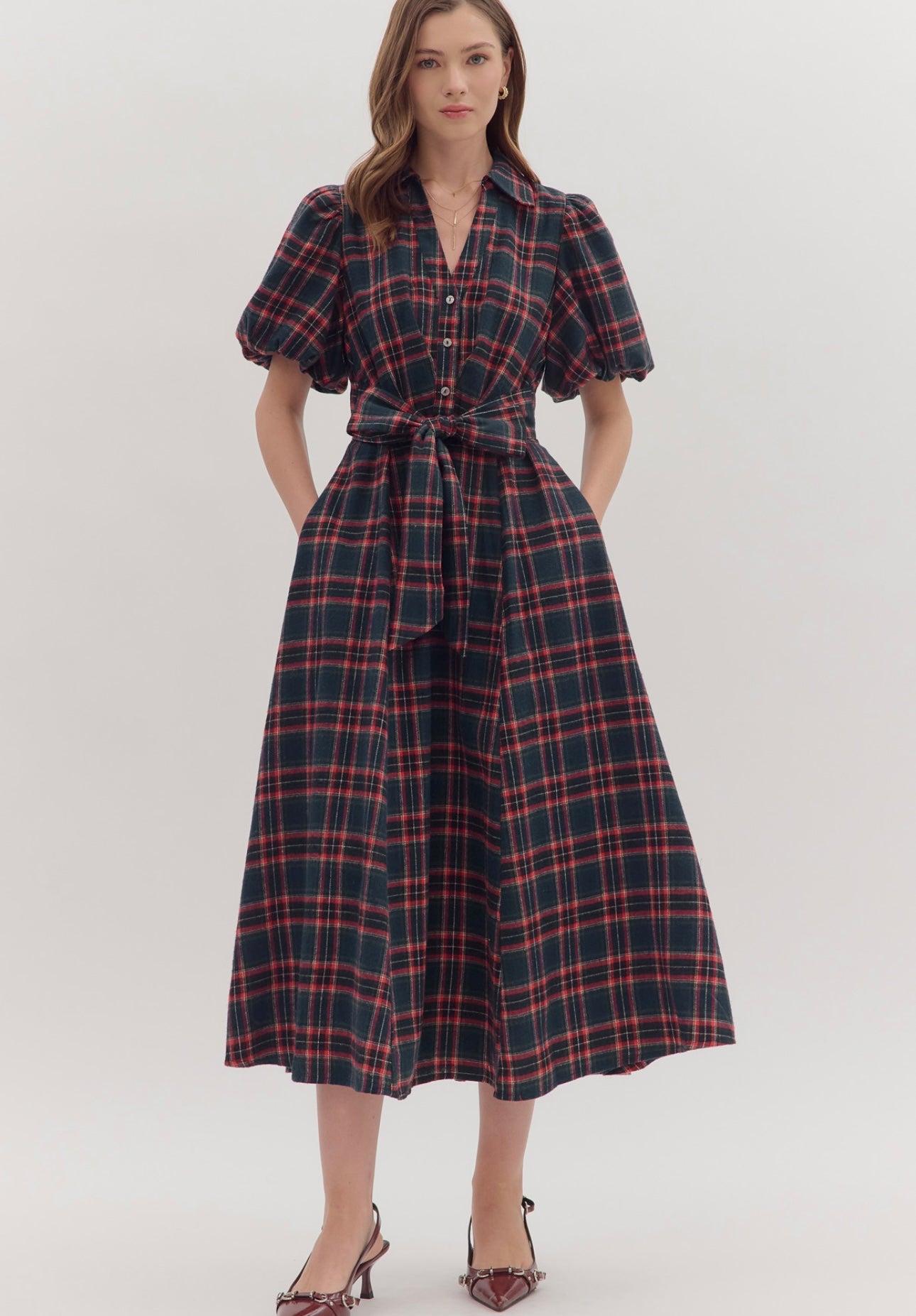 True to size, I am a 6/8 wearing medium. Plaid puff sleeve midi dress featuring self-tie waist belt and button closure at front. Side pockets, lined, woven, non-sheer, medium weight. 65% polyester, 35% cotton.