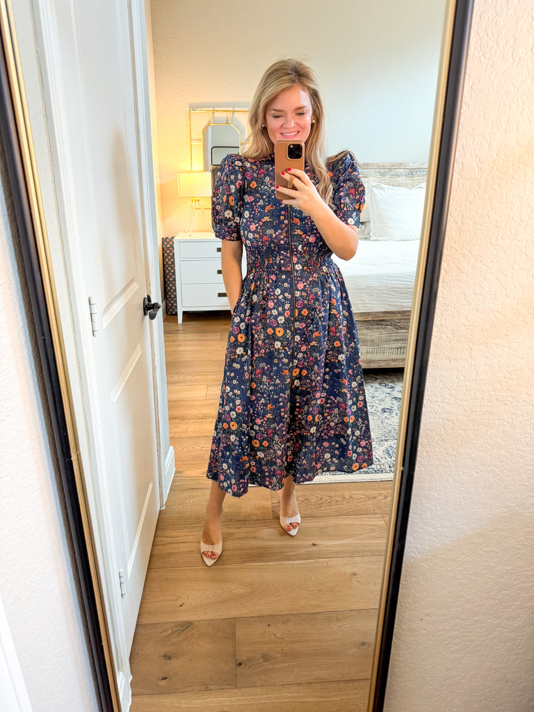 True to size, I am a 6/8 wearing a medium. 100% cotton floral print puff sleeve shoulder short sleeve midi dress. Smocked waistband with full front zip fly closure. Side pockets, lined, woven, non-sheer, lightweight.