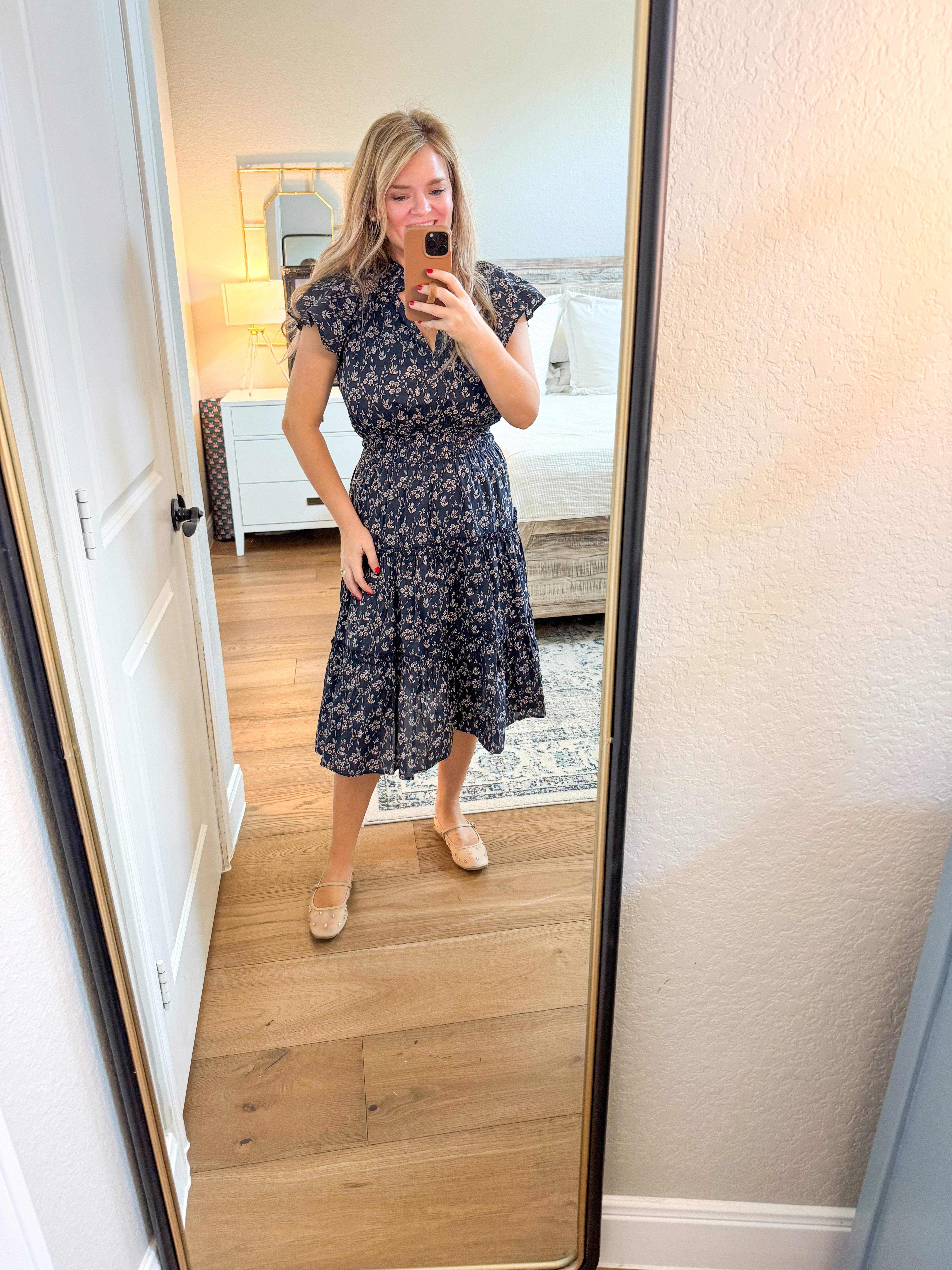 True to size, I am a 6/8 a medium. 100% cotton floral midi dress with smocked waist.