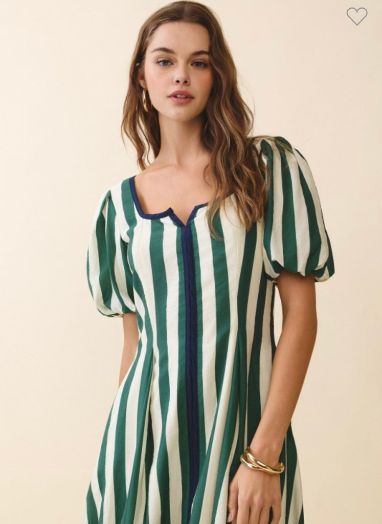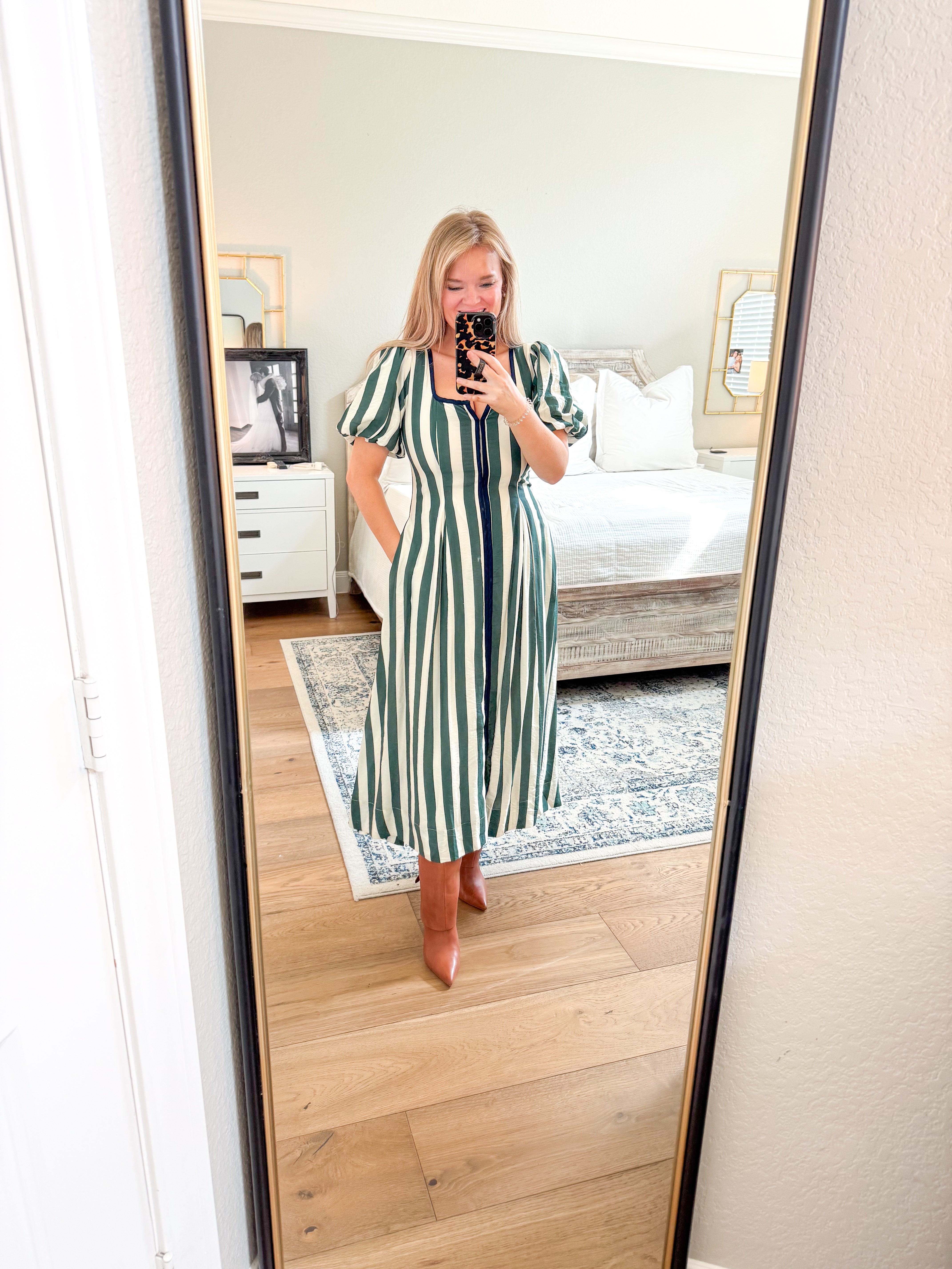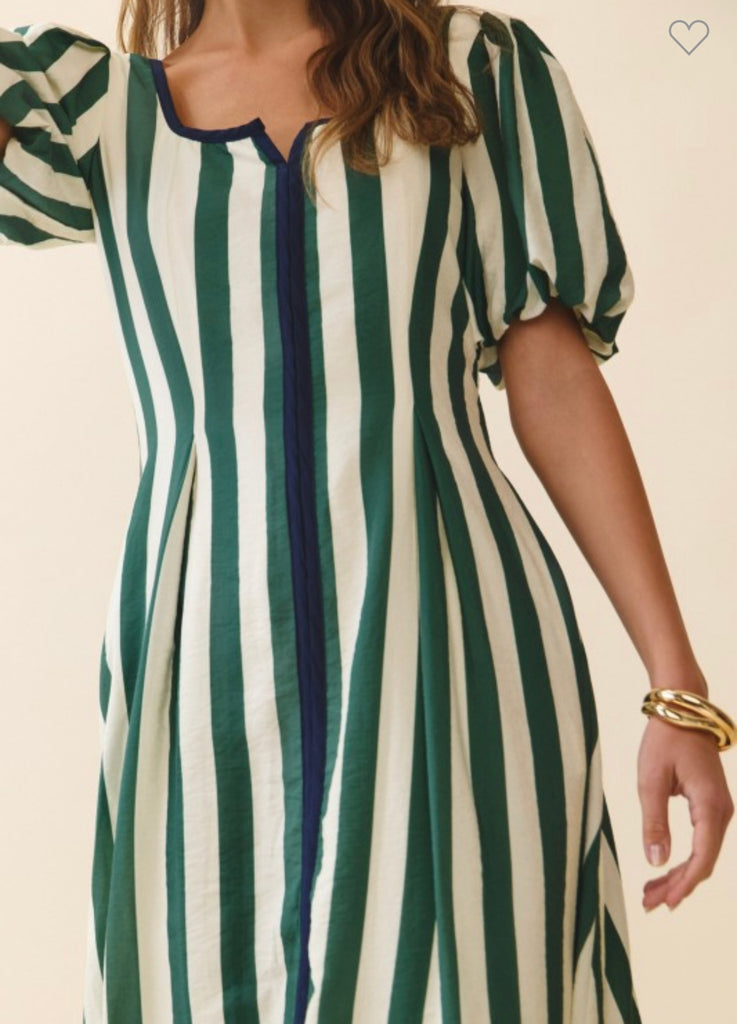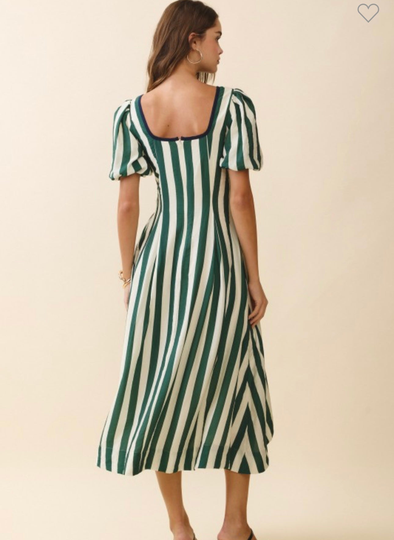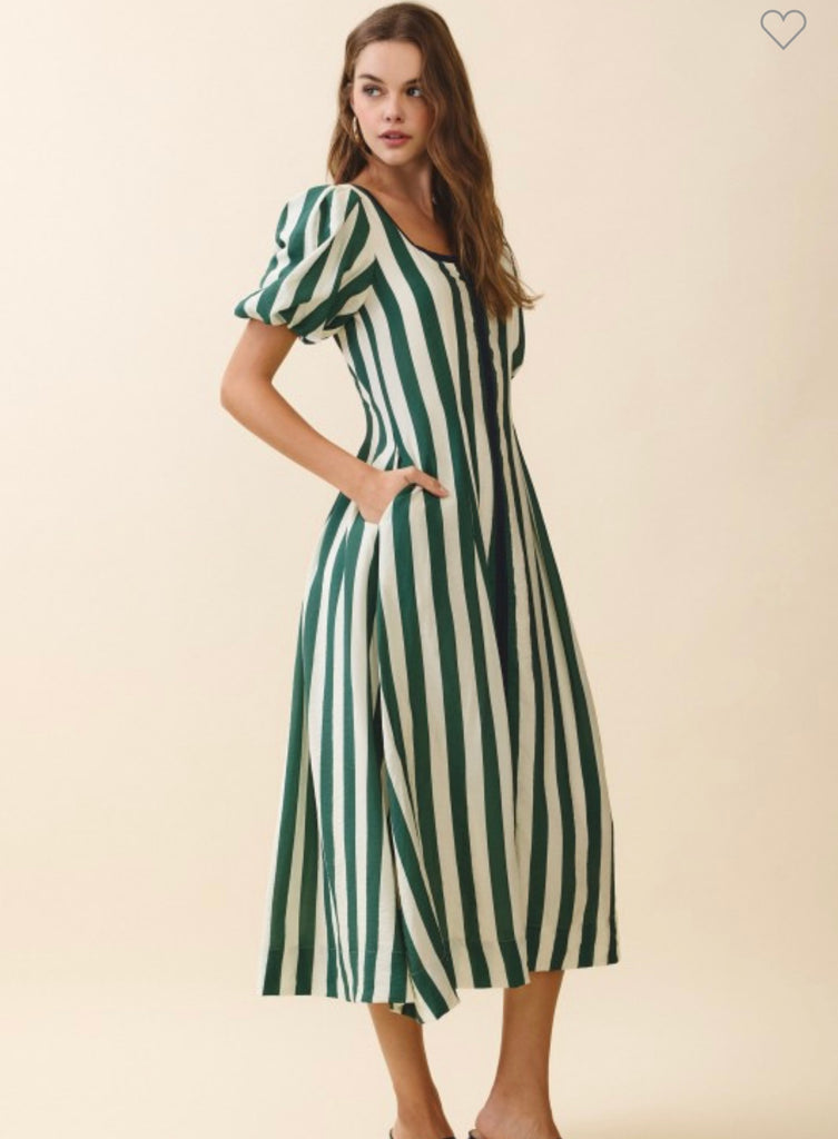 True to size, I am a 6 wearing a medium. Bold vertical striped square neck midi dress. 97% cotton, 3% spandex. Lined and side pockets.