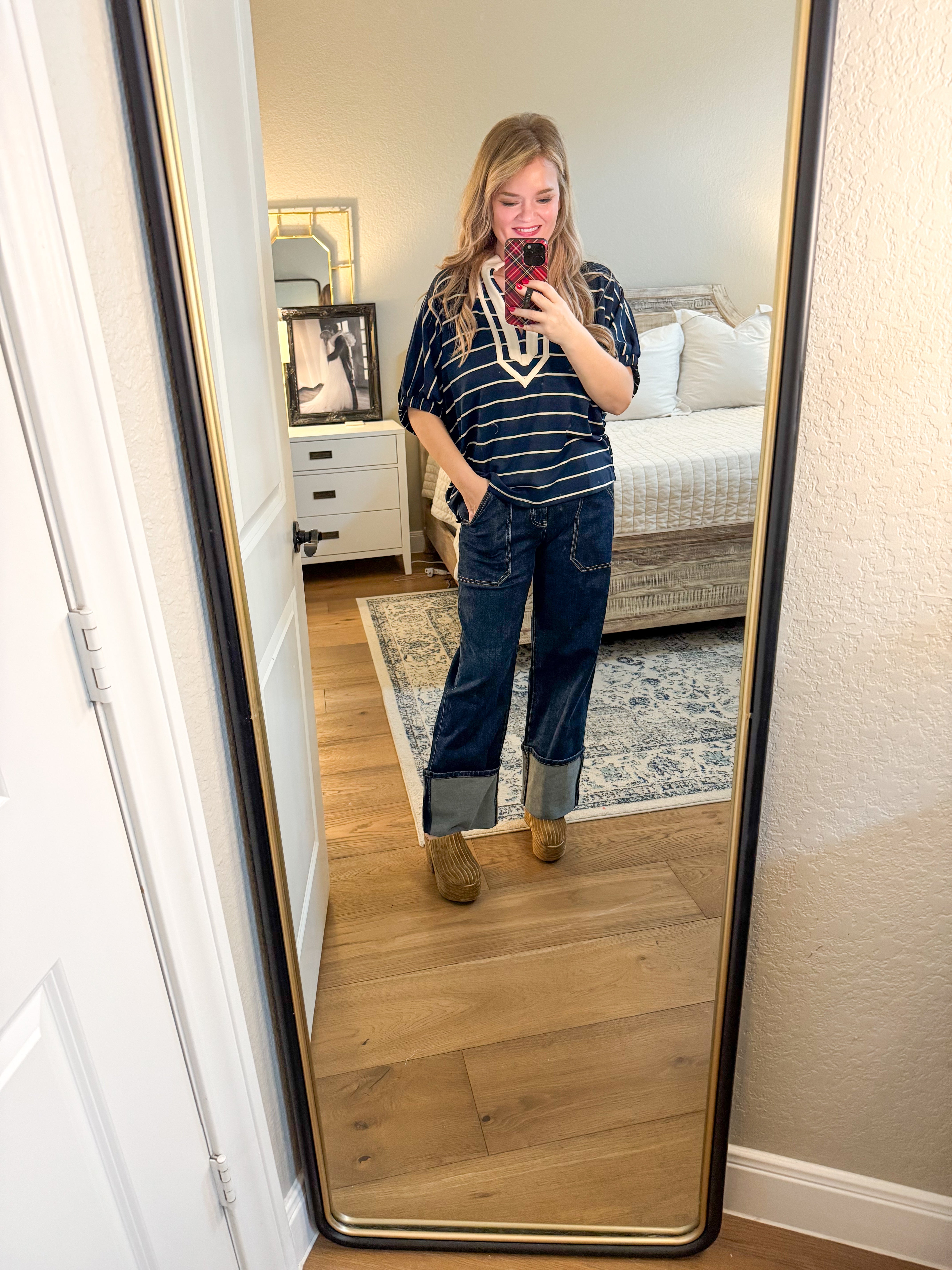 Striped short dolman sleeve top featuring contrast trim split v-neck. Elasticated sleeve opening. Unlined, knit, non-sheer, lightweight. 65% polyester, 30% cotton, 5% spandex. True to size, I am a 6/8 wearing a small.
