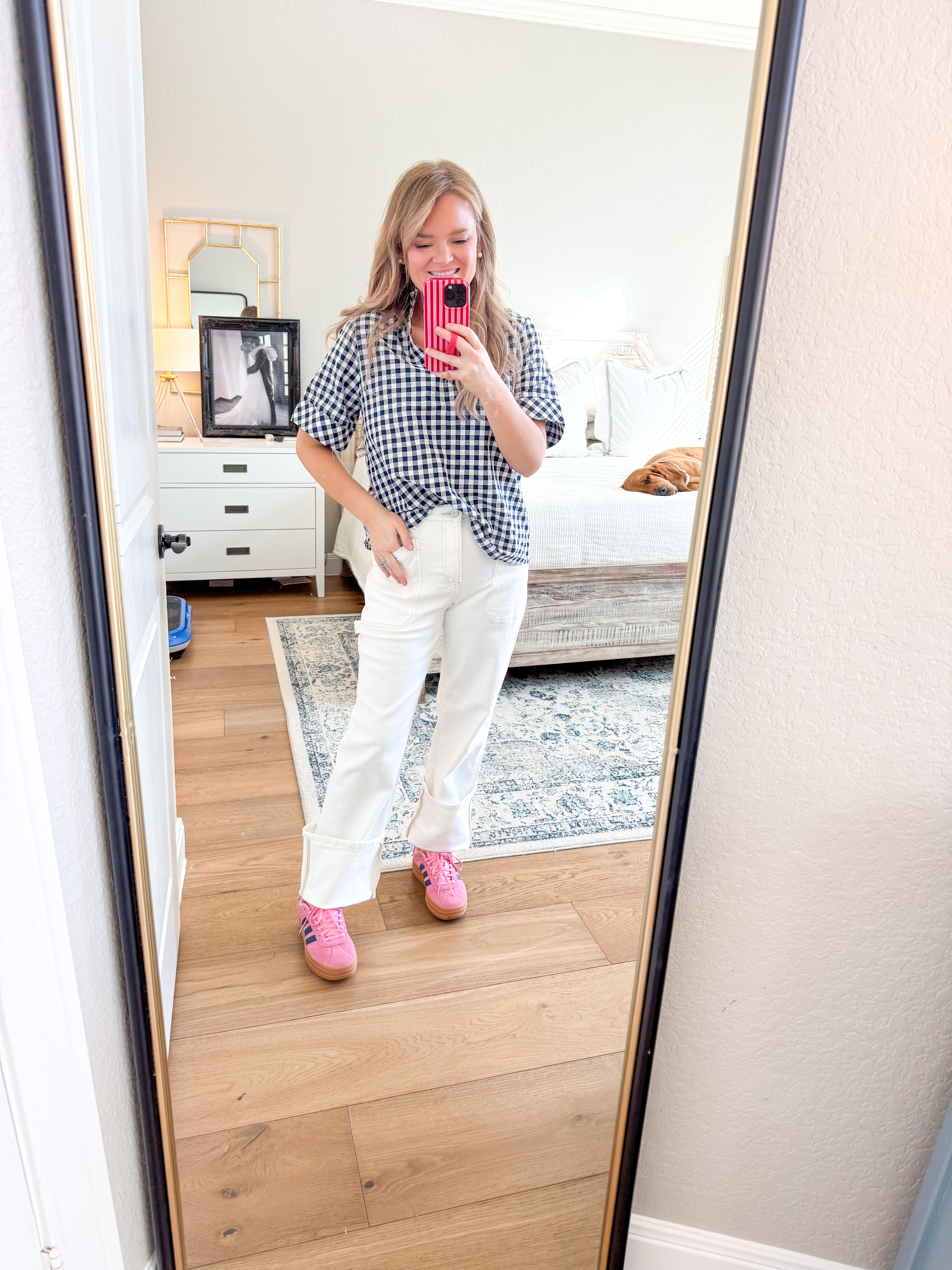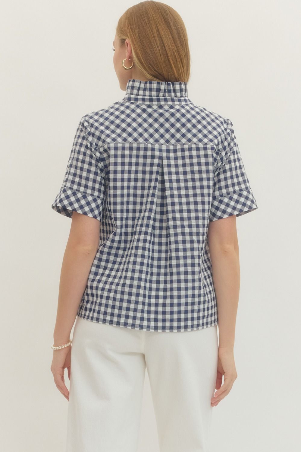 100% cotton Gingham short sleeve top featuring stand collar V-neck. Unlined. Woven. Non-sheer. Lightweight. True to size, I am a 6/8 wearing a small.