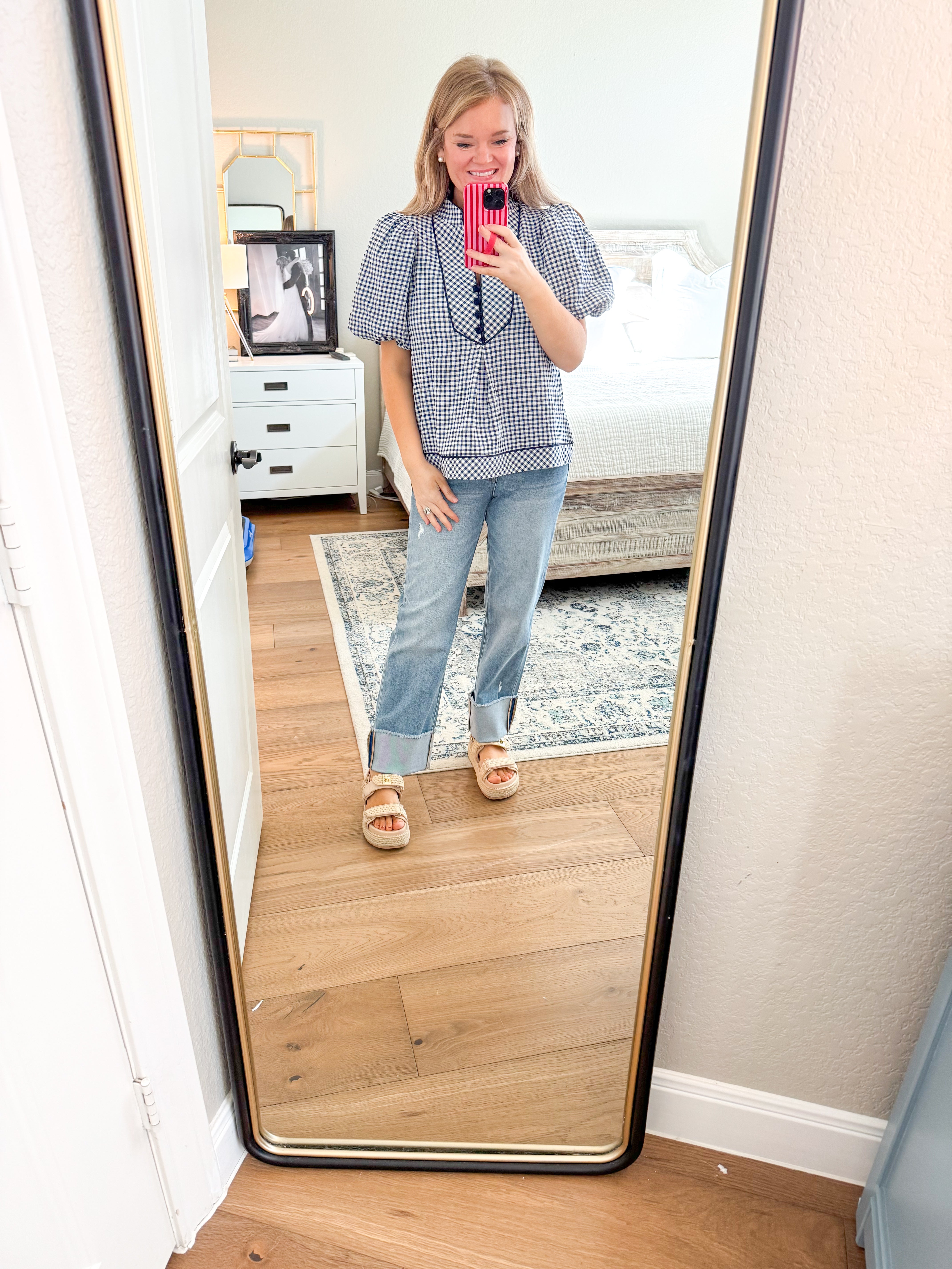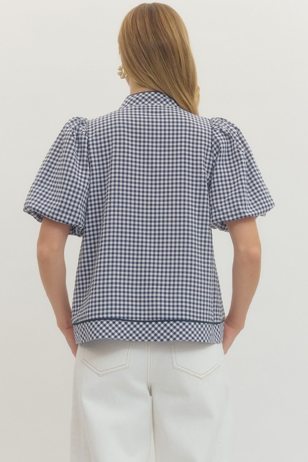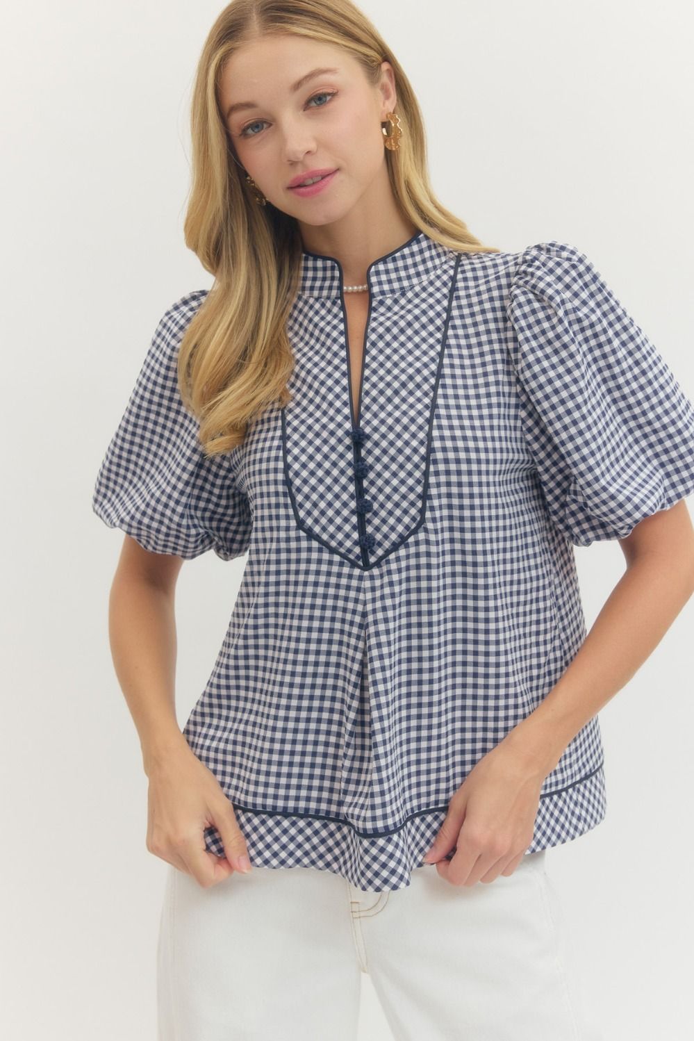 Gingham puff sleeve top featuring contrast piping and fabric-covered button detail at front. Unlined. Woven. Non-sheer. Lightweight. True to size, I am a 6/8 wearing a small. 95%POLYESTER 5%SPANDEX