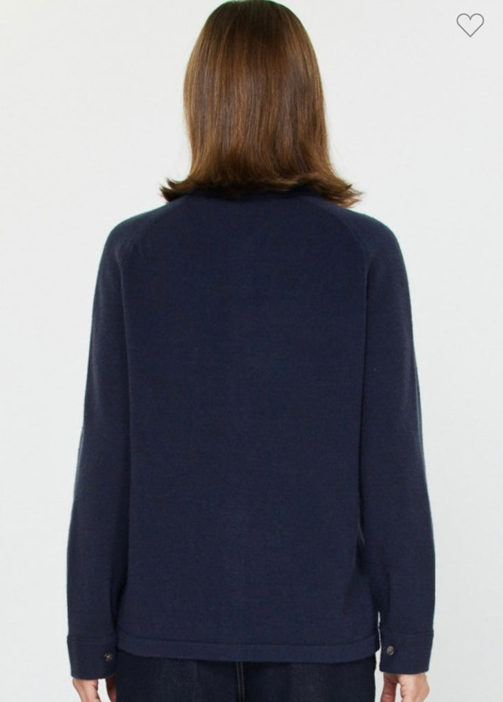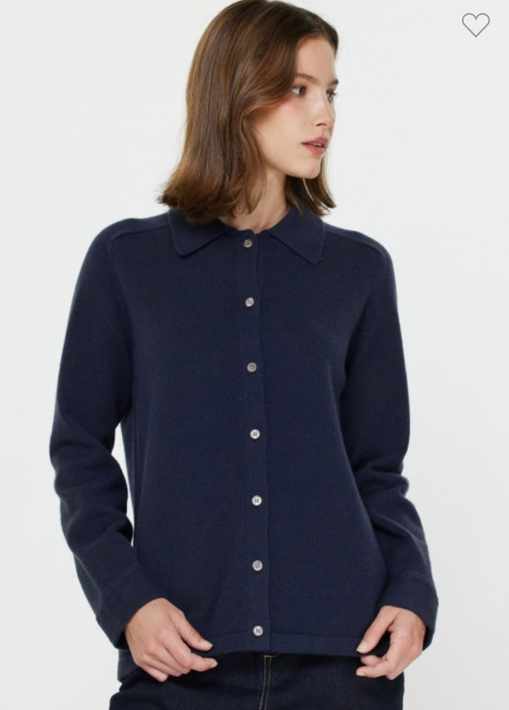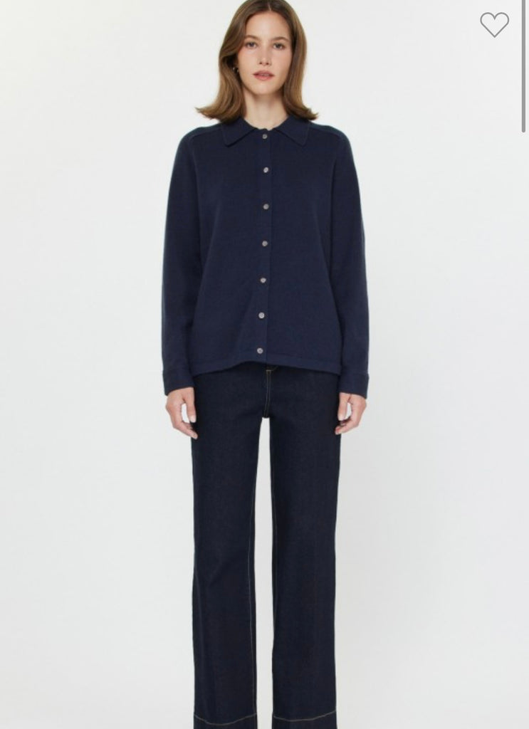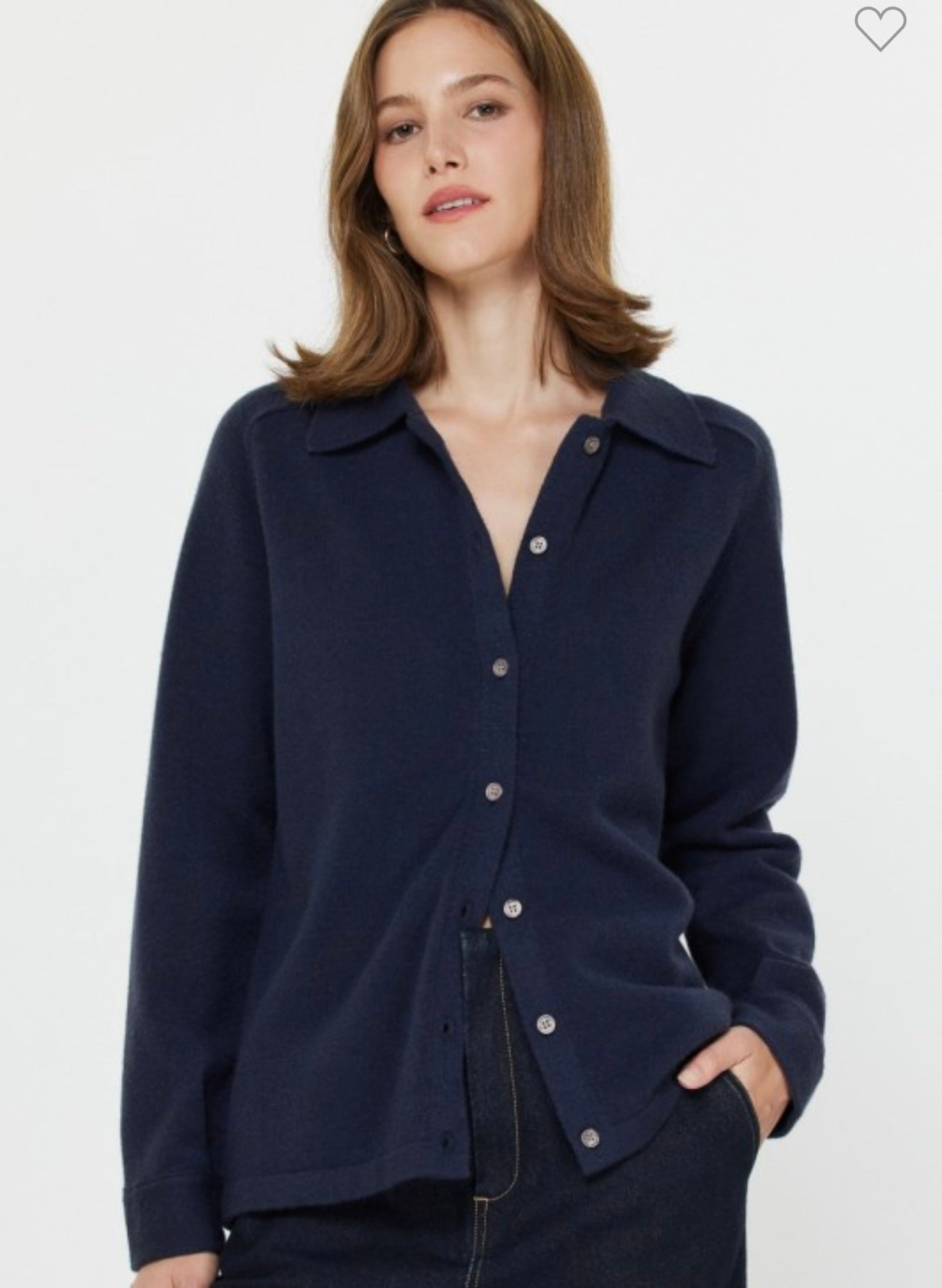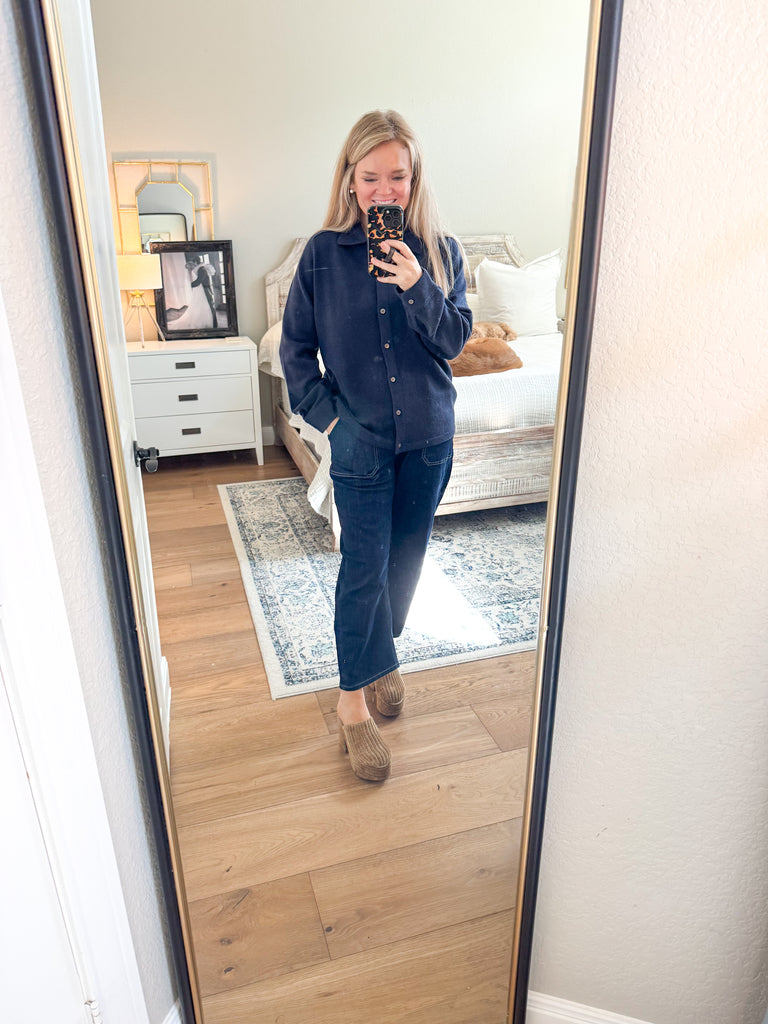 Soft touch knit button up shacket. 50% acrylic, 31% poly, 19% nylon. I am a 6/8 wearing a medium.