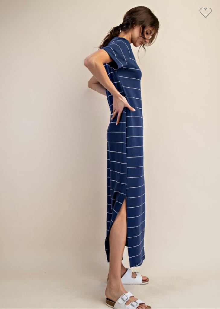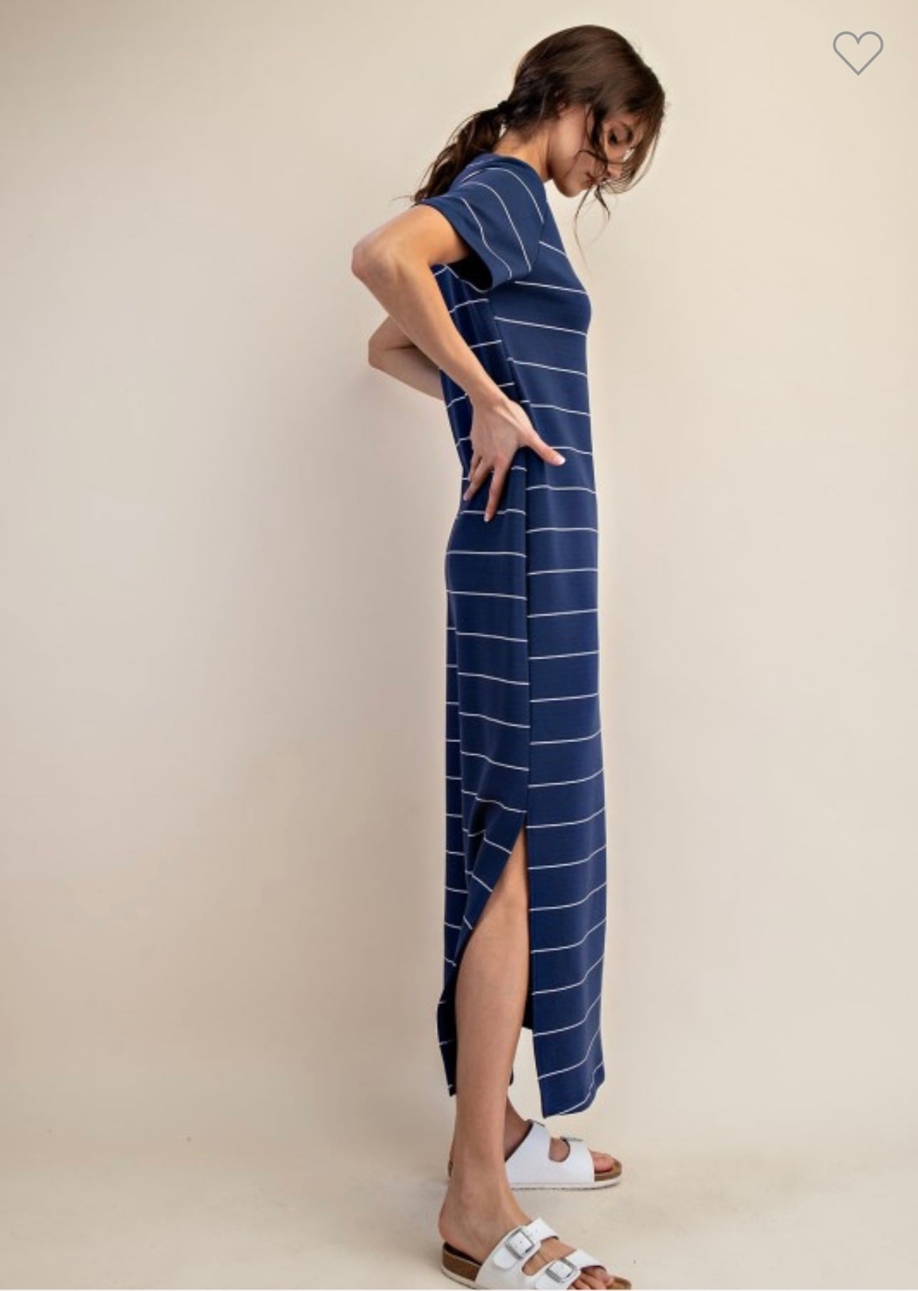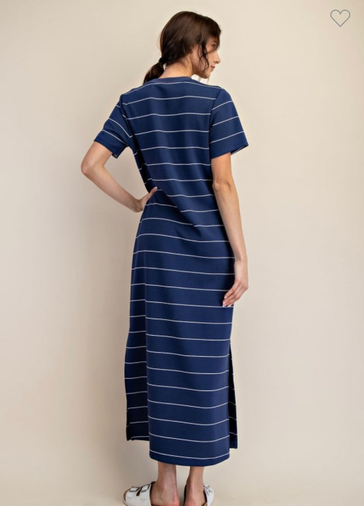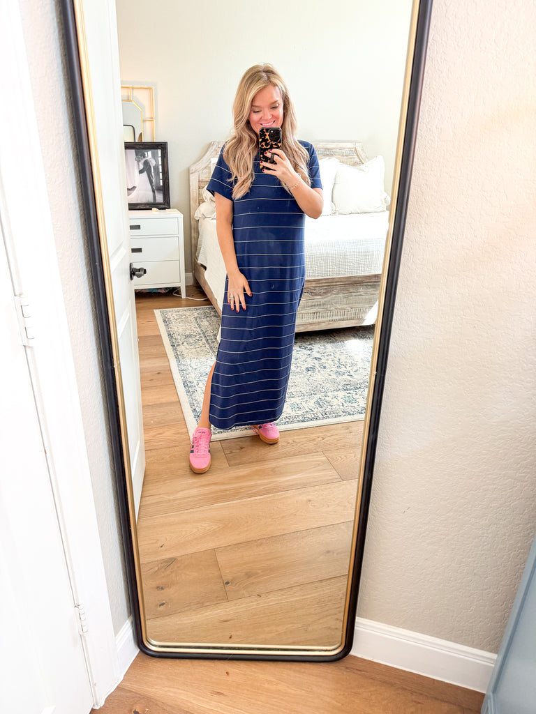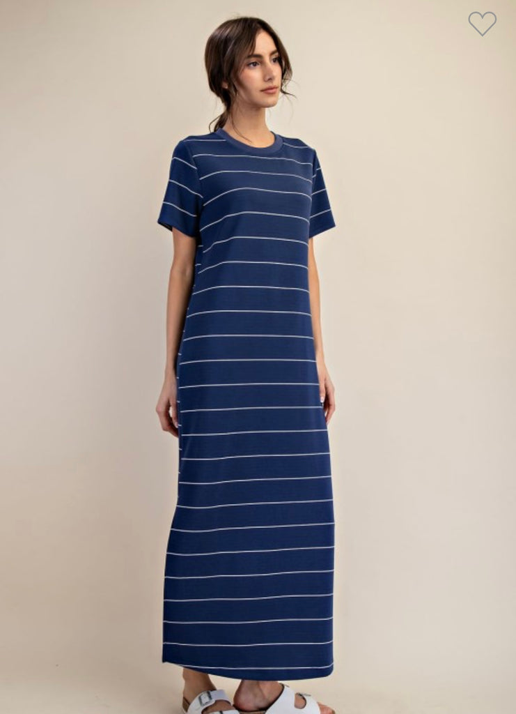 True to size, I am a 6/8 wearing a medium. Maxi t-shirt dress, yard dyed modal poly spandex scuba fabric. 38% rayon, 2% modal, 54% polyester, 5% spandex.