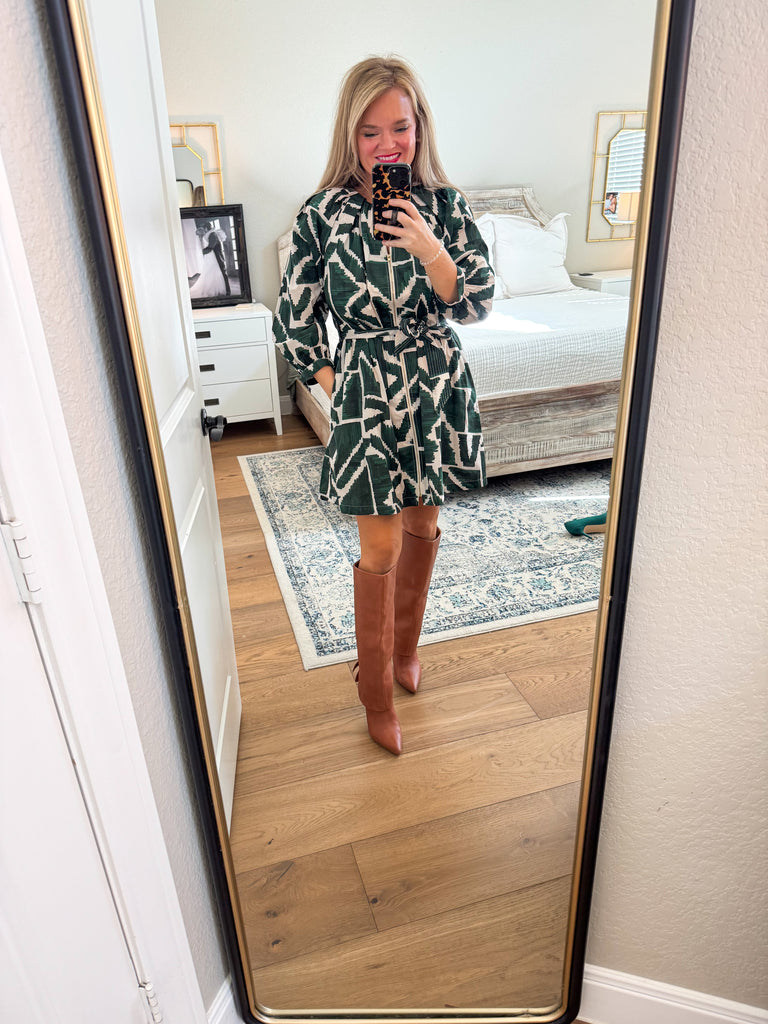 100% cotton geometric print ¾ sleeve dress featuring zipper closure at front and self-tie waist belt. Lined, woven, non-sheer, lightweight. True to size, I am a 6/8 wearing a small.