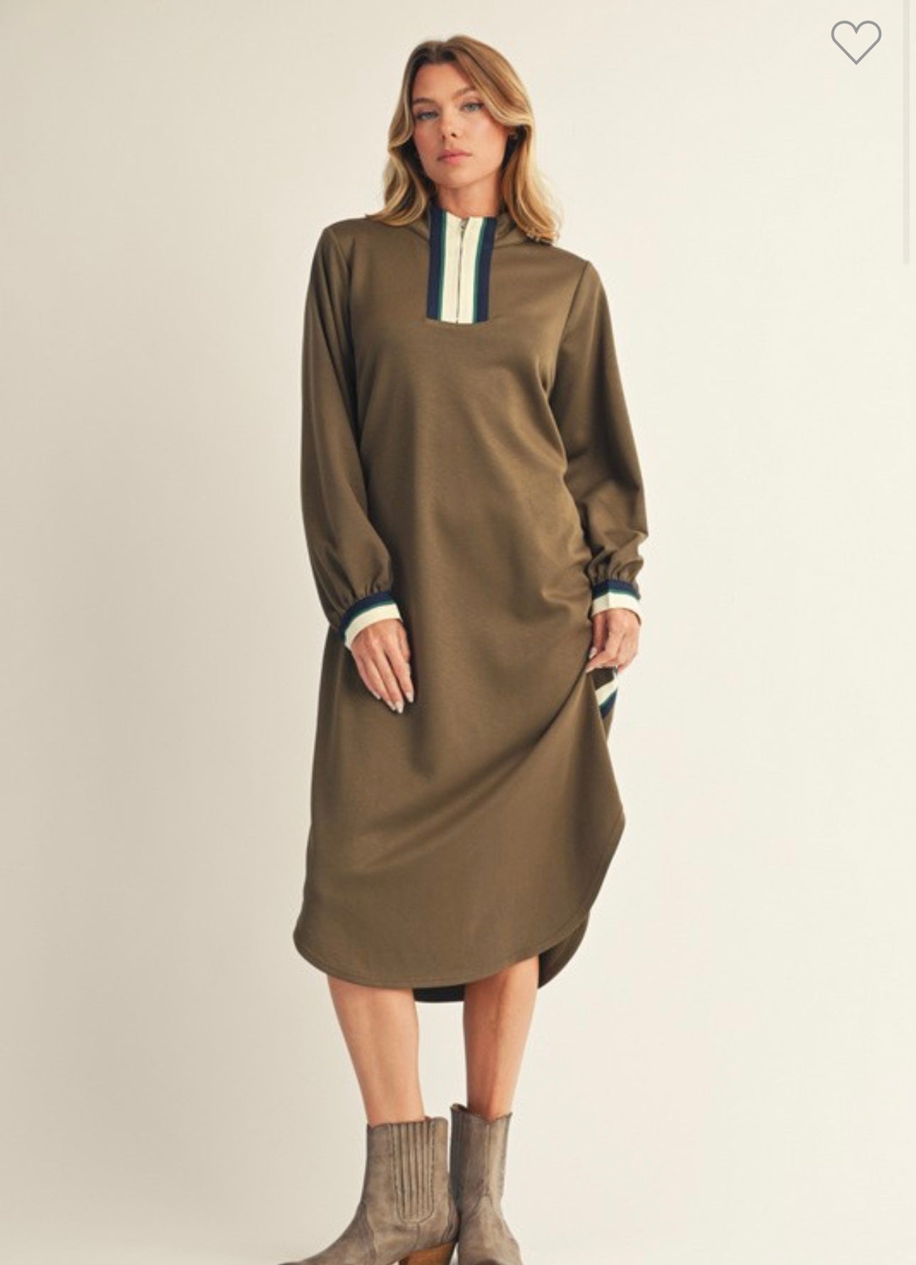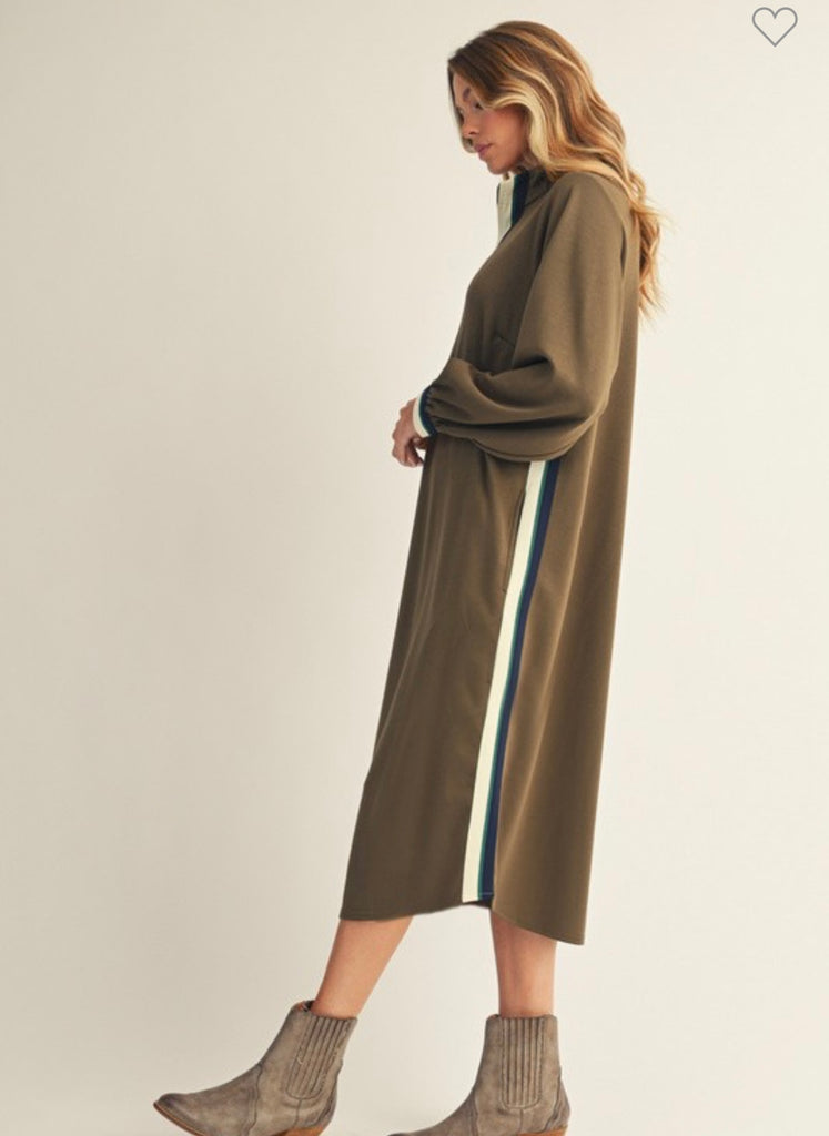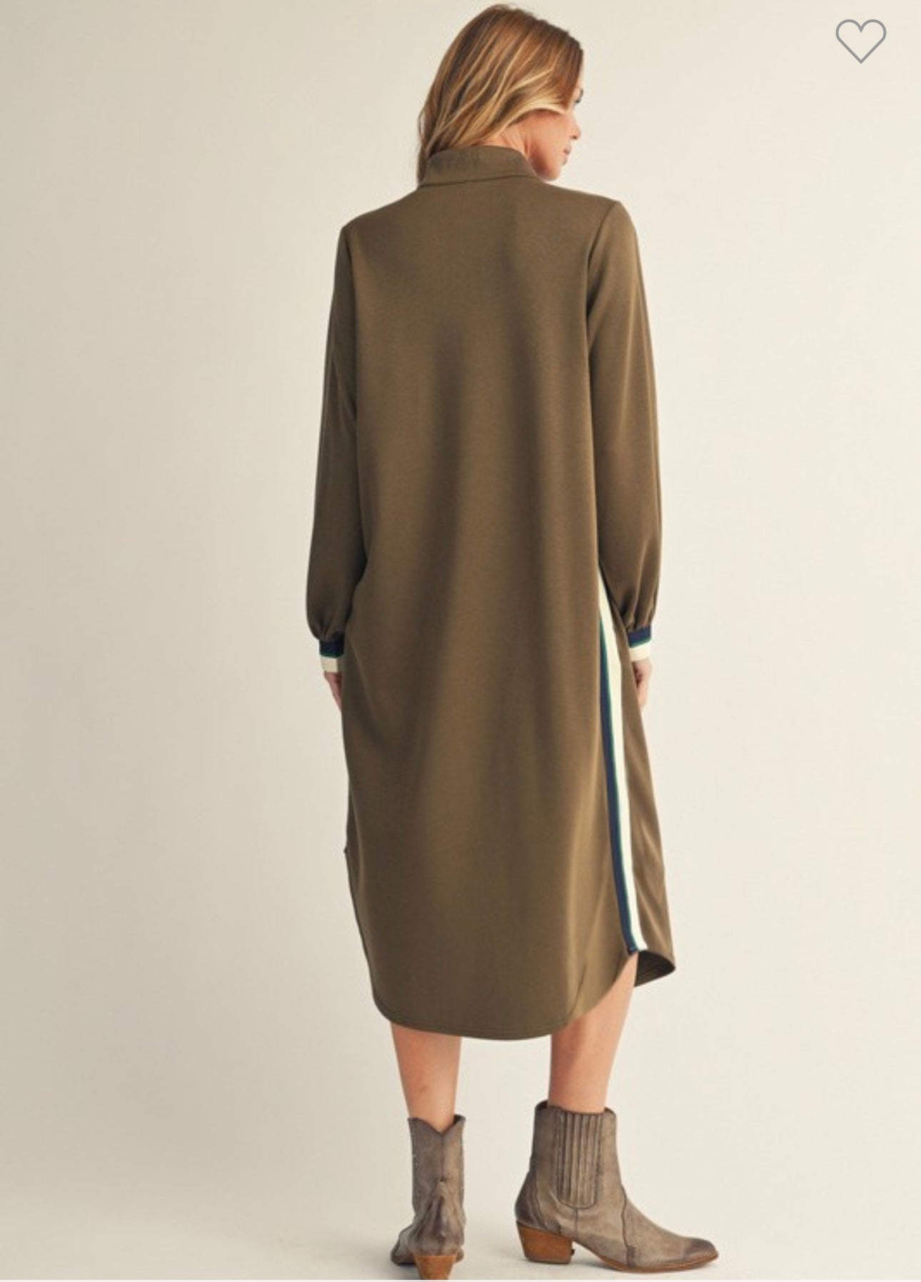 True to size, I am a 6 wearing a medium. Striped contrast accent zip up solid midi dress with side pockets. Mock neck.