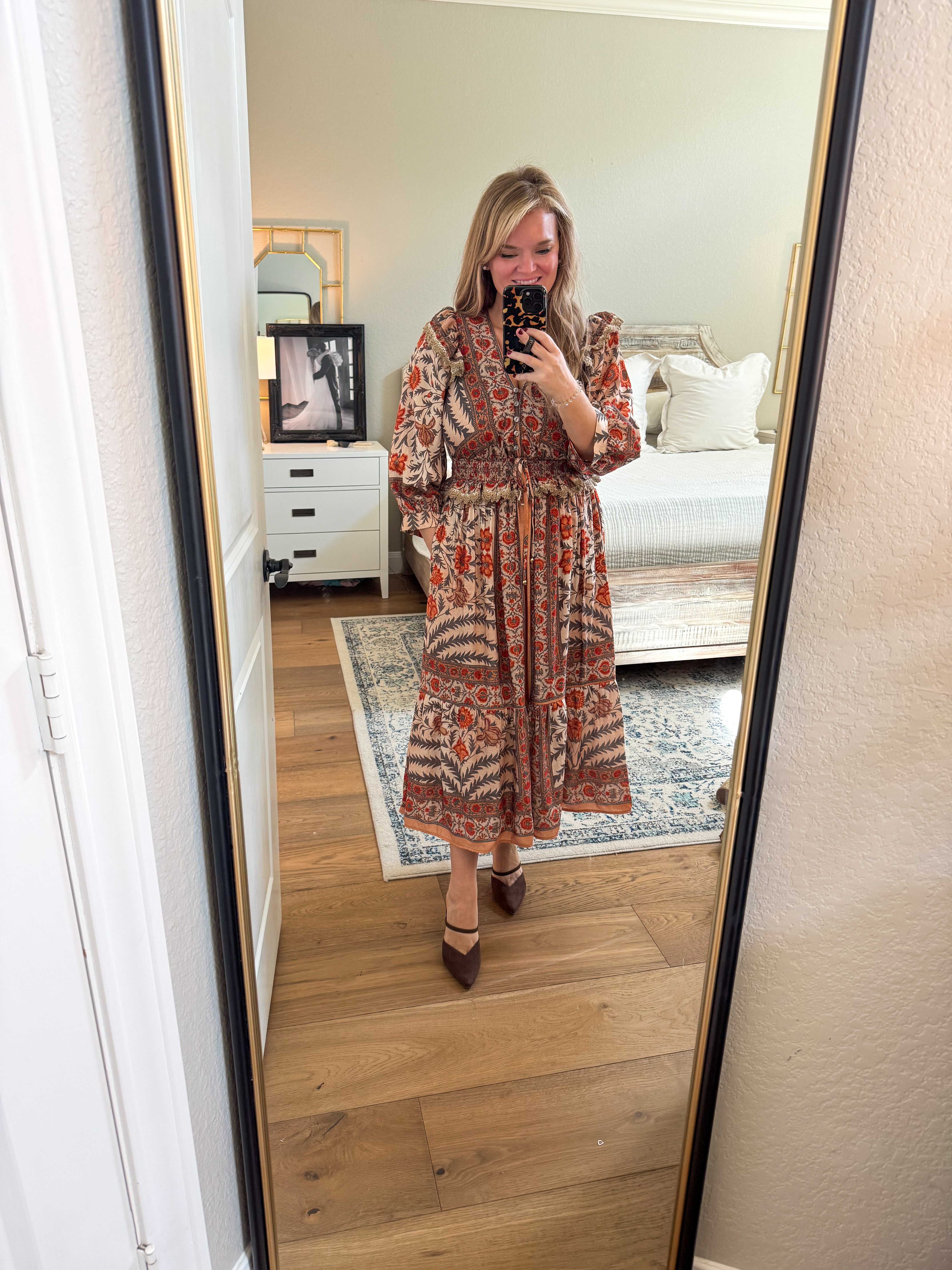True to size, I am a 6 wearing a medium. 80% rayon, 20% nylon. Floral print ¾ sleeve midi dress featuring v-neck with button closure at front and smocked waistband with tie detail. Shoulder ruffle accents, ruffle hem, side pockets, lined, woven, non-sheer, lightweight.