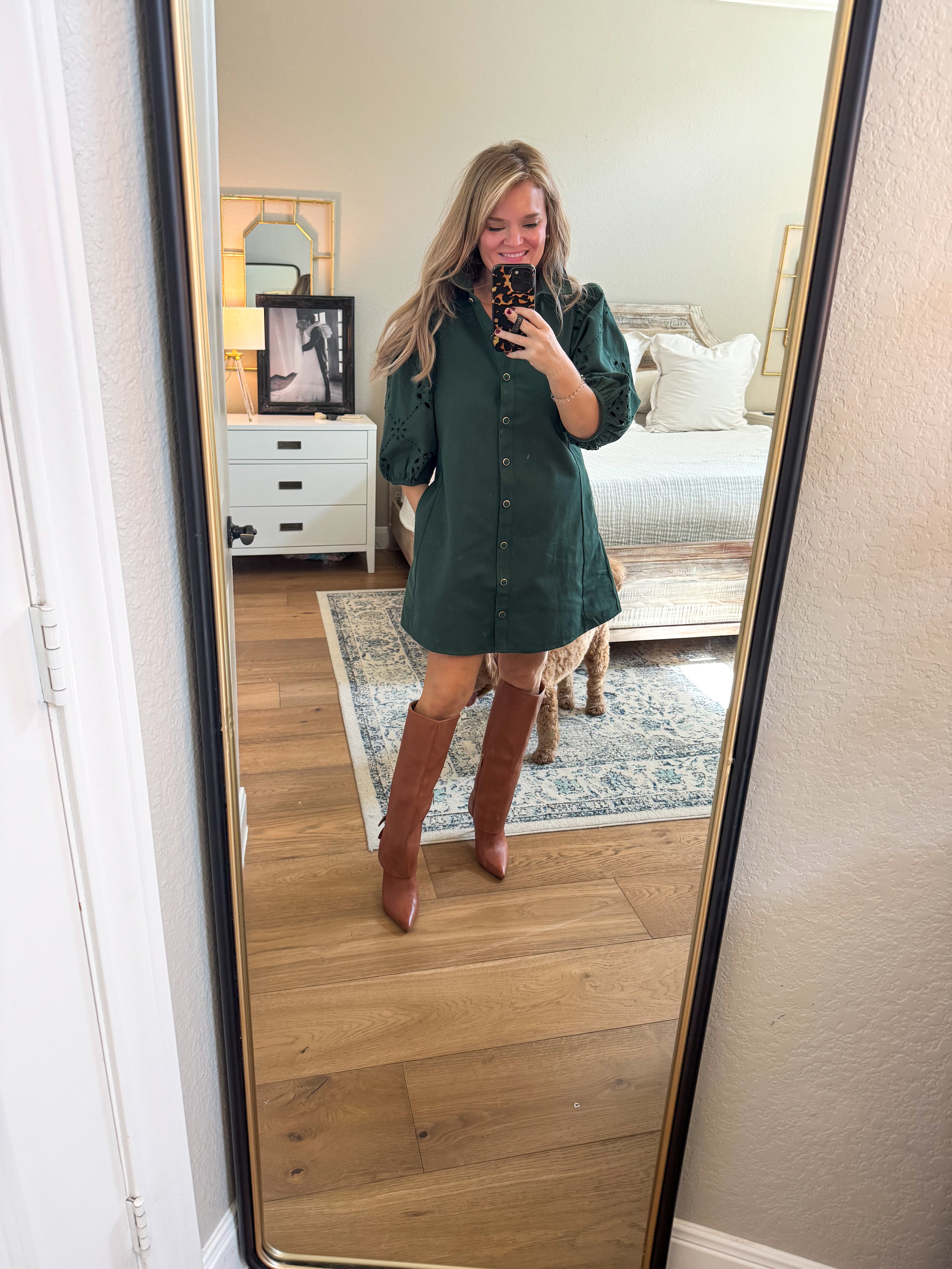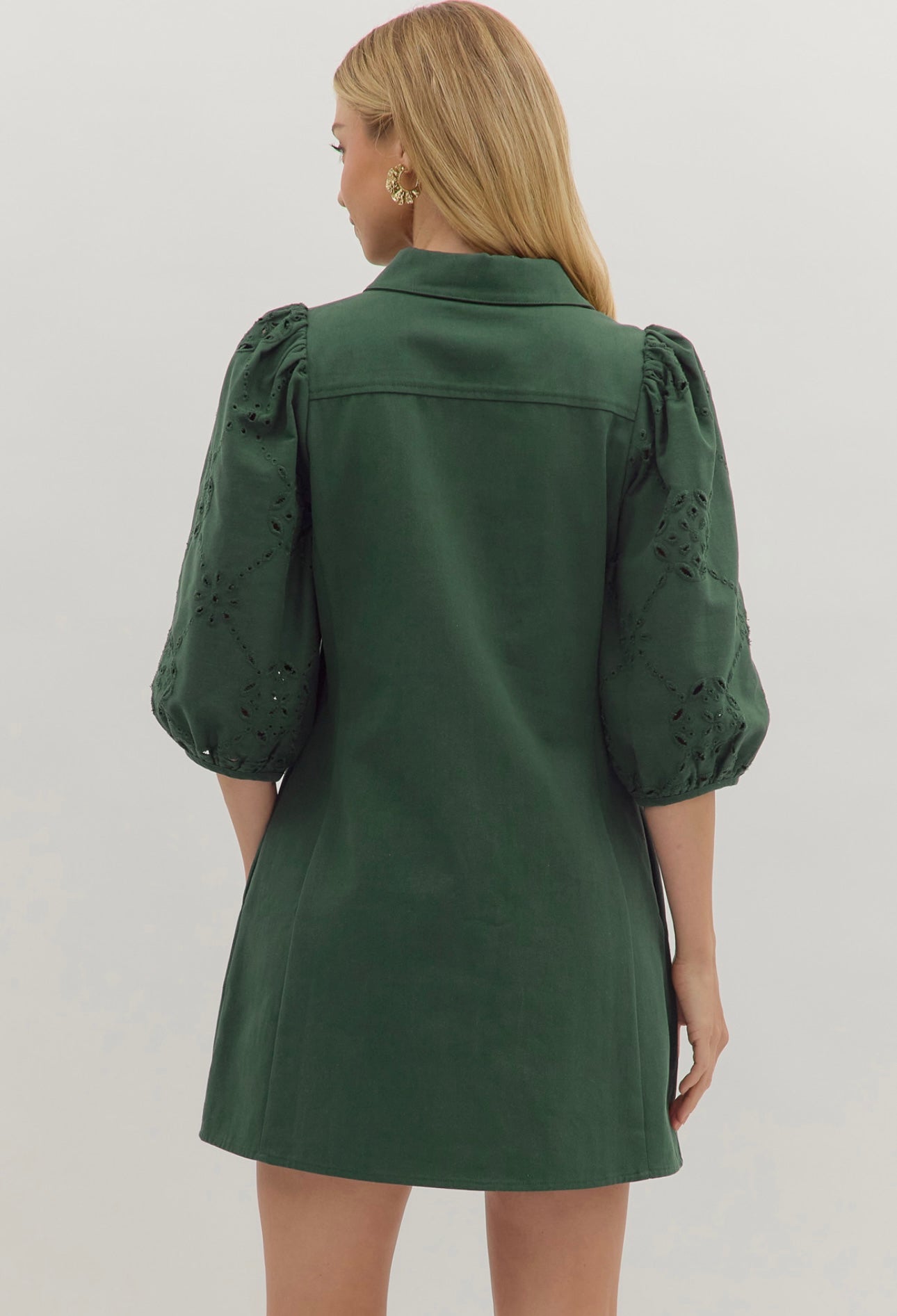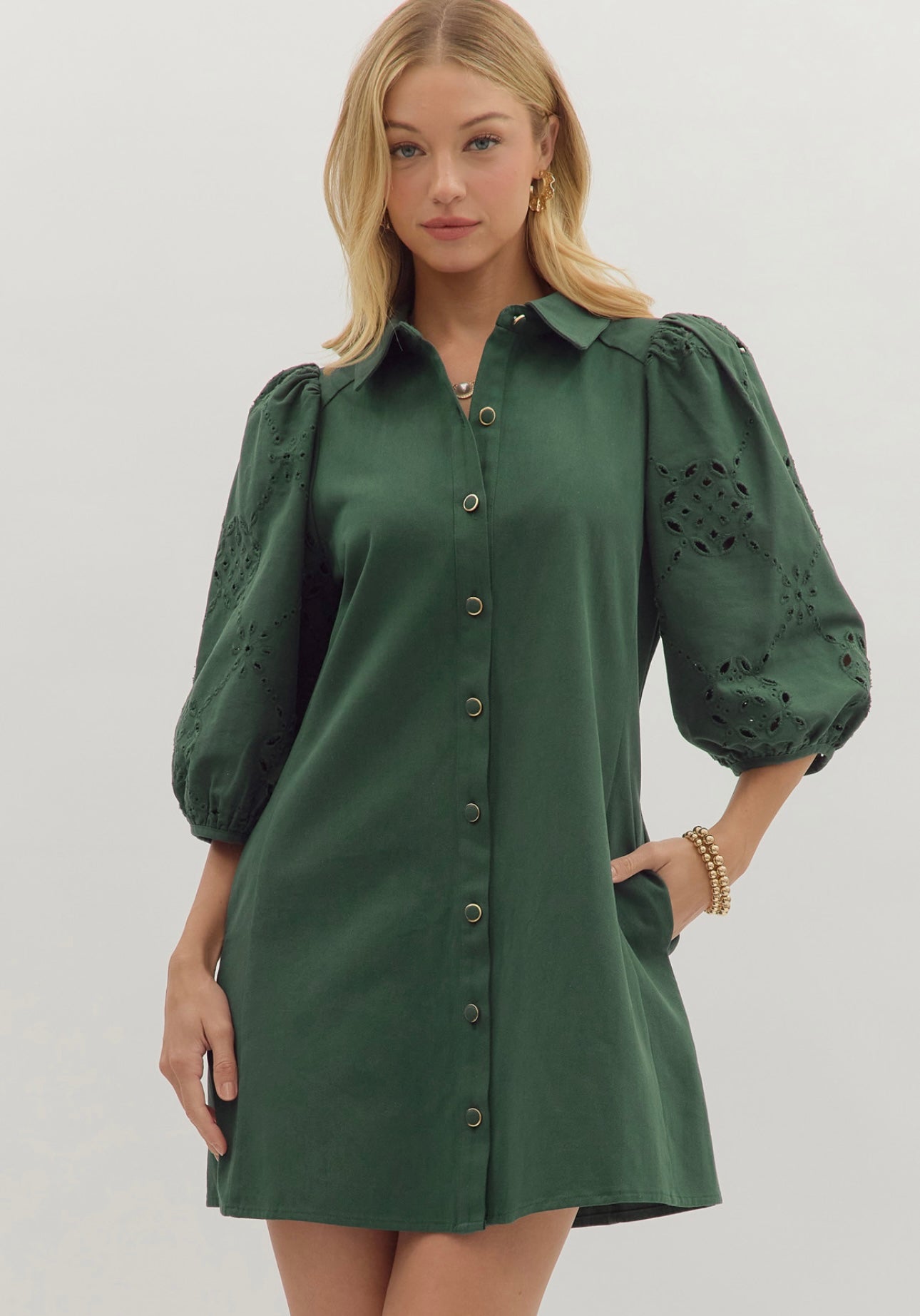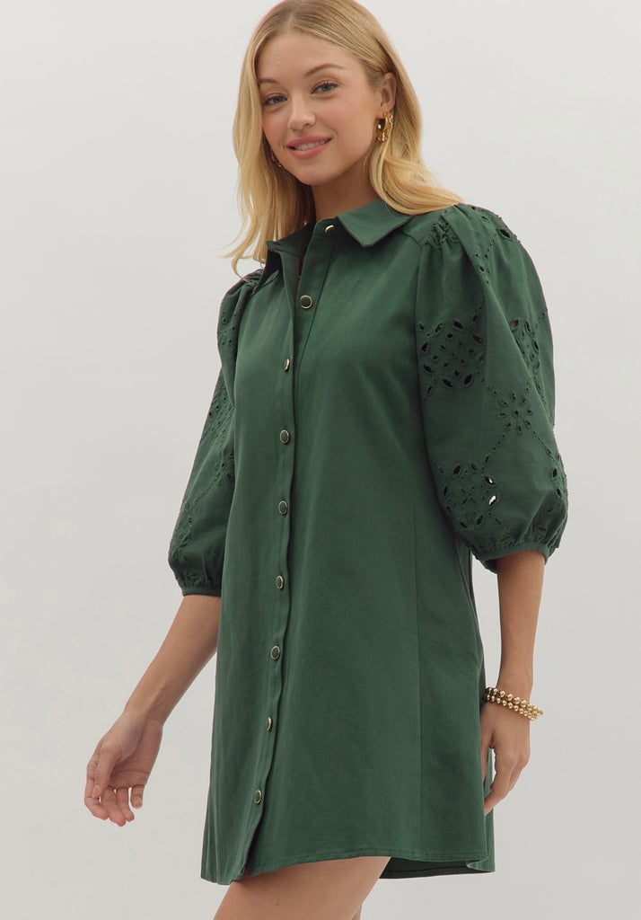 100% cotton solid eyelet ¾ puff sleeve dress featuring shirt collar and elasticated sleeve opening. Button closure at front, unlined, woven, non-sheer, lightweight. True to size, I am a 6/8 wearing a medium.