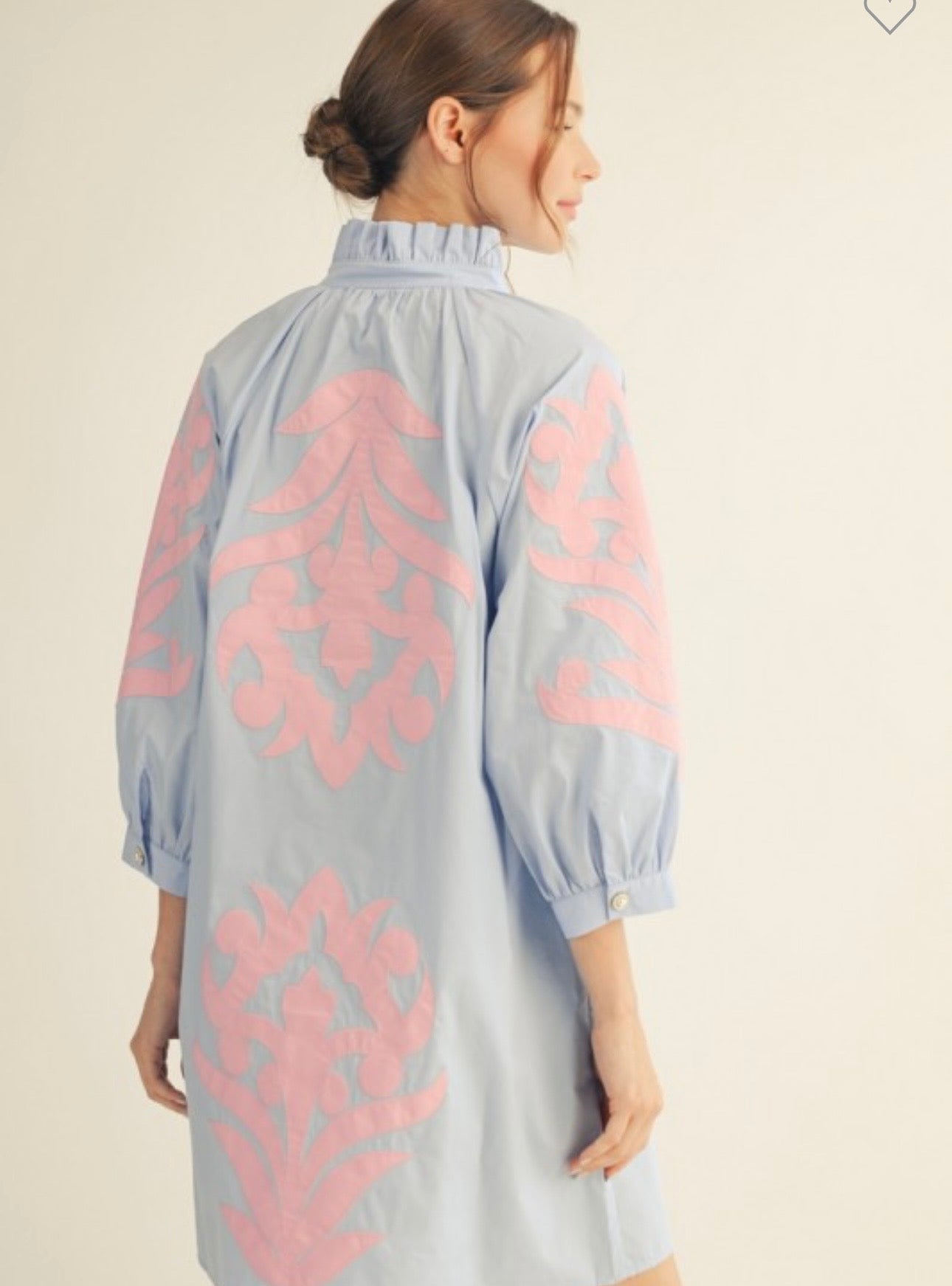 3/4 sleeves baroque floral applique shift dress with wide pockets, ruffled high neckline, front button up.100% cotton.