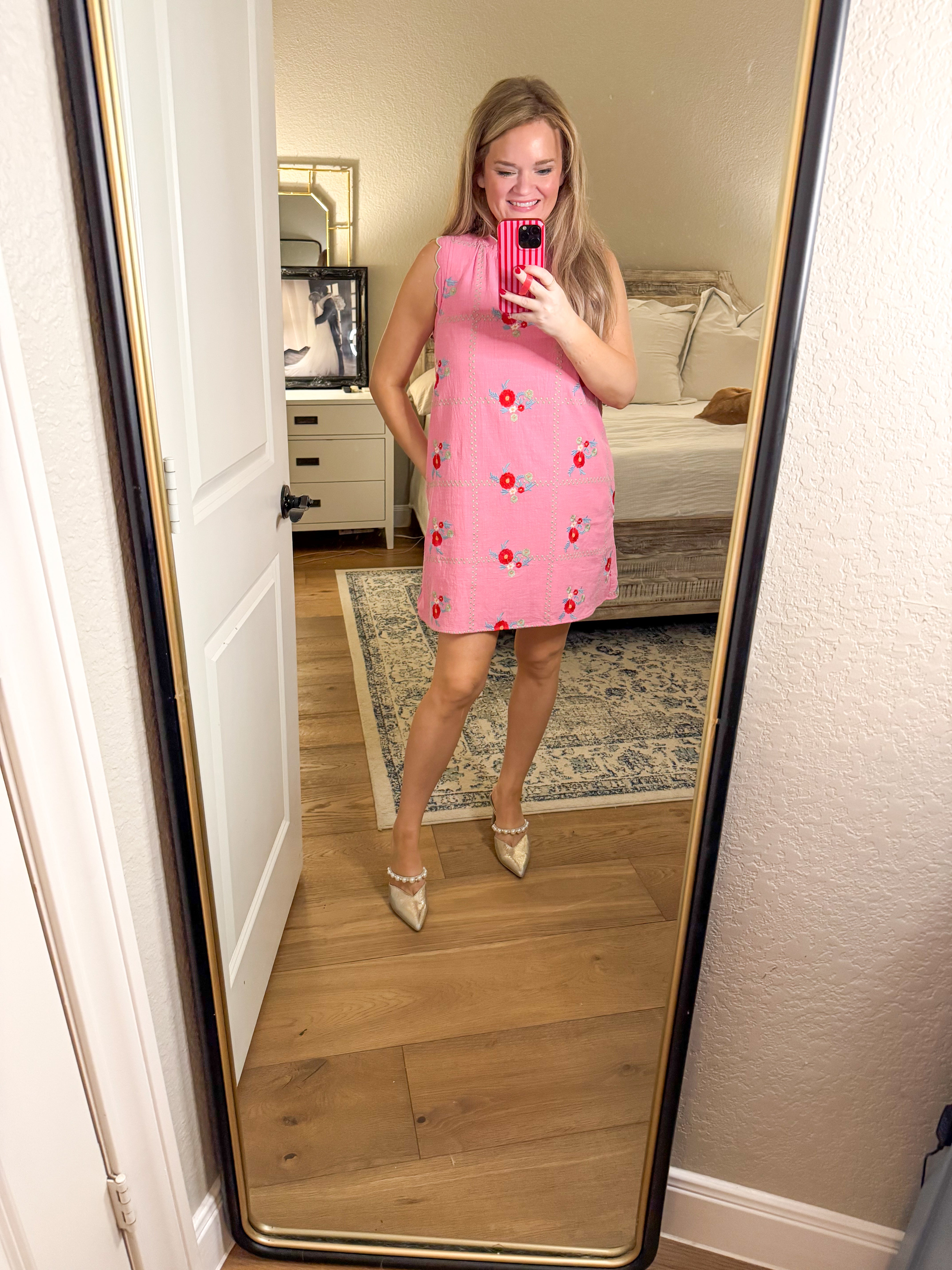 Floral embroidered sleeveless mini dress featuring scallop trim neckline and armholes. Button closure at back. Side pockets. Lined. Woven. Non-sheer. Lightweight. 100% cotton. True to size, I am a 6/8 wearing a medium.