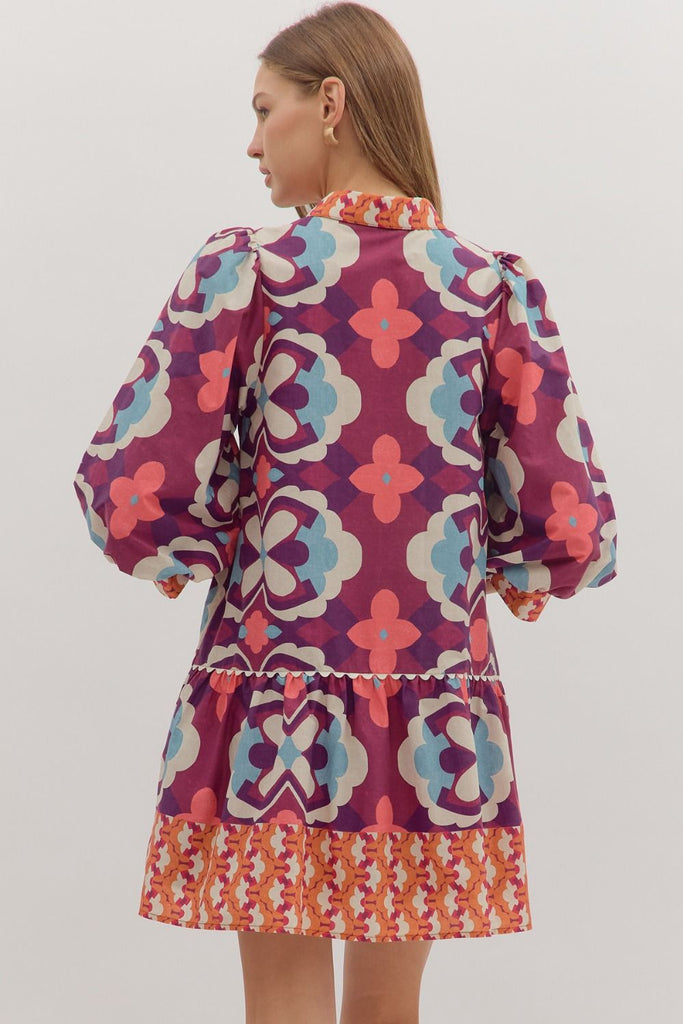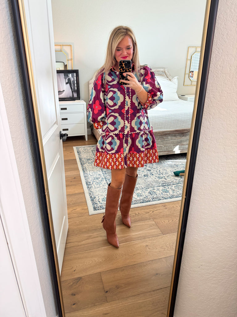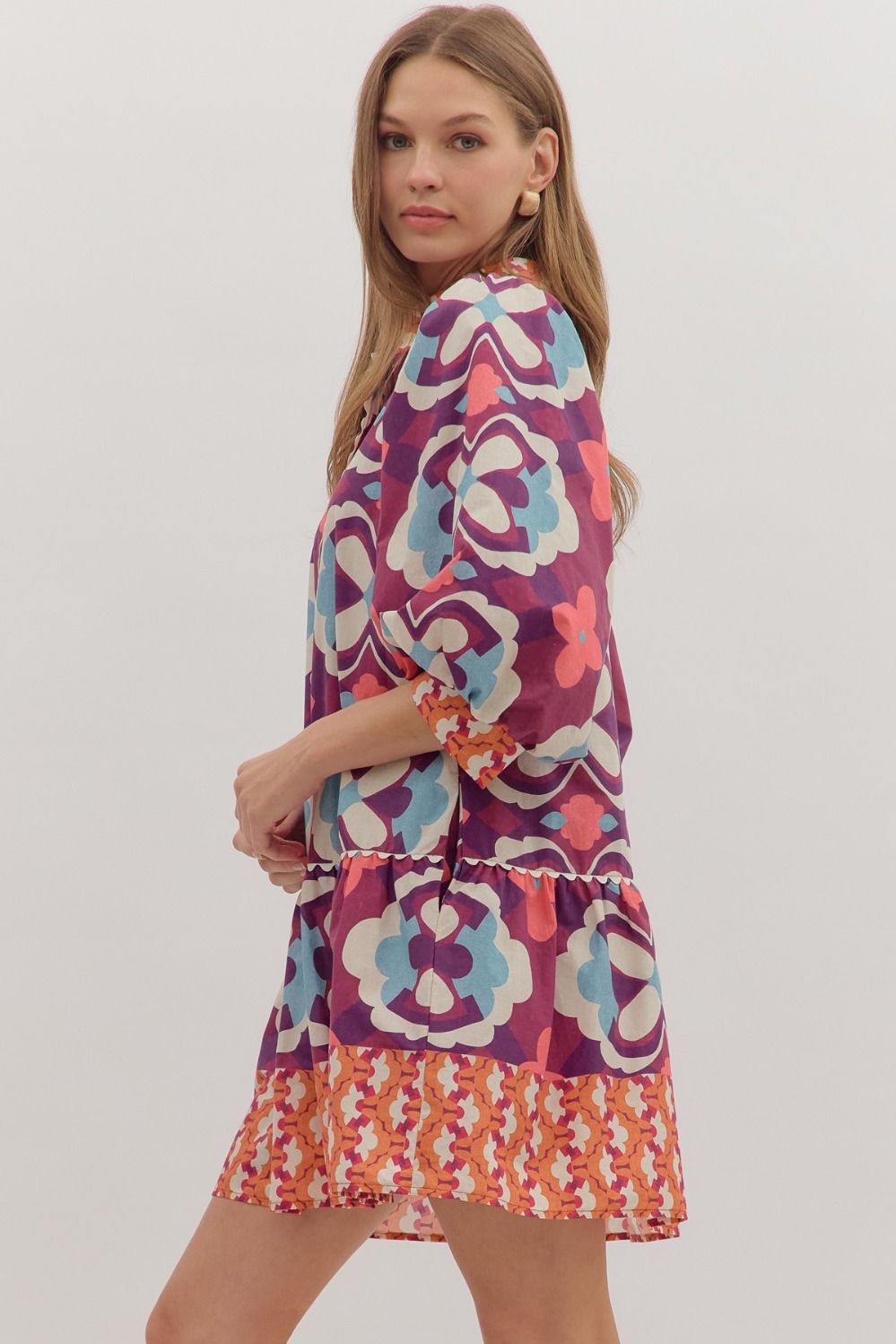100% cotton floral print puff ¾ sleeve dress featuring button closure at front. Contrast trim at collar, placket, sleeve cuffs, and hem. Side pockets, lined, woven, non-sheer, lightweight. True to size, I am a 6/8 wearing a small.