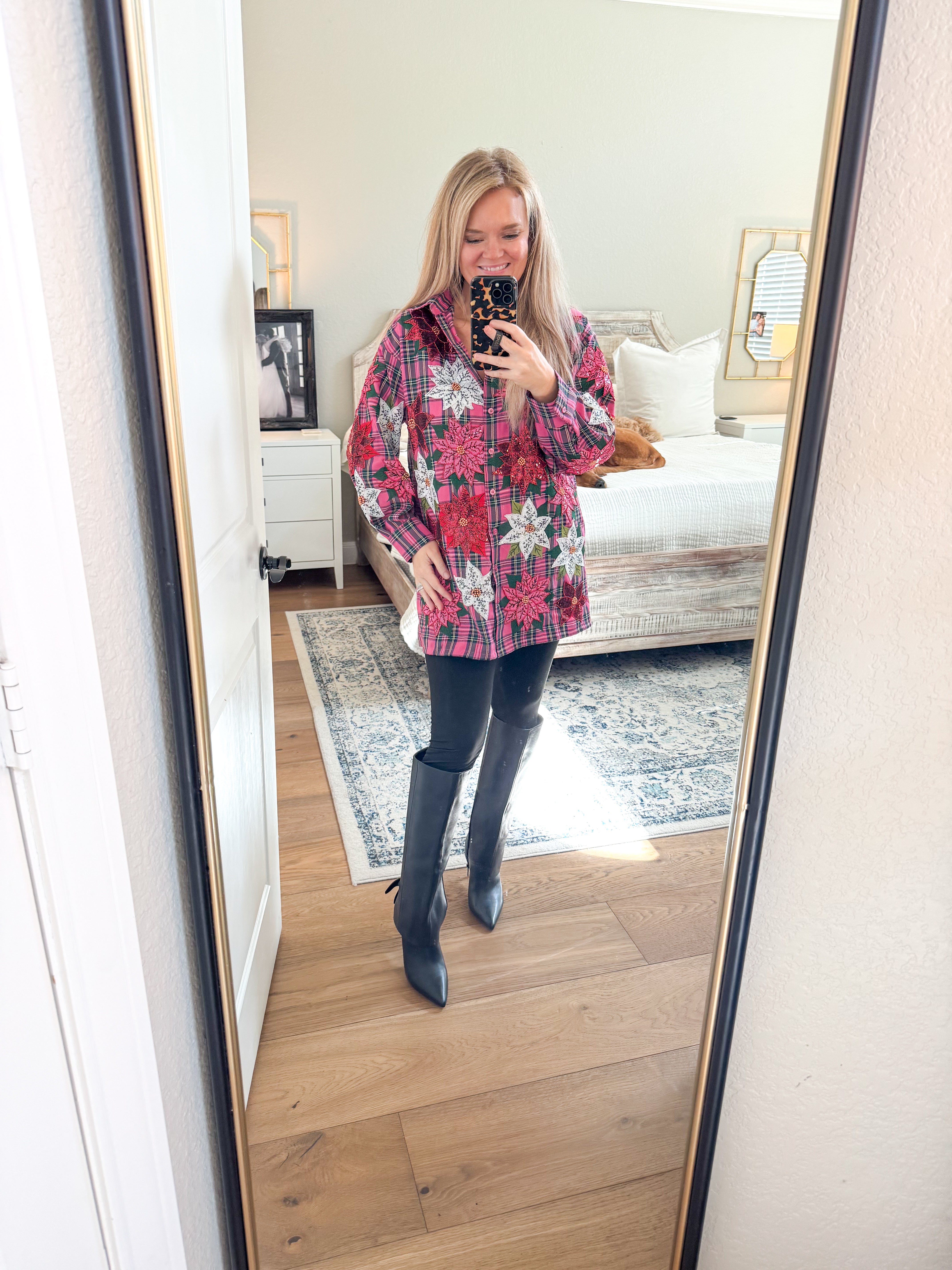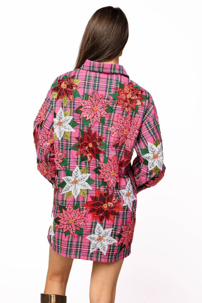 True to size, I am a 6/8 wearing a small. Pink plaid button up dress with front and back poinsettias.