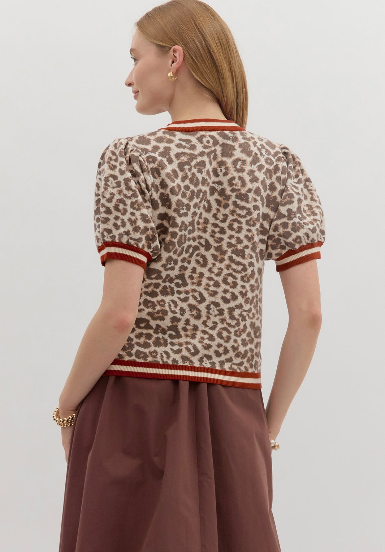 Short puffed sleeve leopard print super soft sweater with striped border. True to size, I am a 6/8 wearing a medium. 50% viscose, 30% polyester, 20% nylon.