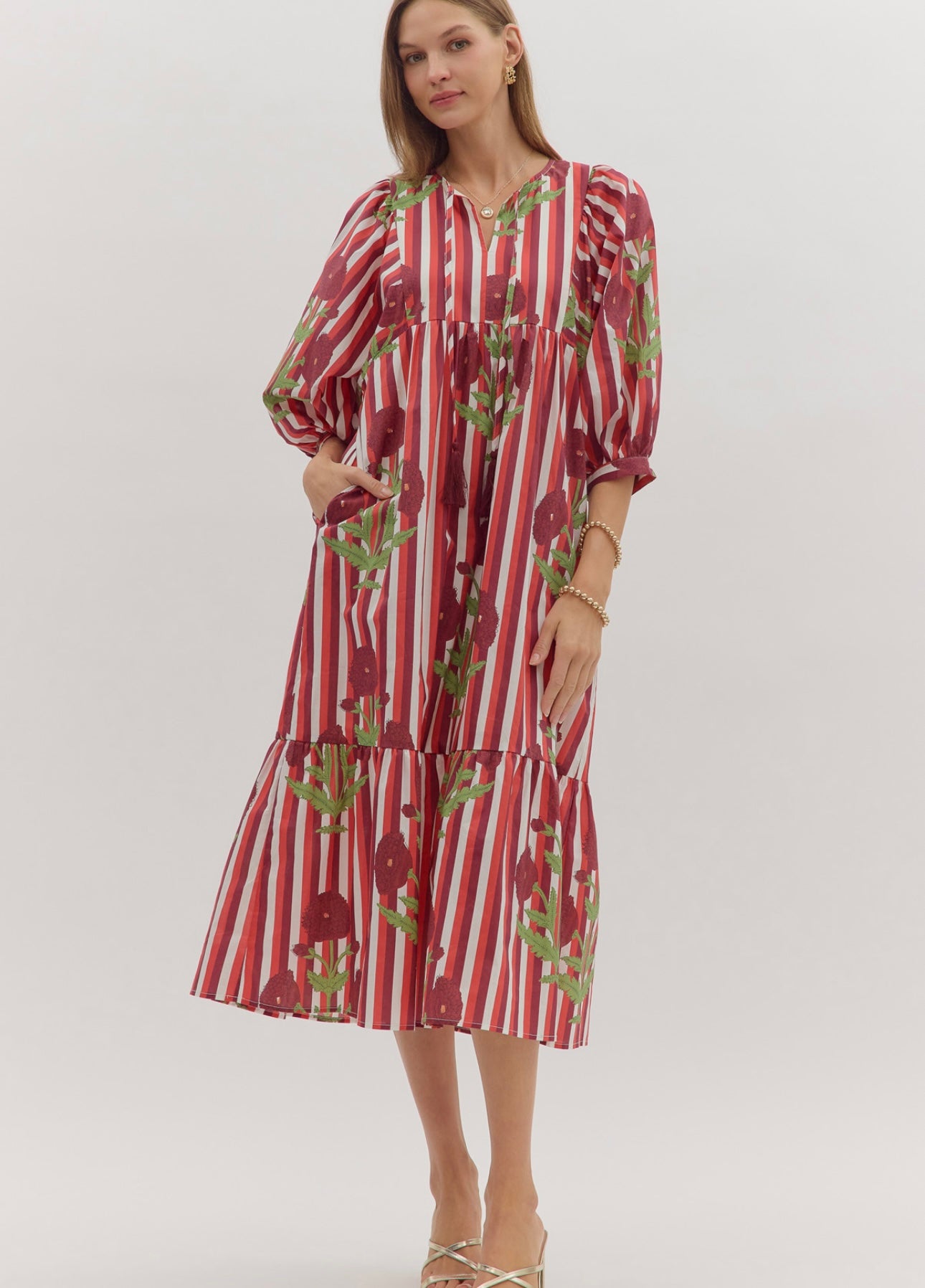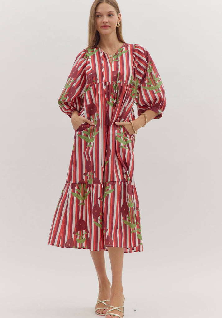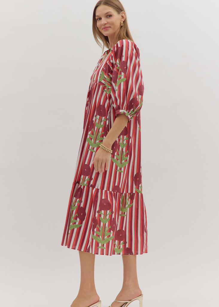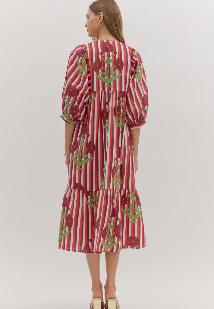 Red & Maroon Striped Floral Dress