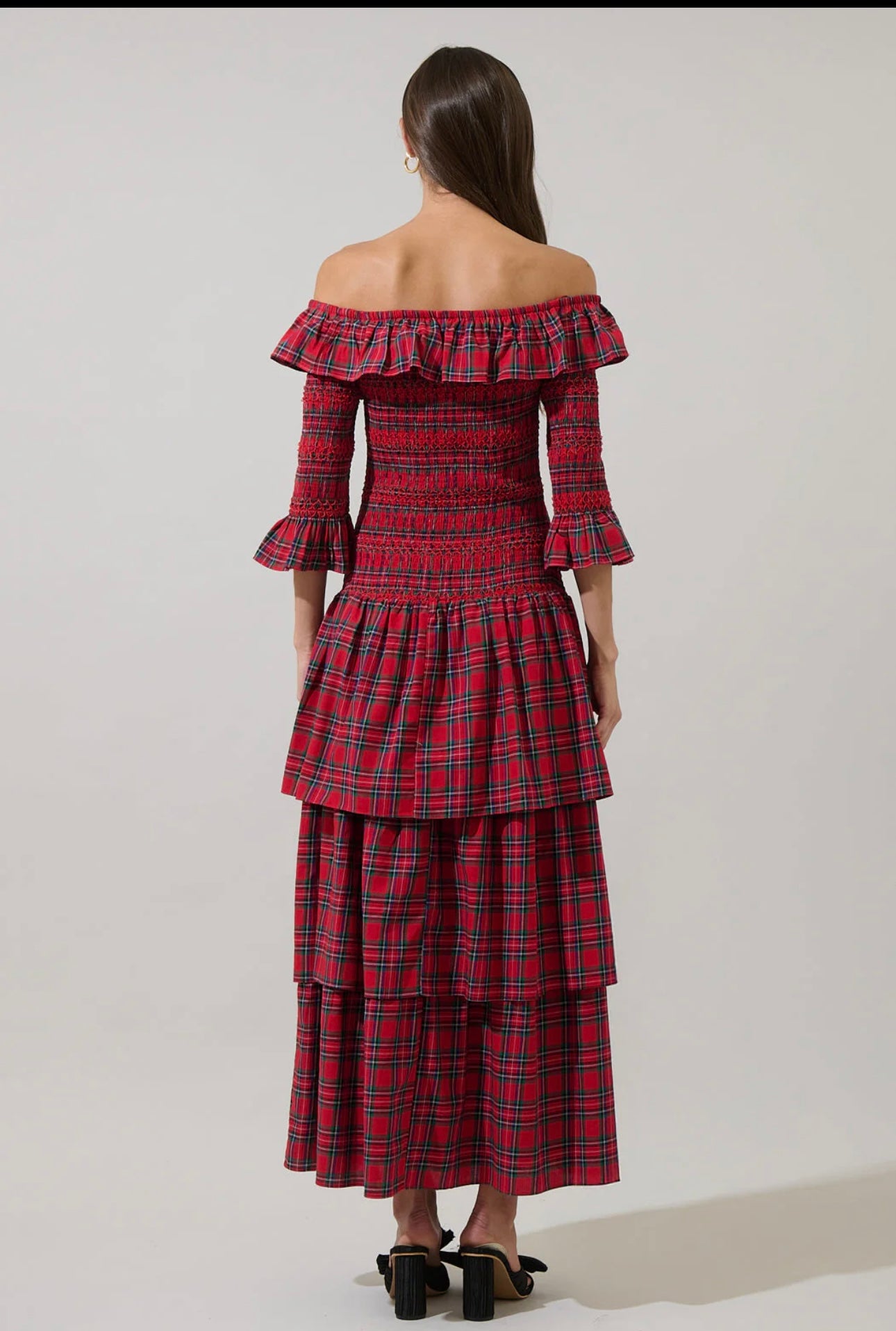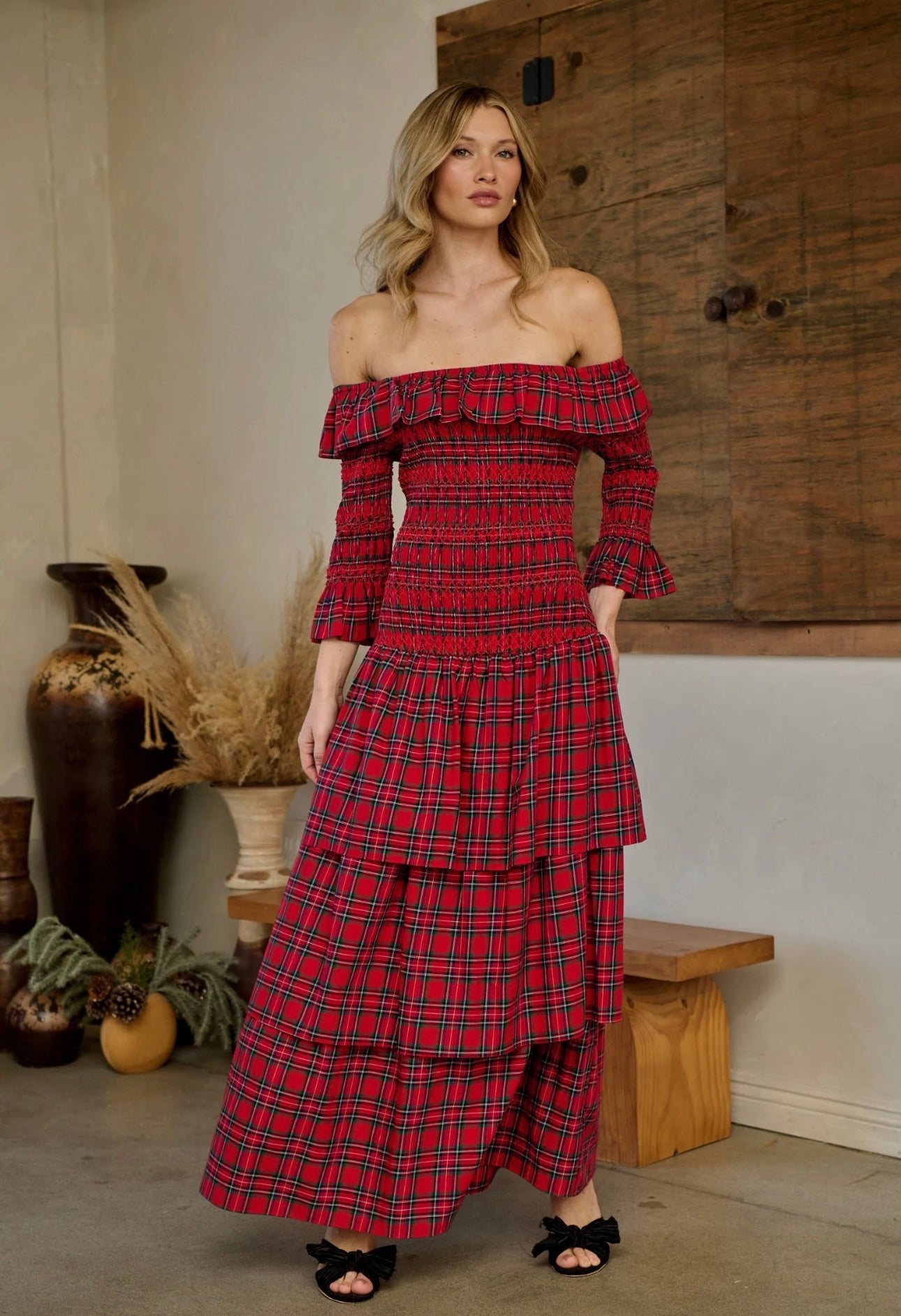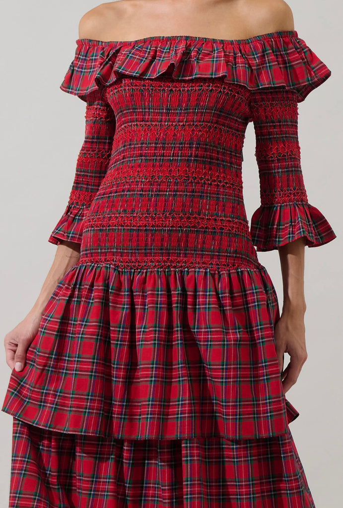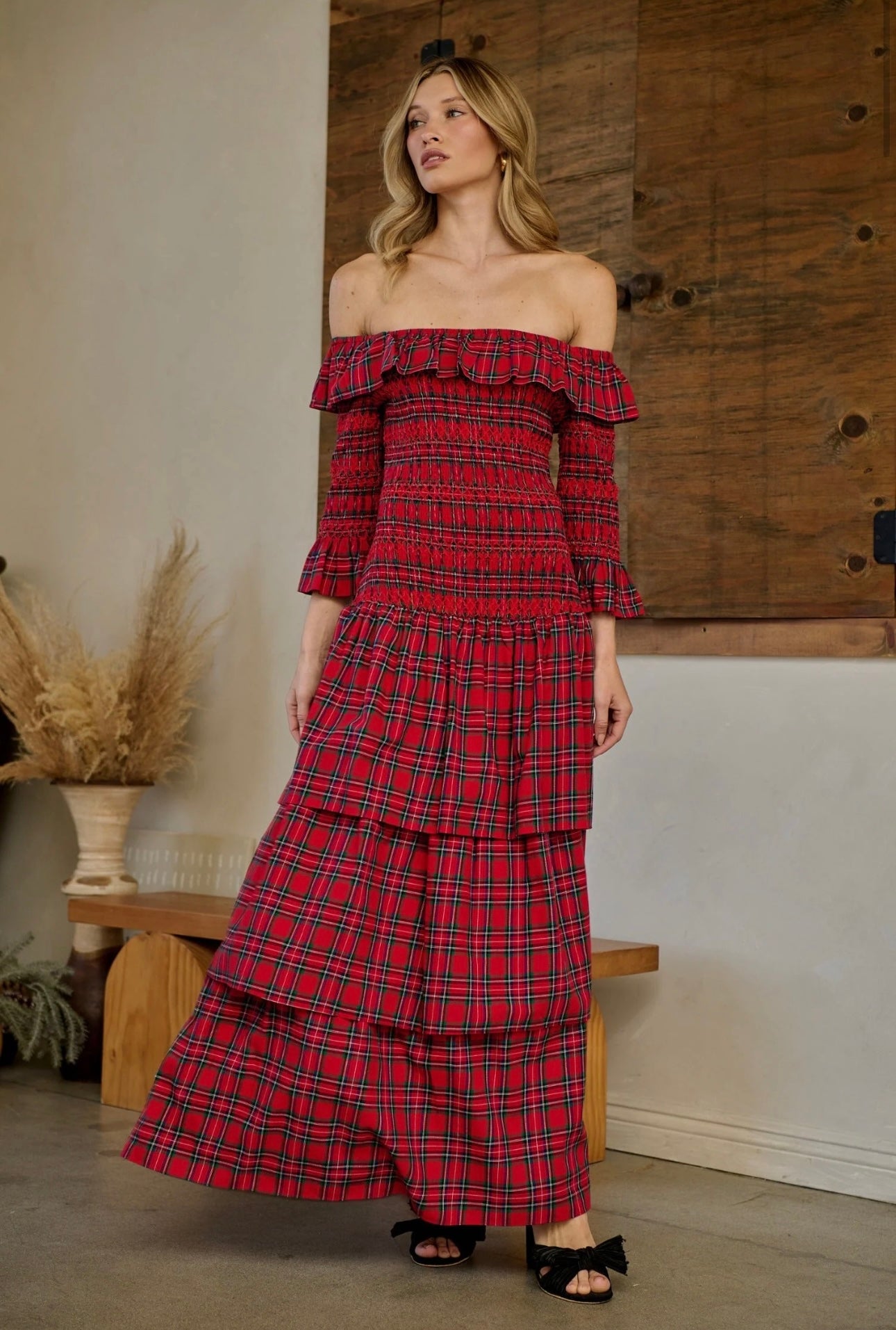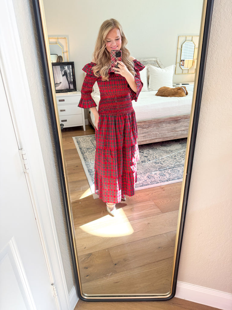 True to size, I am a 6/8 wearing a medium. 100% polyester off the shoulder smocked maxi plaid dress. Length 50 ¾”. Lined.
