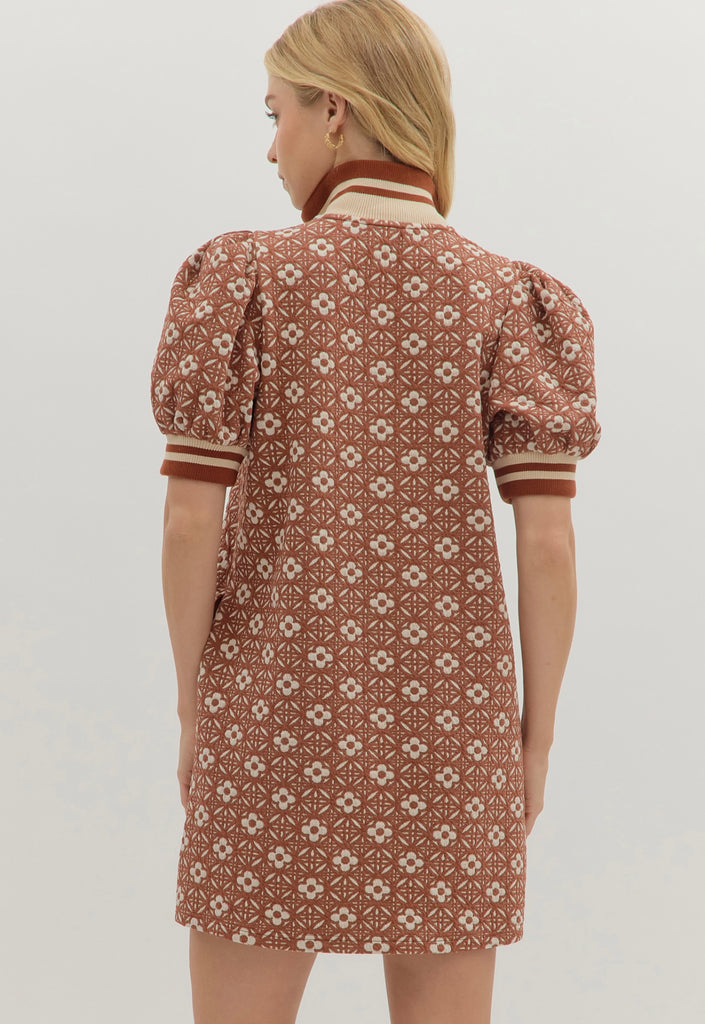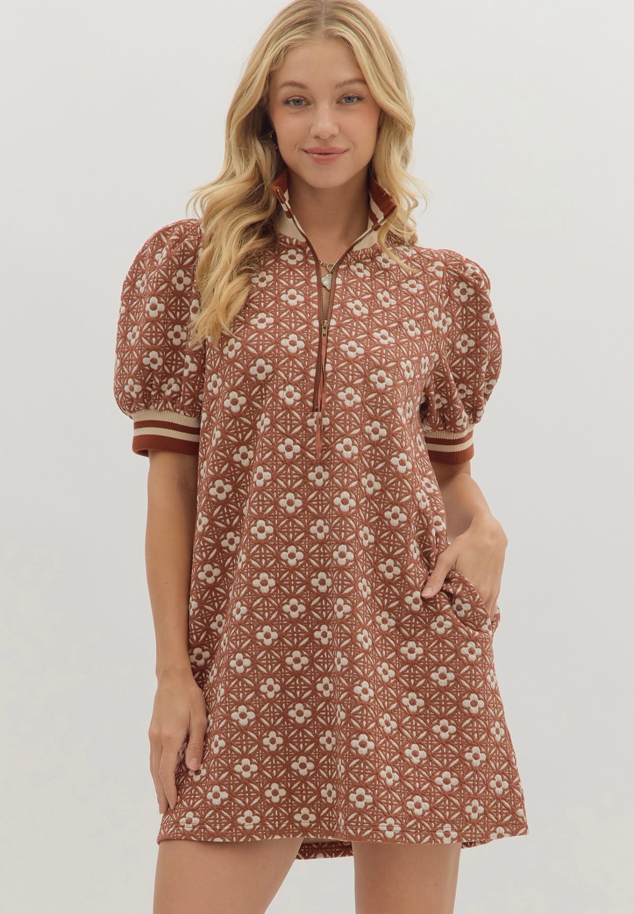 Floral textured short puff sleeve dress featuring half zip closure at front. Ribbed collar and cuffs, side pockets, unlined, knit, non-sheer, medium weight. 62% polyester, 30% rayon, 5% cotton, 3% spandex. True to size, I am a 6 wearing a medium.