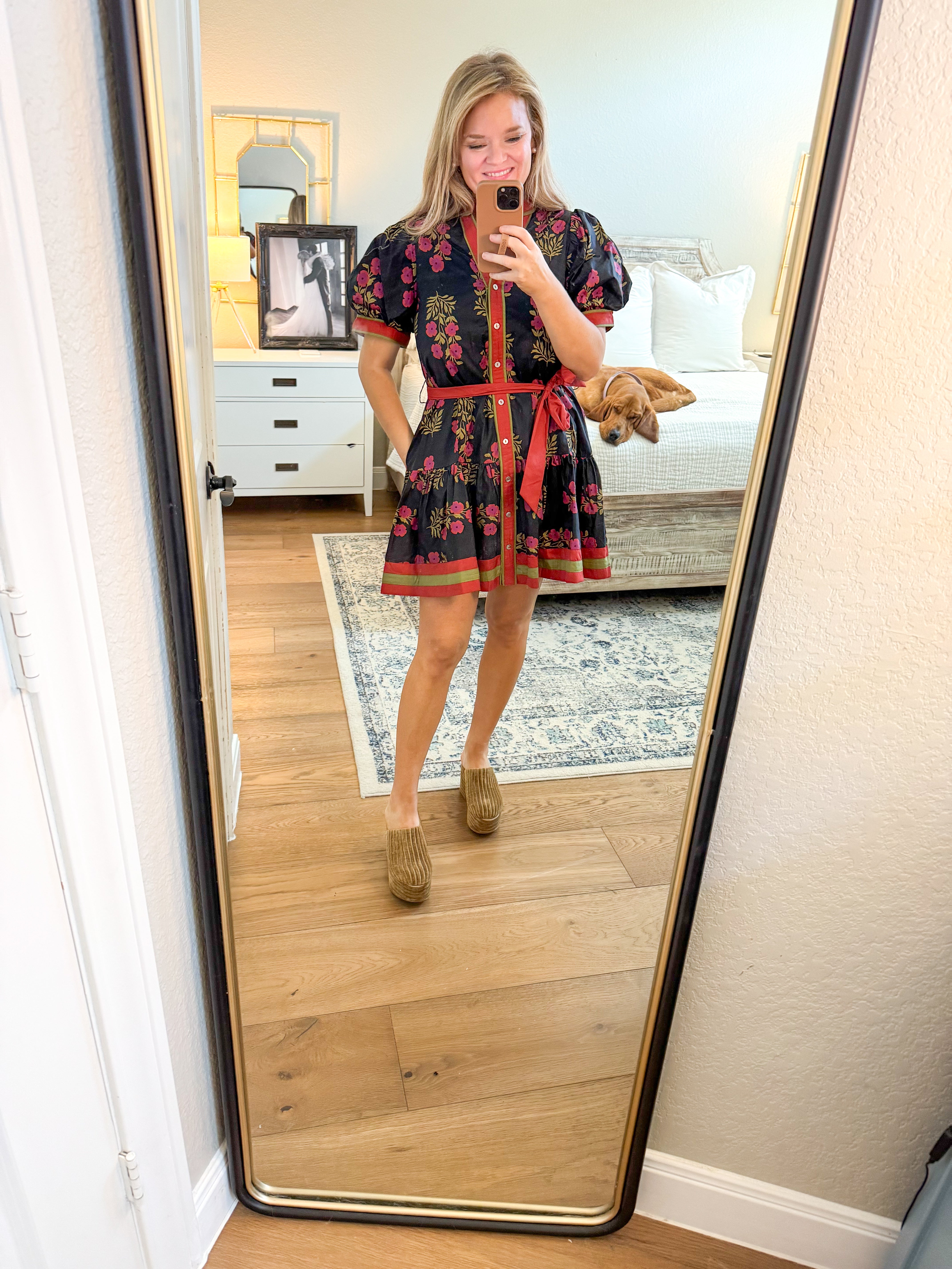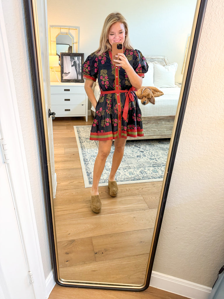 True to size, I am a 6 a medium. Floral pattern short puff sleeve ruffle hem dress featuring multicolor accent band detail. V-neck band collar button closure. Removable belt. Side pockets, lined, woven, non-sheer, lightweight. 100% cotton.