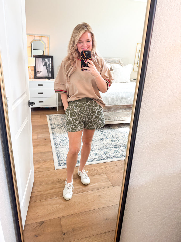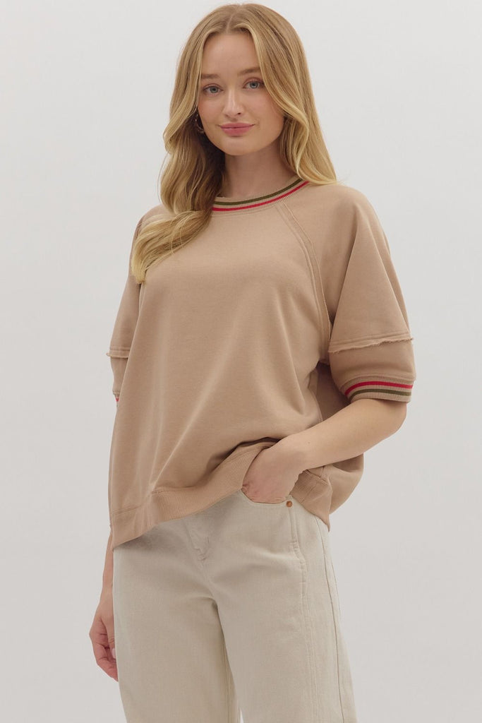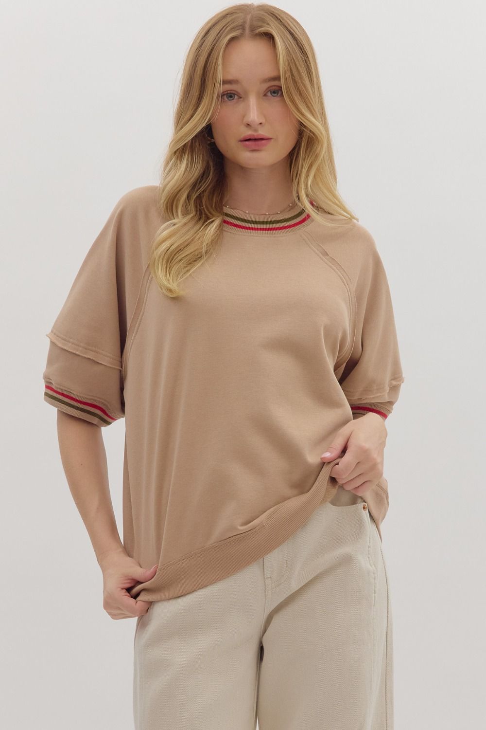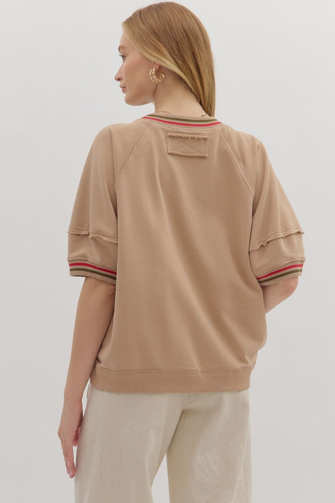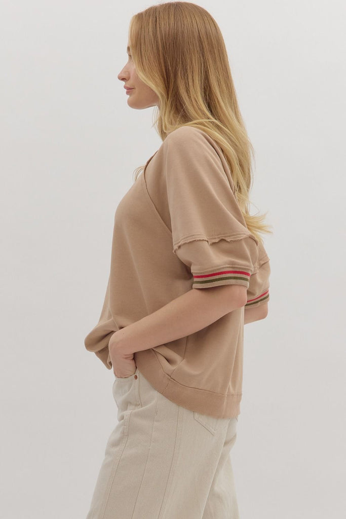 100% cotton solid elbow-length raglan sleeve pullover knit top featuring multicolor band accent. Unlined, knit, non-sheer, lightweight. Runs large, I am a 6/8 wearing a medium.