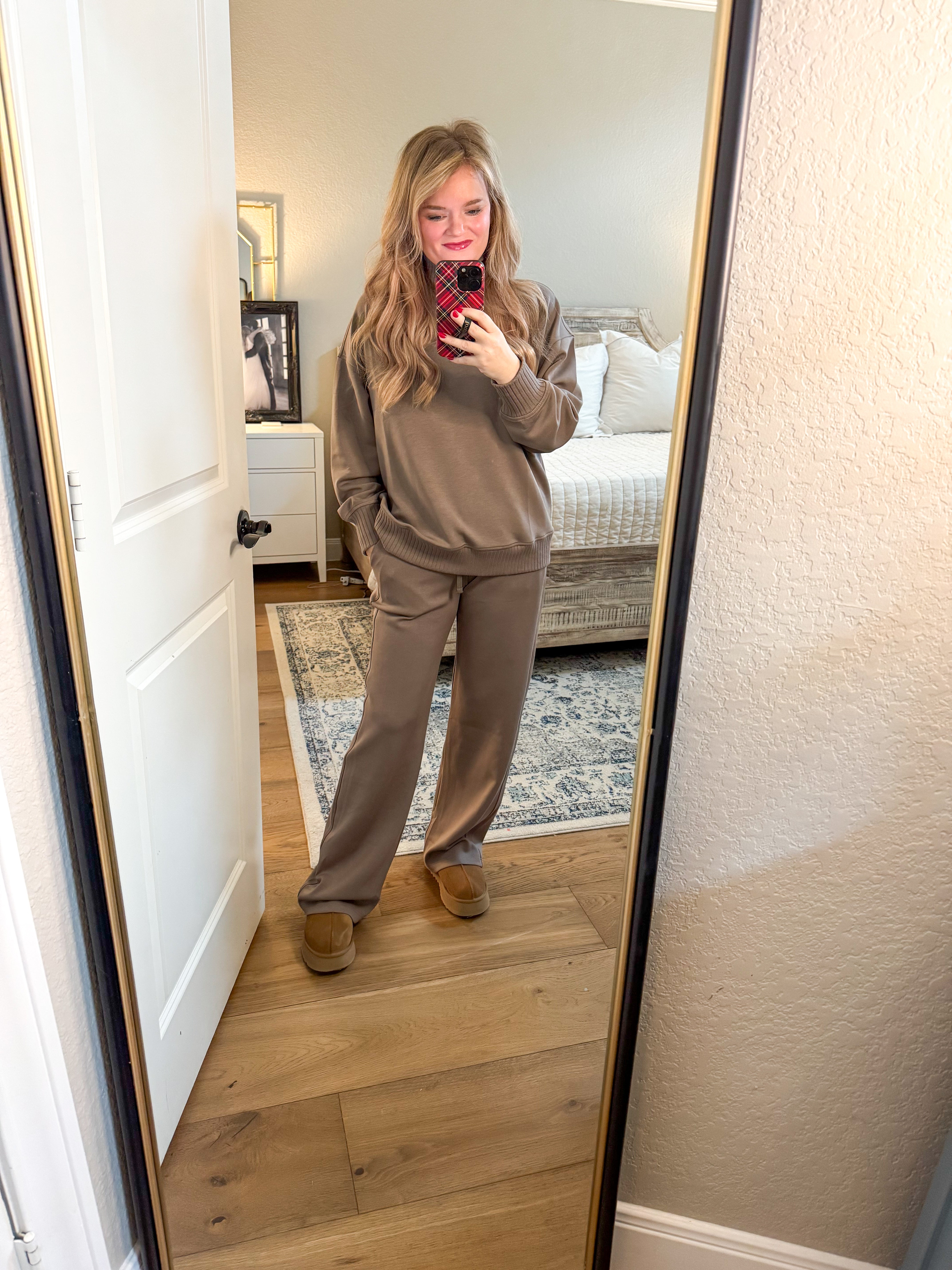 Modal scuba ribbed mock neck pullover. Matching pants sold separately. I am a 6/8 wearing a small.