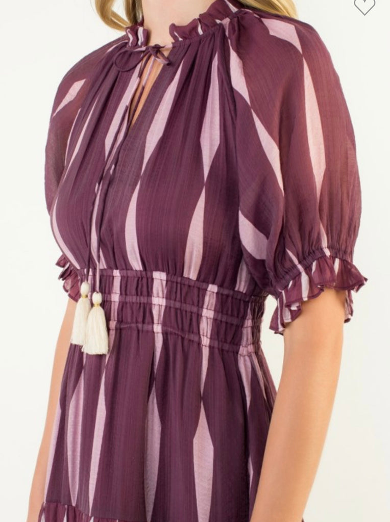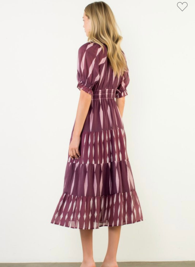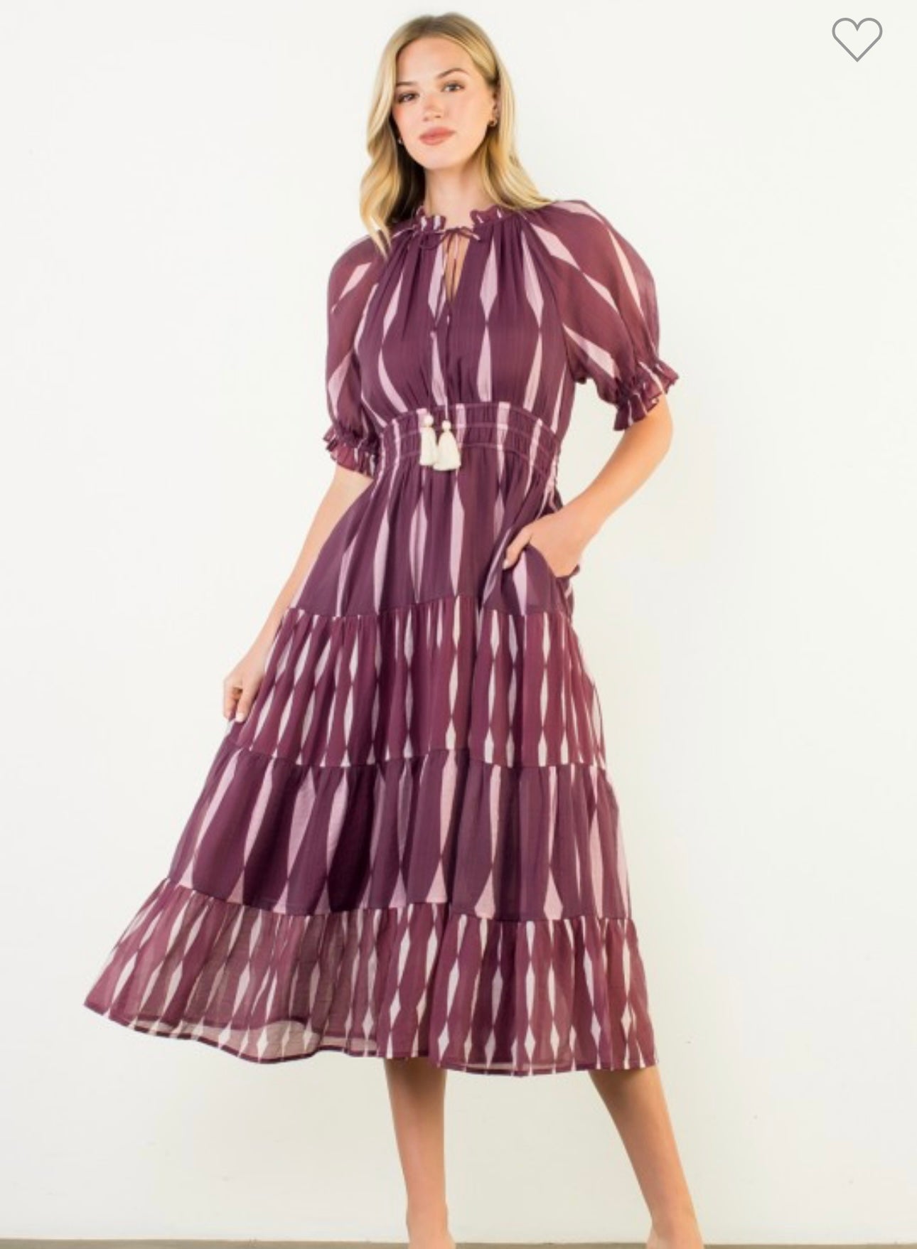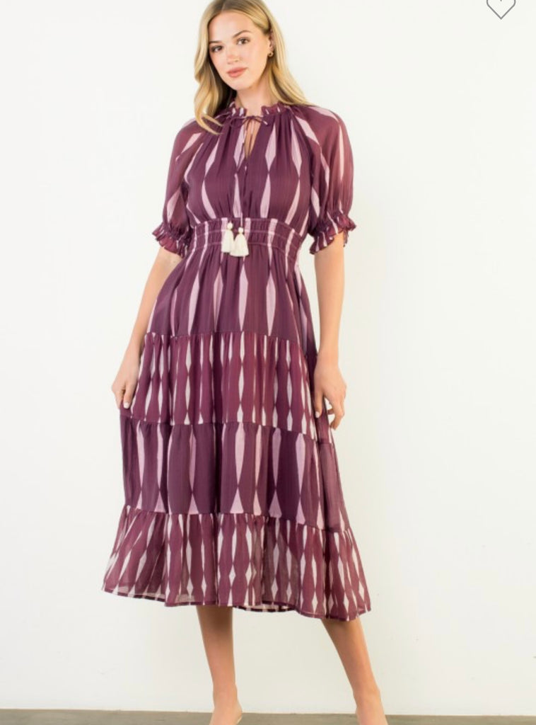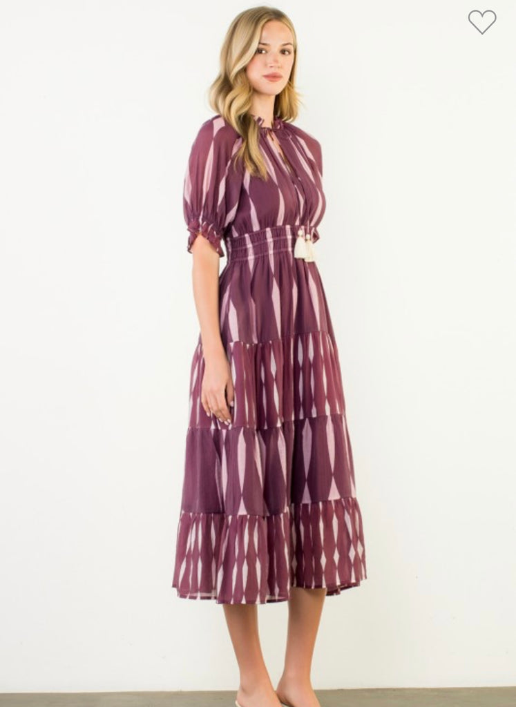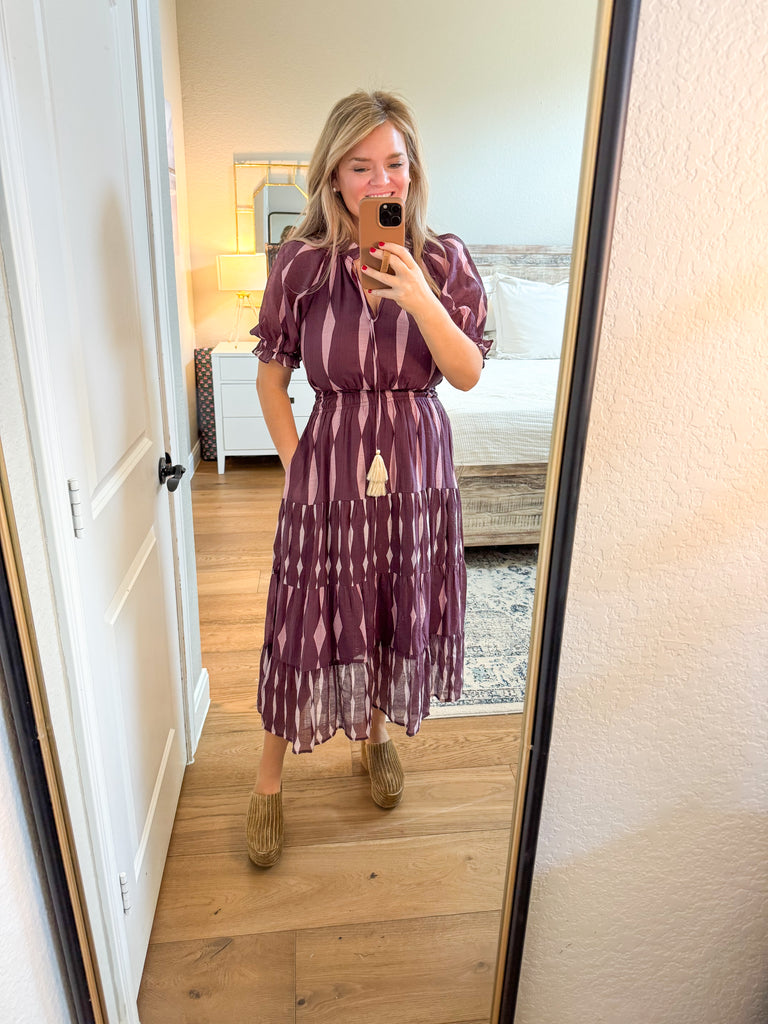 70% viscose, 30% nylon. True to size, am a 6/8 wearing a small. Short sleeved smocked midi dress. True to size, I am a 6 wearing a medium.