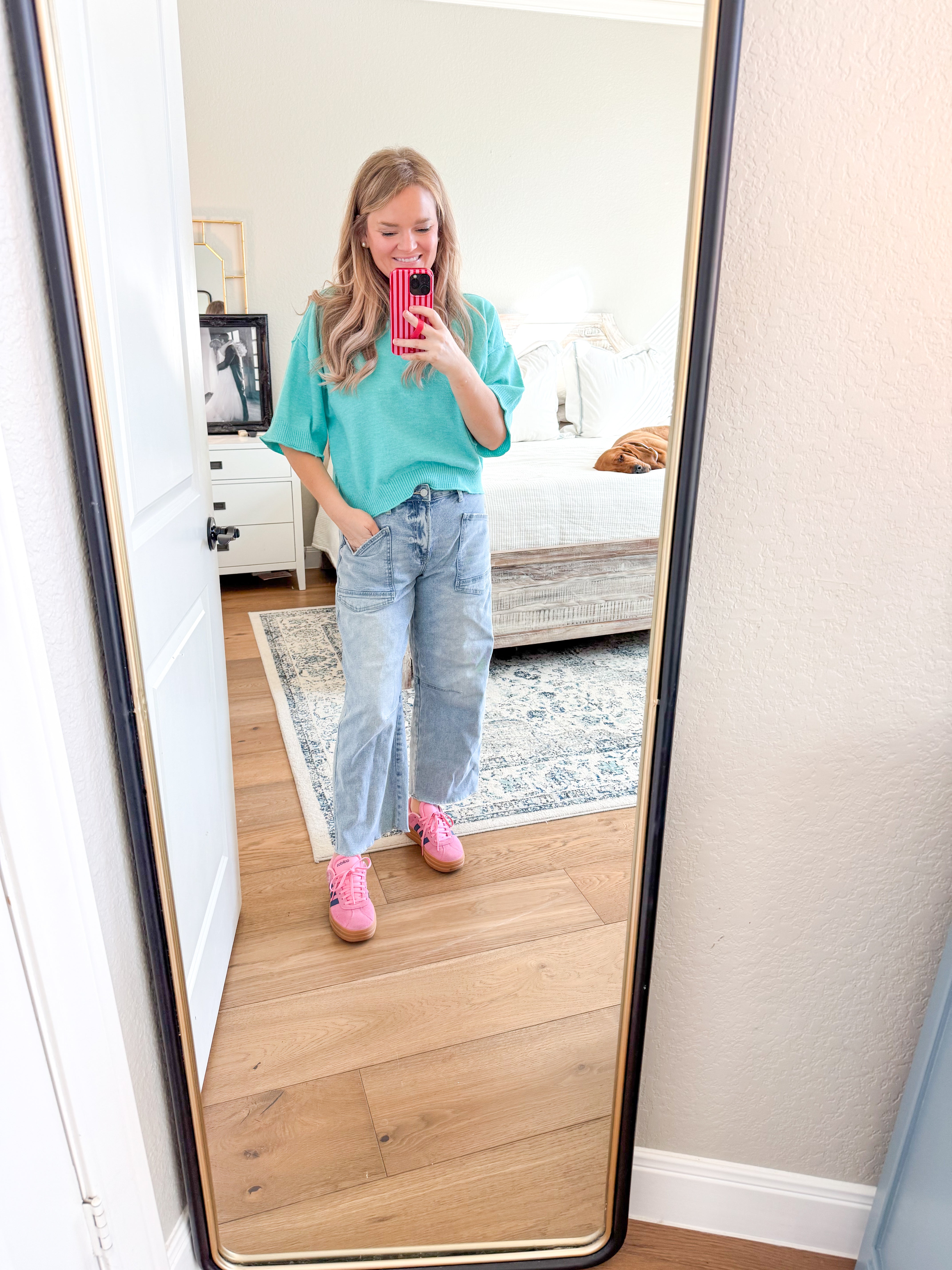 Solid sweater knit ¾ wide sleeve pullover. Unlined. Knit. Non-sheer. Lightweight.. I am a 6/8 wearing a small. 45%ACRYLIC 28%NYLON 27%POLYESTER