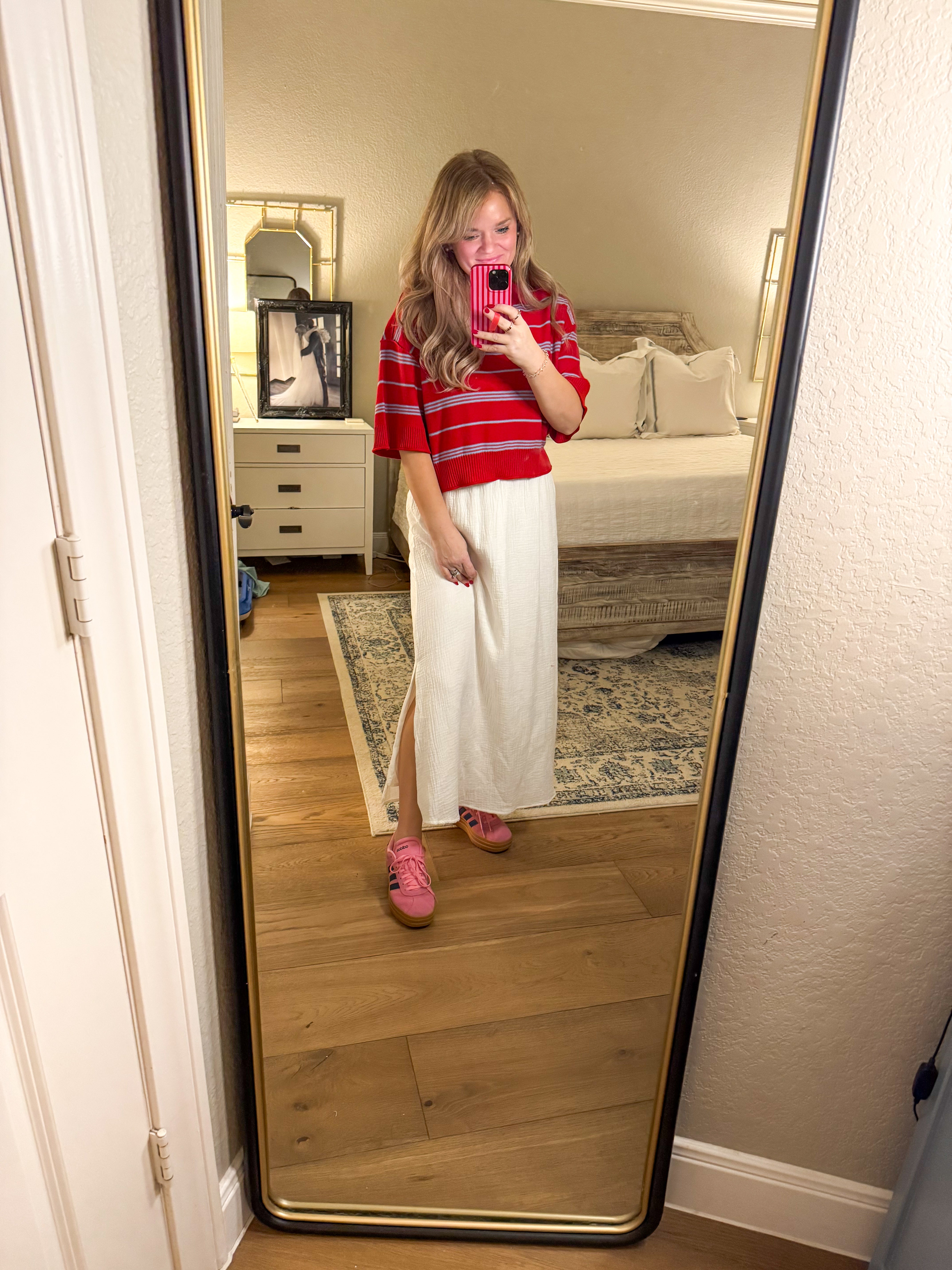True to size, I am a 6/8 wearing a medium. 100% cotton gauze midi skirt with elastic waistband and side slit. Lined.