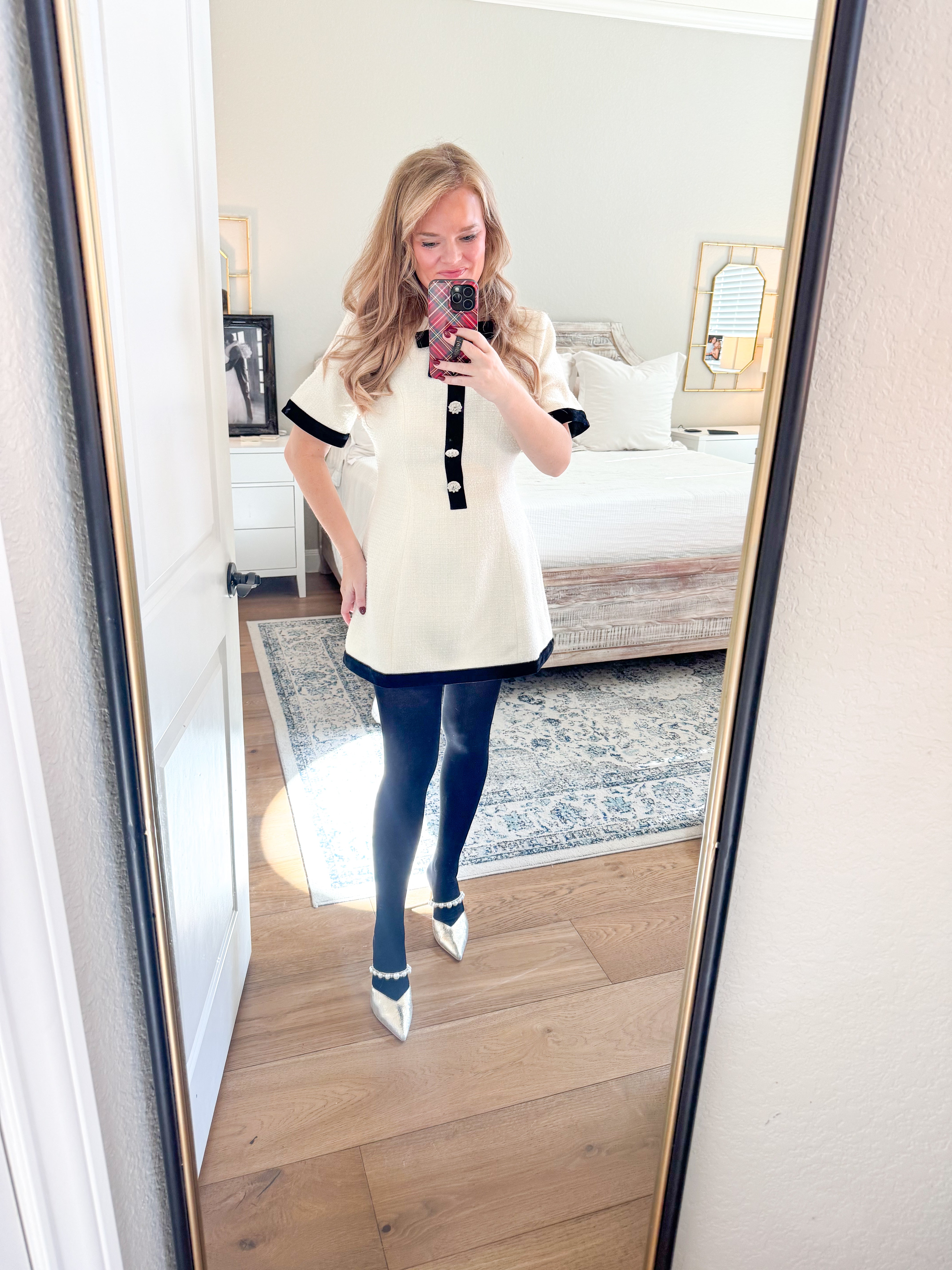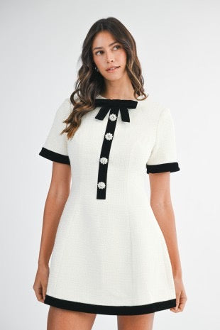 Tweed short sleeve contrast trim bow dress with non-functional button detail. Back invisible zipper, lined. True to size, I am a 6/8 wearing a medium.