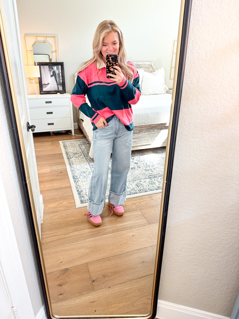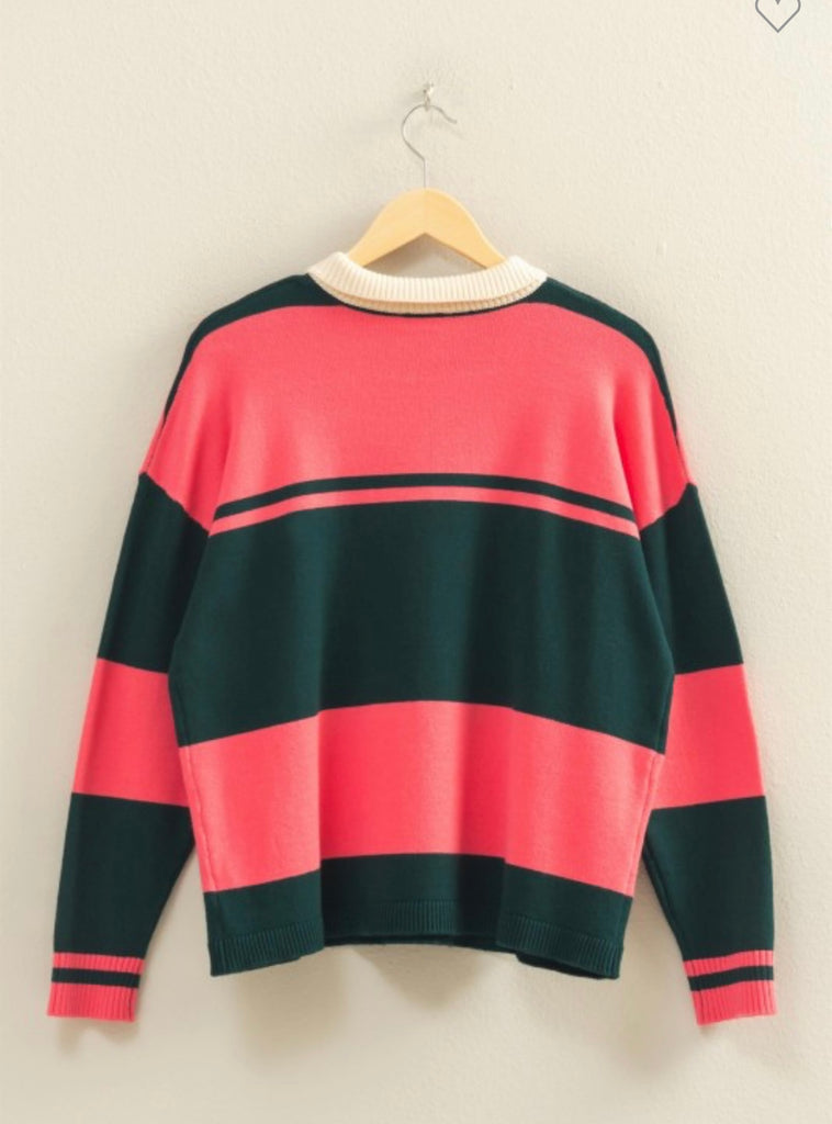 Contrasting striped sweater with polo collar. 50% rayon, 28% polyester, 22% nylon. True to size, I am a 6/8 wearing a medium.